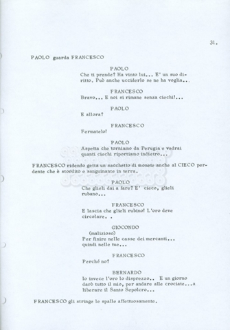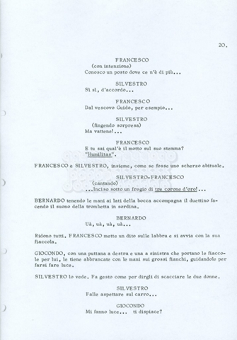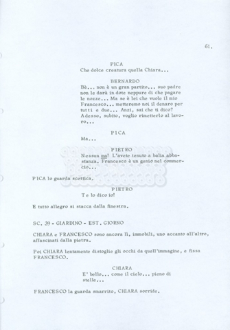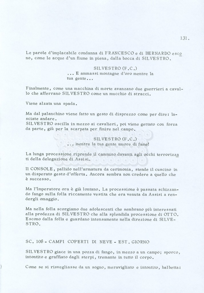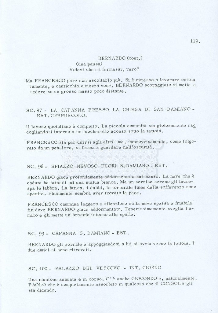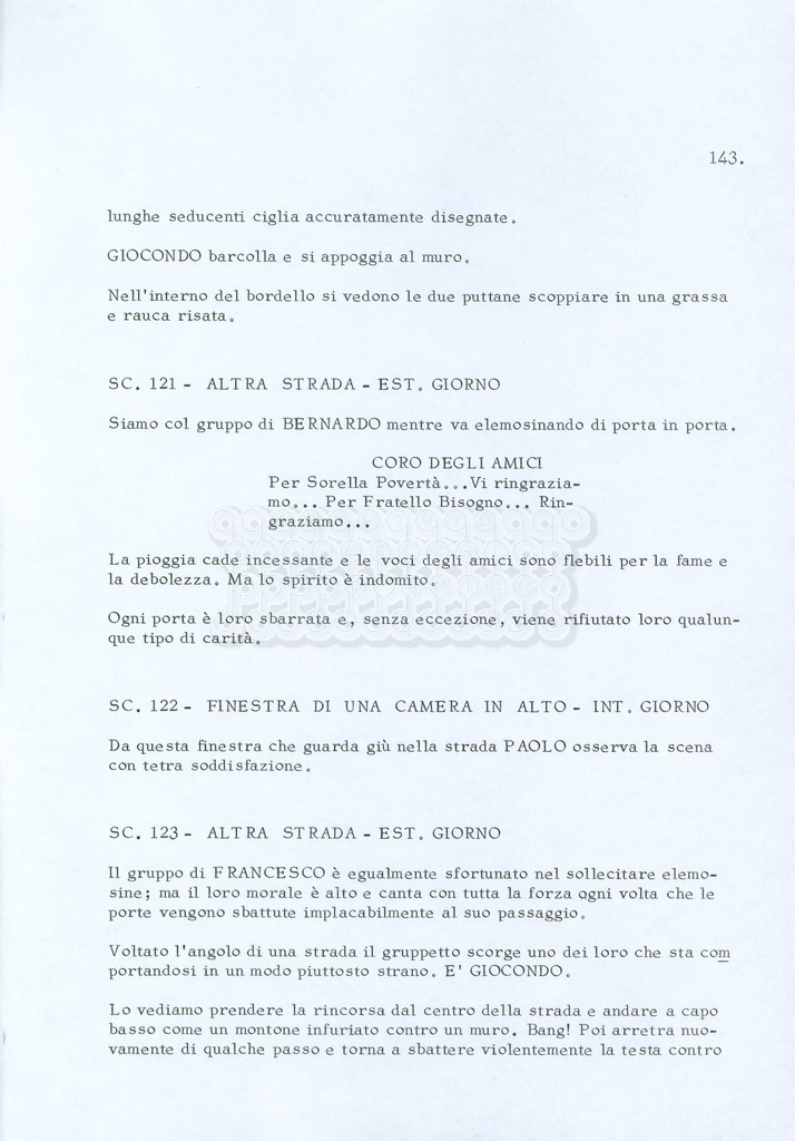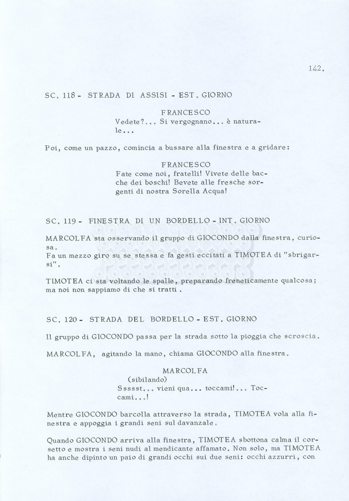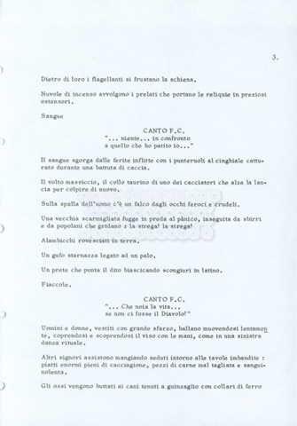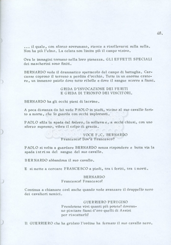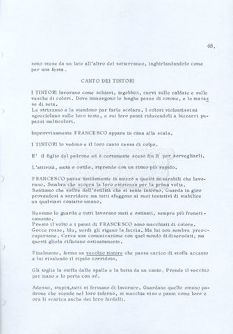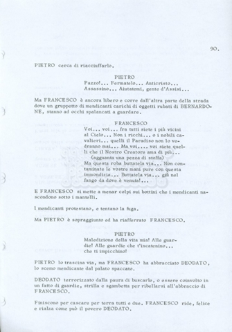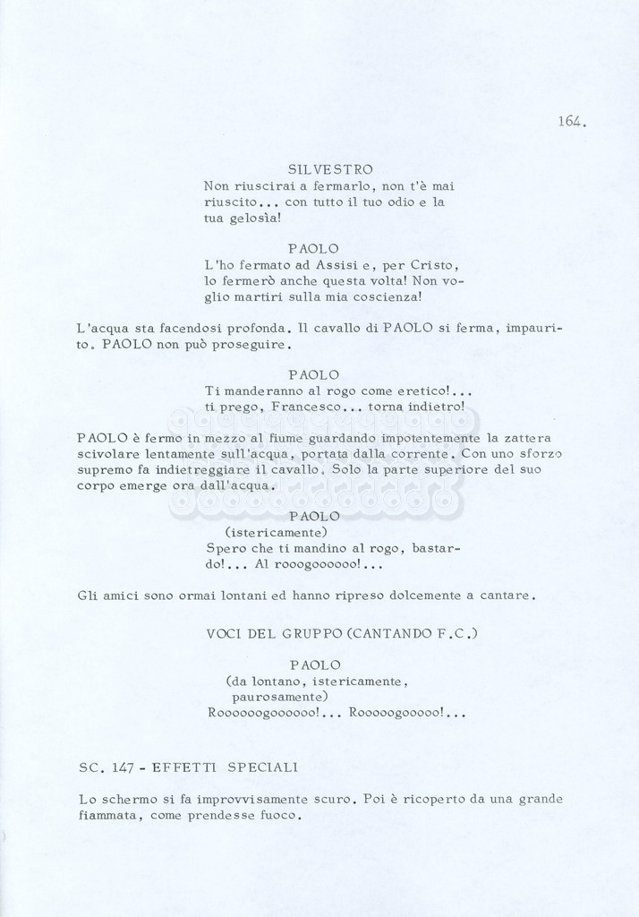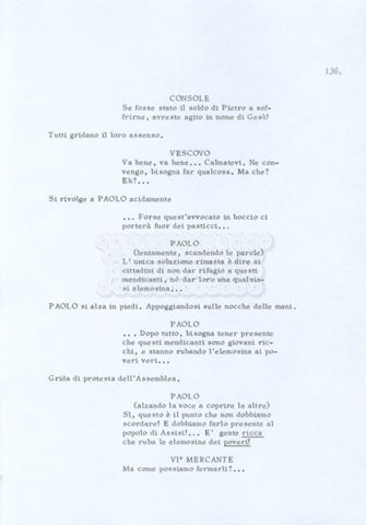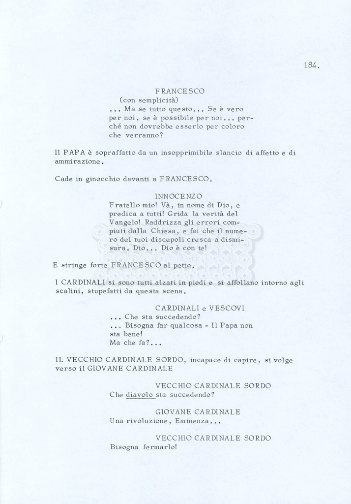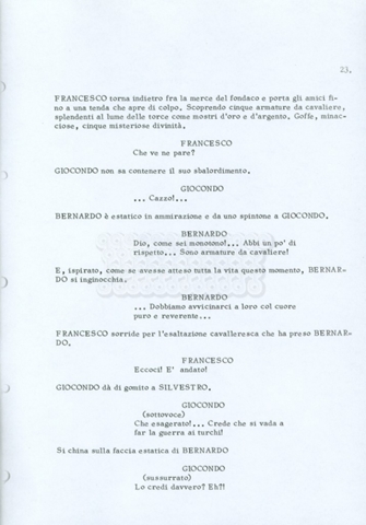 Torna alla banca dati “Fratello sole… sorella luna…” Documento storico Archivio Suso Cecchi d’Amico / Film realizzati / Fratello sole sorella luna Ambiti e contenuto Trattasi di una sceneggiatura di Suso Cecchi d’Amico, Lina Wertmüller, Franco Zeffirelli e i dialoghi di Kenneth Ross. Informazioni archivistiche Cronologia: novembre 1970 Numero di ordinamento definitivo: 23 Numero di ordinamento provvisorio: 1.22 Descrizione fisica: volume pp. 188 Immagini digitalizzate Informazioni sul film titolo originale: Fratello sole, sorella luna altri titoli: Brother Sun, Sister Moon regia: Zeffirelli, Franco (Pseudonimo) anno: 1972 paese di produzione: Italia – Regno Unito lingua principale: italiana altre lingue: inglese Documenti correlati Vai alla banca dati DOCUMENTO STORICO Fratello sole…sorella luna