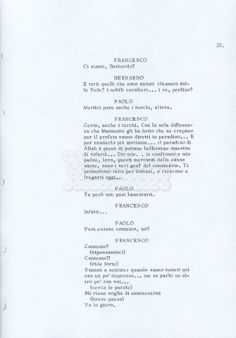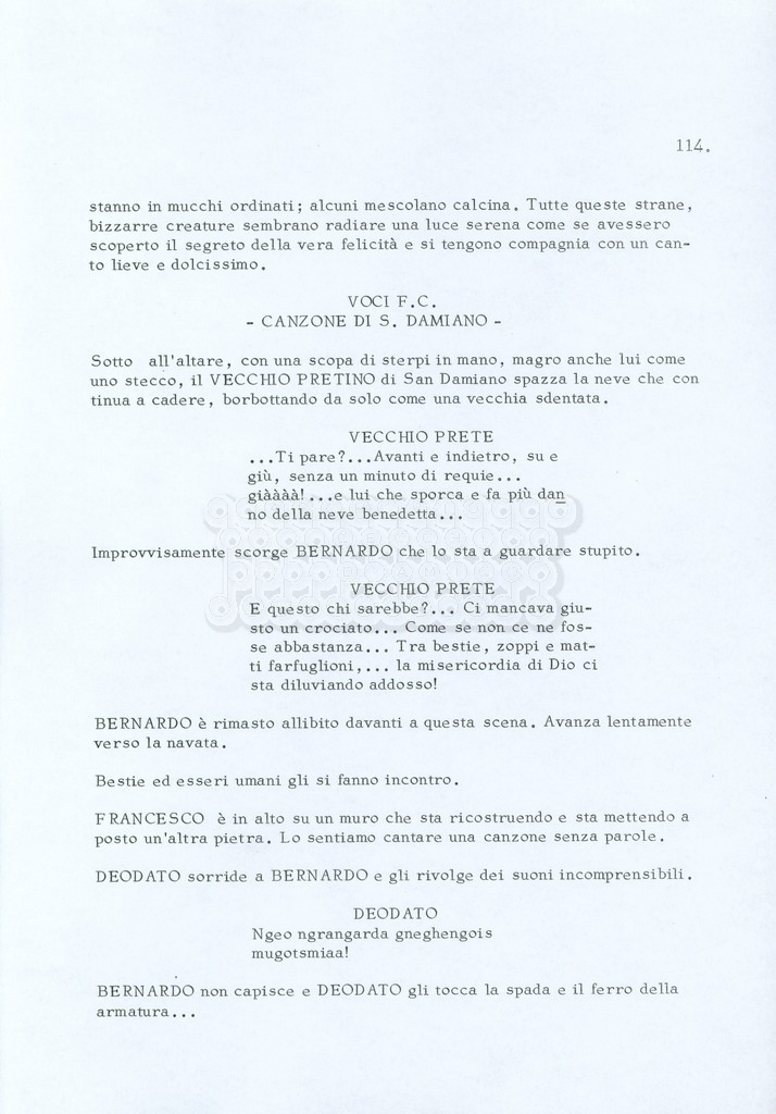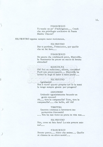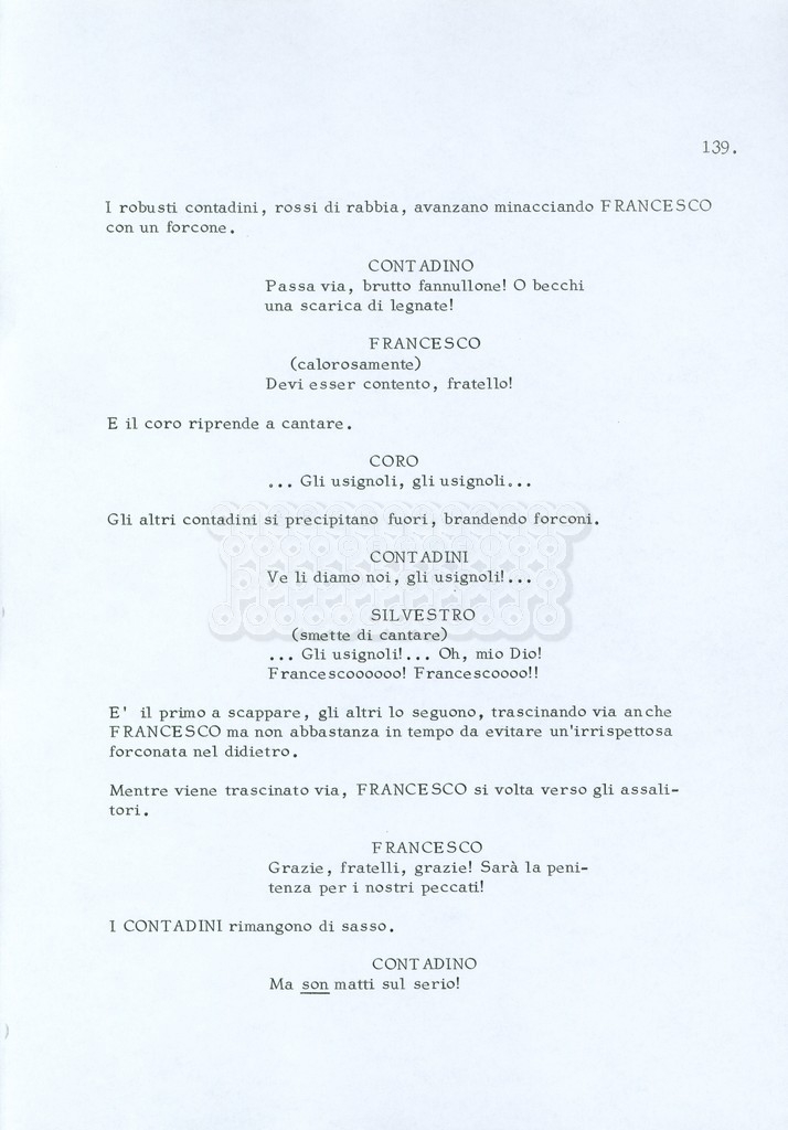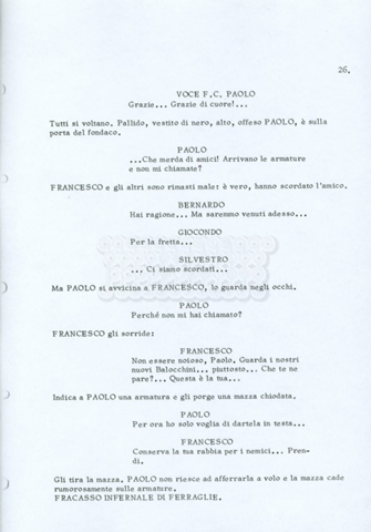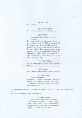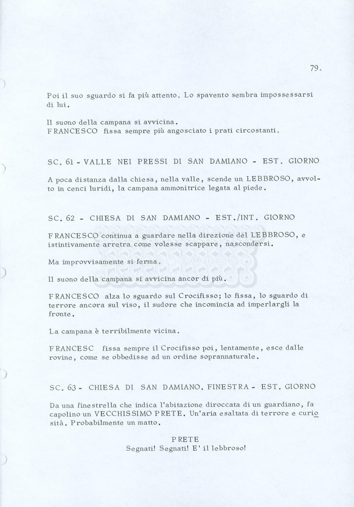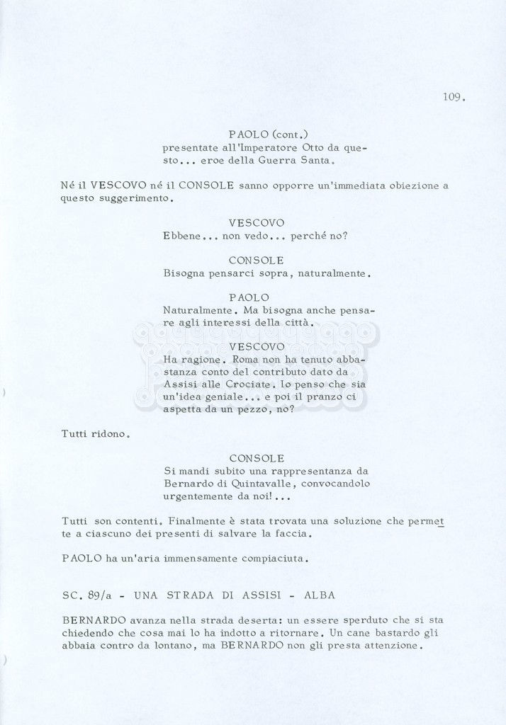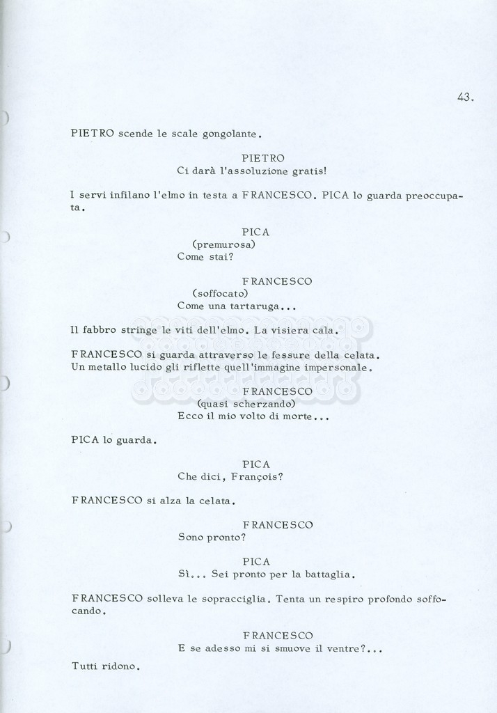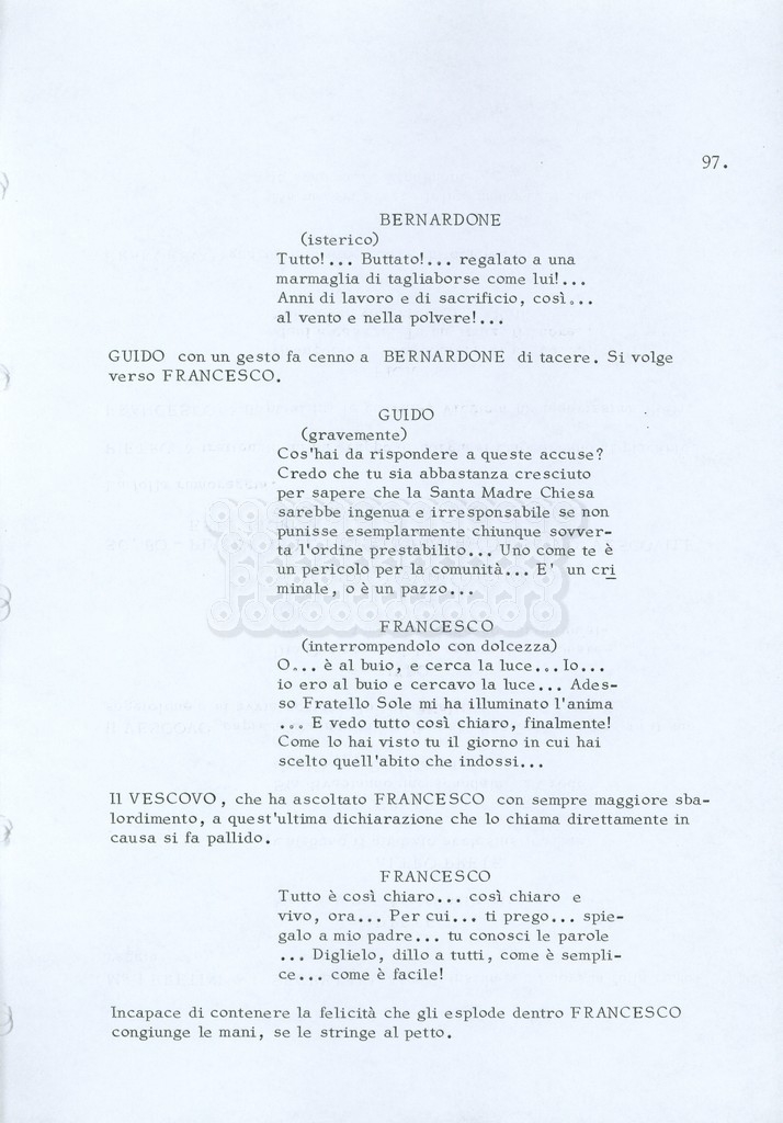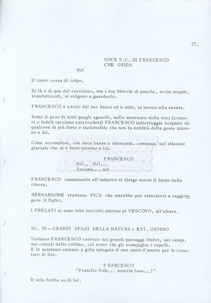 Torna alla banca dati “Fratello sole… sorella luna…” Documento storico Archivio Suso Cecchi d’Amico / Film realizzati / Fratello sole sorella luna Ambiti e contenuto Trattasi di una sceneggiatura di Suso Cecchi d’Amico, Lina Wertmüller, Franco Zeffirelli e i dialoghi di Kenneth Ross. Informazioni archivistiche Cronologia: novembre 1970 Numero di ordinamento definitivo: 23 Numero di ordinamento provvisorio: 1.22 Descrizione fisica: volume pp. 188 Immagini digitalizzate Informazioni sul film titolo originale: Fratello sole, sorella luna altri titoli: Brother Sun, Sister Moon regia: Zeffirelli, Franco (Pseudonimo) anno: 1972 paese di produzione: Italia – Regno Unito lingua principale: italiana altre lingue: inglese Documenti correlati Vai alla banca dati DOCUMENTO STORICO Fratello sole…sorella luna
