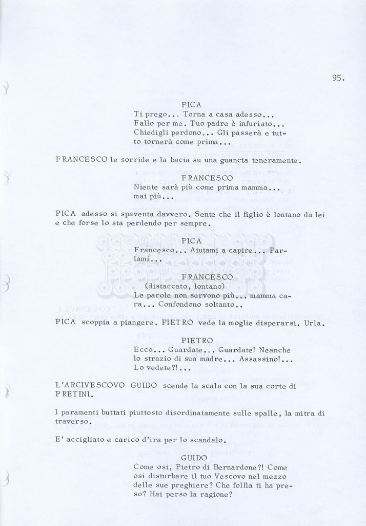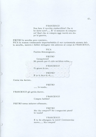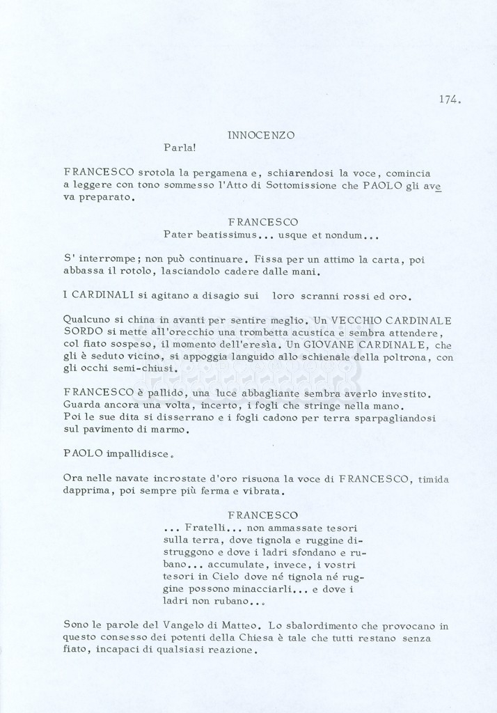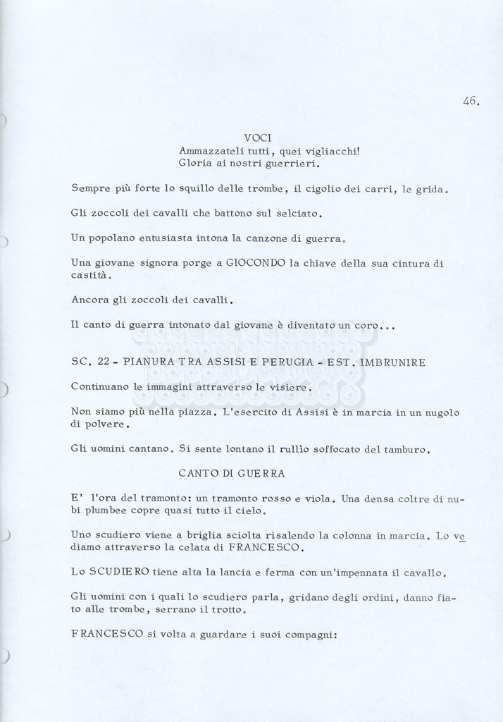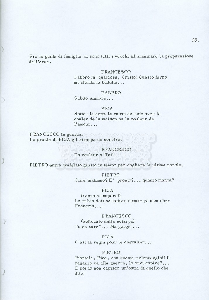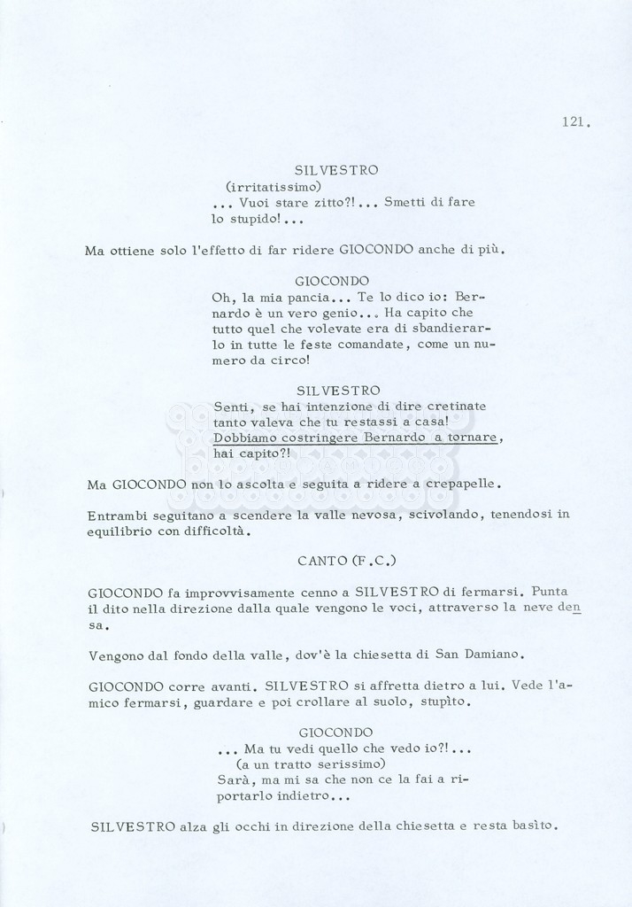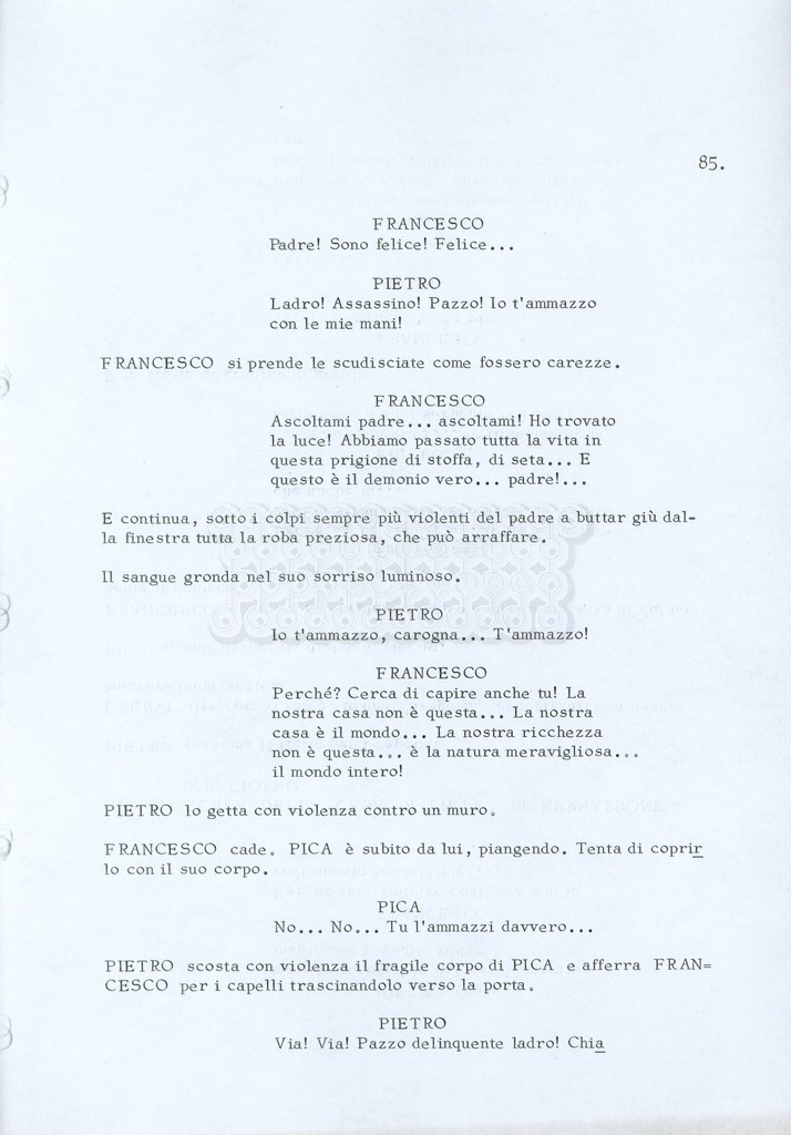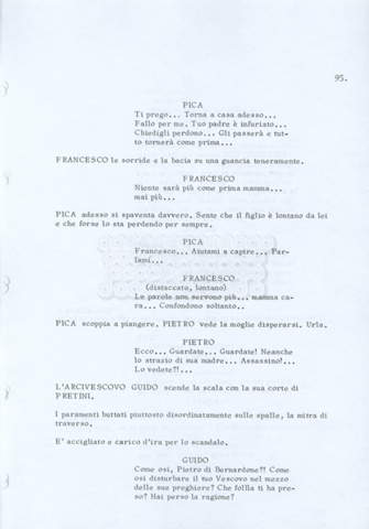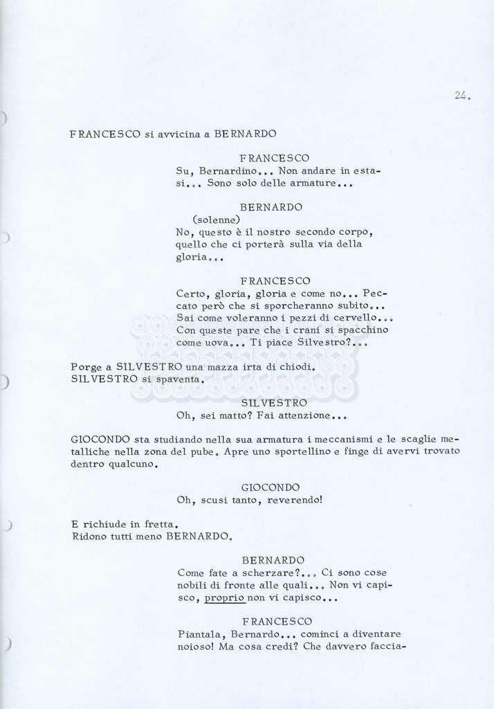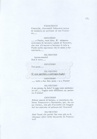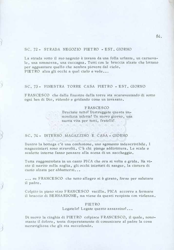 Torna alla banca dati “Fratello sole… sorella luna…” Documento storico Archivio Suso Cecchi d’Amico / Film realizzati / Fratello sole sorella luna Ambiti e contenuto Trattasi di una sceneggiatura di Suso Cecchi d’Amico, Lina Wertmüller, Franco Zeffirelli e i dialoghi di Kenneth Ross. Informazioni archivistiche Cronologia: novembre 1970 Numero di ordinamento definitivo: 23 Numero di ordinamento provvisorio: 1.22 Descrizione fisica: volume pp. 188 Immagini digitalizzate Informazioni sul film titolo originale: Fratello sole, sorella luna altri titoli: Brother Sun, Sister Moon regia: Zeffirelli, Franco (Pseudonimo) anno: 1972 paese di produzione: Italia – Regno Unito lingua principale: italiana altre lingue: inglese Documenti correlati Vai alla banca dati DOCUMENTO STORICO Fratello sole…sorella luna