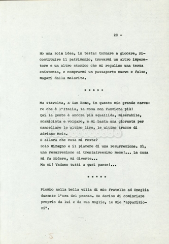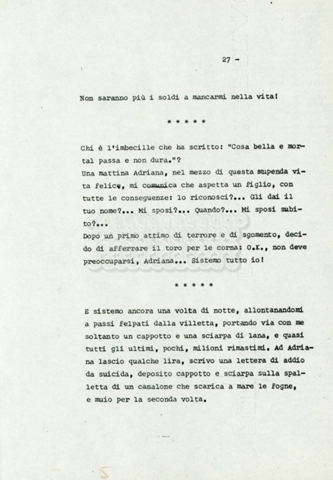 Torna alla banca dati “Il fu Mattia Pascal” Documento storico Archivio Suso Cecchi d’Amico / Film realizzati / Le due vite di Mattia Pascal Ambiti e contenuto Si tratta di una proposta a Rai1 per l’adattamento del romanzo di Luigi Pirandello in quattro puntate di un’ora. Informazioni archivistiche Cronologia: 25 gennaio 1984 Numero di ordinamento definitivo: 35 Numero di ordinamento provvisorio: 1.23 Descrizione fisica: volume pp. 32 Immagini digitalizzate Informazioni sul film titolo originale: Le due vite di Mattia Pascal altri titoli: La double vie de Mathias Pascal – Die zwei Leben des Mattia Pascal – La doble vida de Matías Pascal – The Two Lives of Mattia Pascal regia: Monicelli, Mario anno: 1985 paese di produzione: Italia – Francia – Germania Ovest – Spagna – Regno Unito lingua principale: italiana Documenti correlati Vai alla banca dati DOCUMENTO STORICO “The late Mattia Pascal” DOCUMENTO STORICO “La doppia vita di Mattia Pascal” DOCUMENTO STORICO “Le due vite di Mattia Pascal” DOCUMENTO STORICO “The Two Lives of Mattia Pascal”