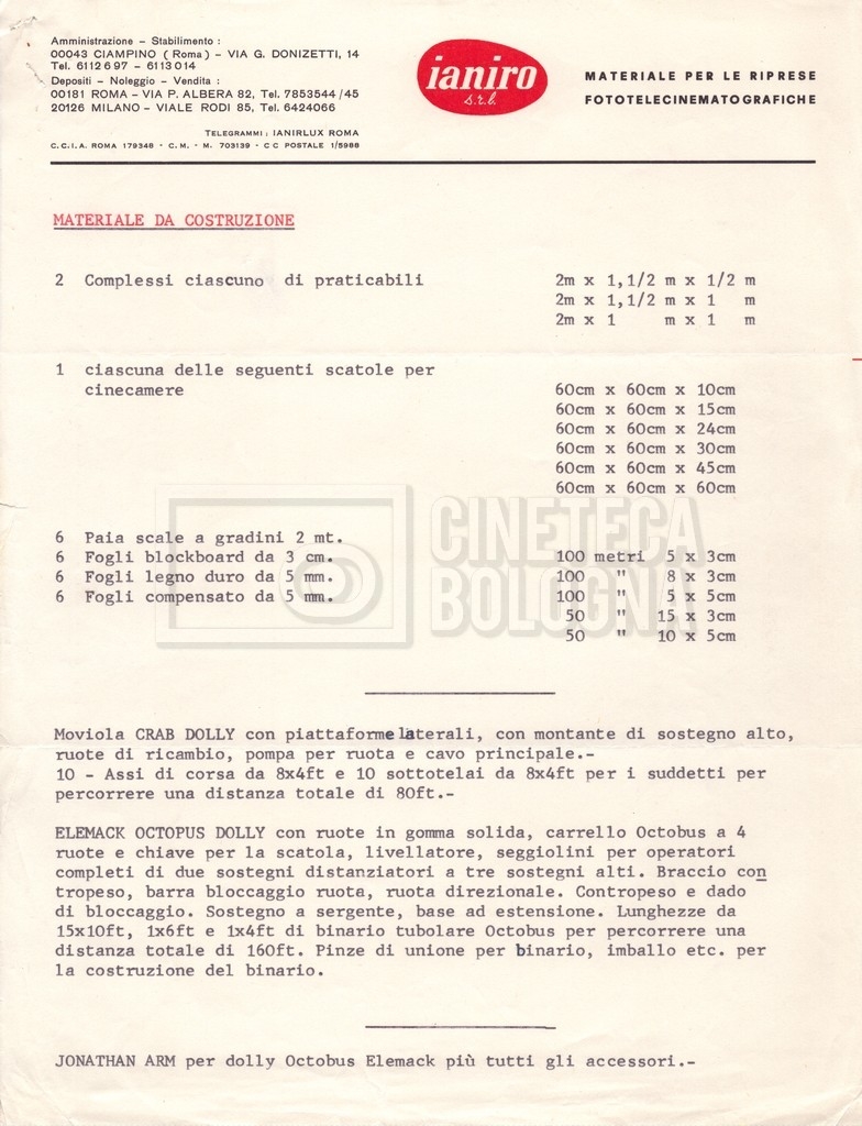 – Diverse note datt. per materiale da costruzione e preventivi per materiale cinematografico, come lampade, gelatine e carboni, dell’azienda ‘Ianiro’;