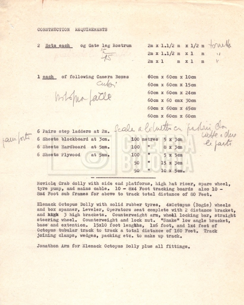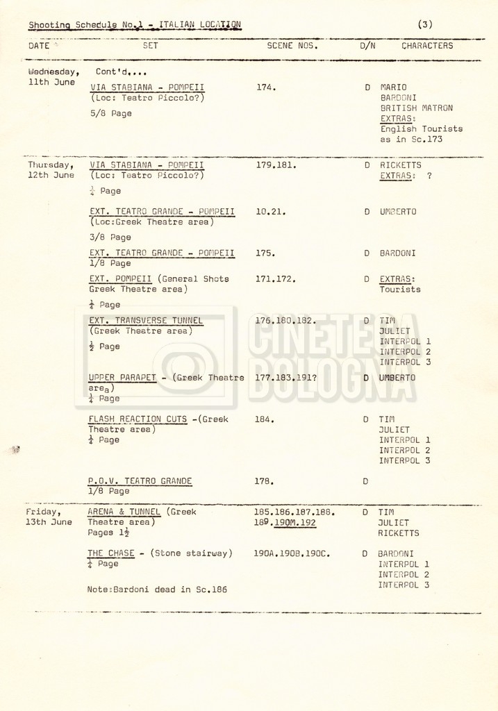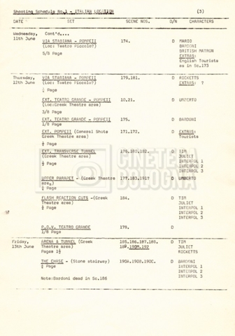 – Un programma delle riprese (“Shooting schedule”) nella location italiana;
