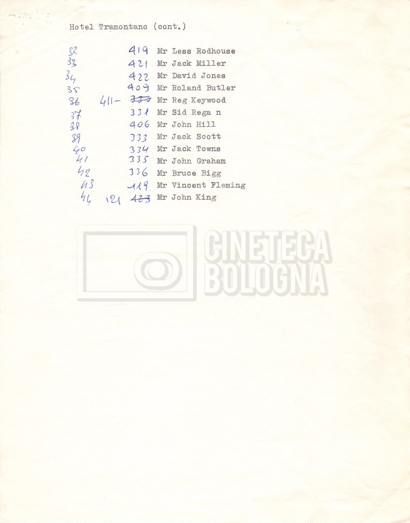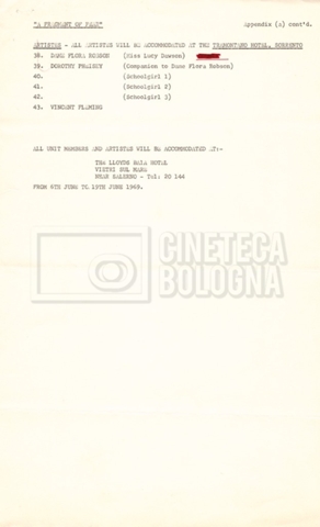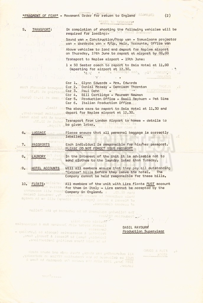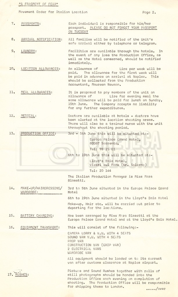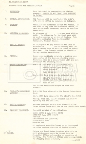 – Tre “Movement order” per l’arrivo alla location di Sorrento e per il ritorno in Inghilterra (18 maggio 1969 – 17 giugno 1969);