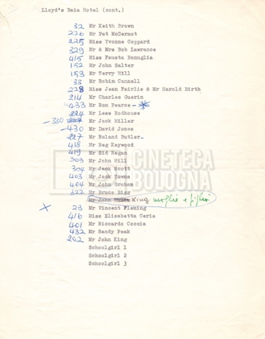 – Un elenco degli alloggiamenti della troupe e del cast nei vari hotels;
