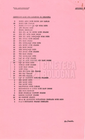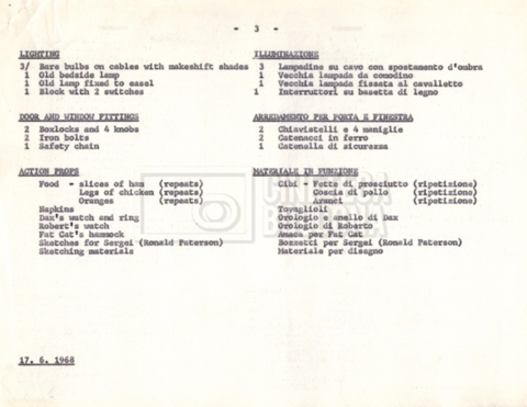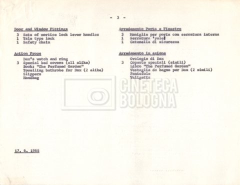– Due elenchi degli arredi e delle attrezzature per i set (17 giugno 1968);
