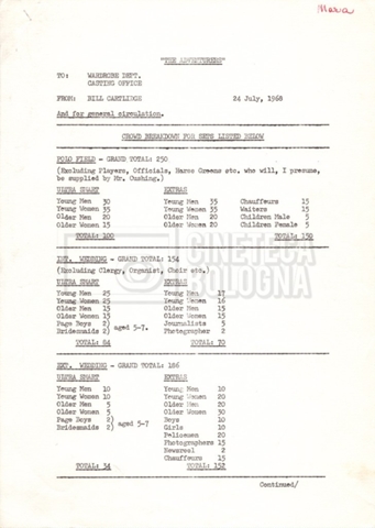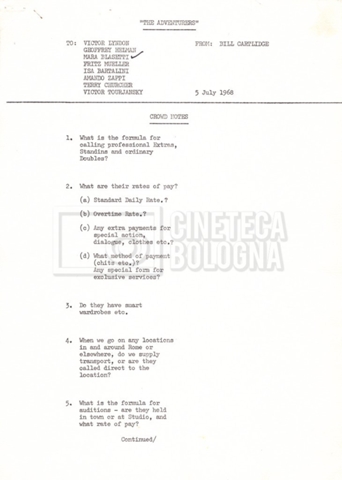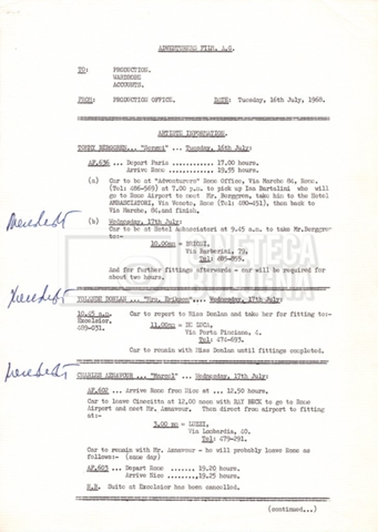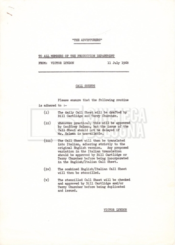 – Numerose comunicazioni interne, note, memorandum, call sheets, per i vari dipartimenti (11 luglio 1968 – 19 novembre 1968);