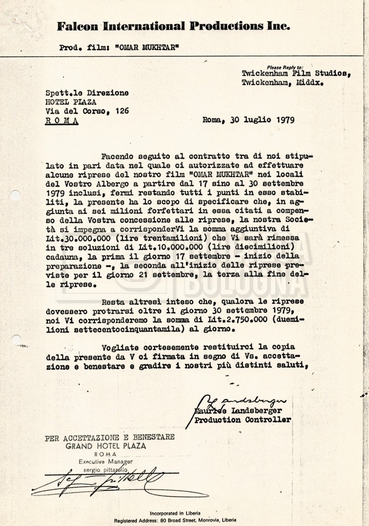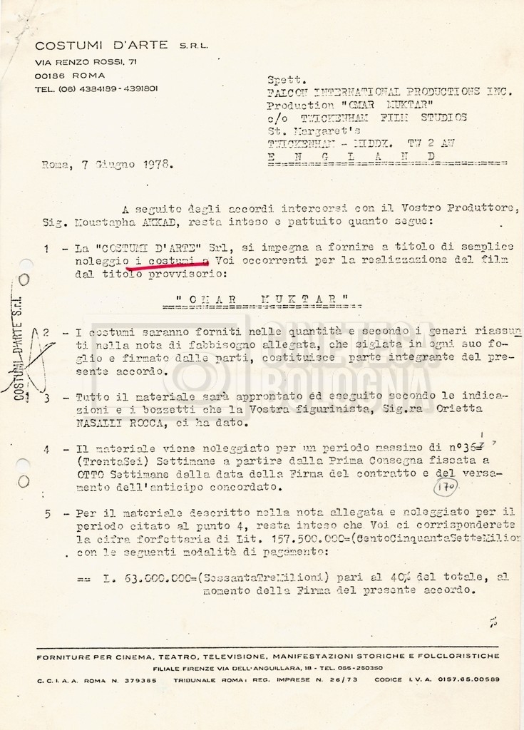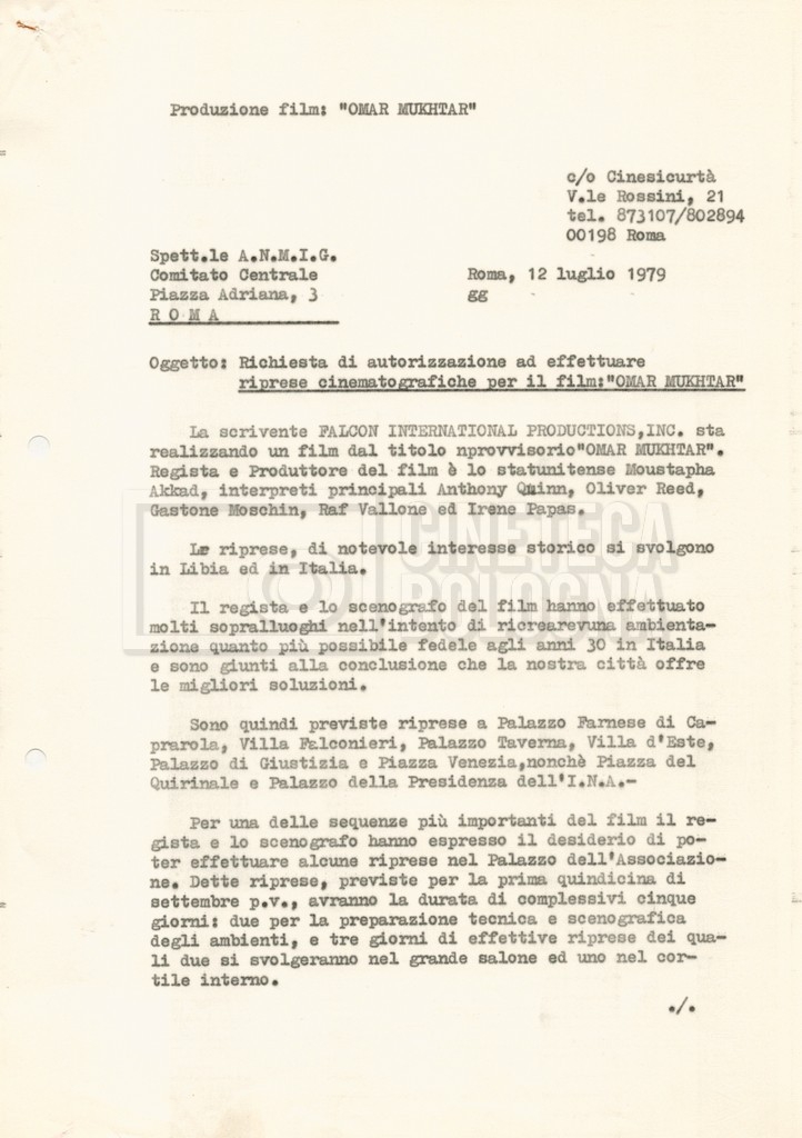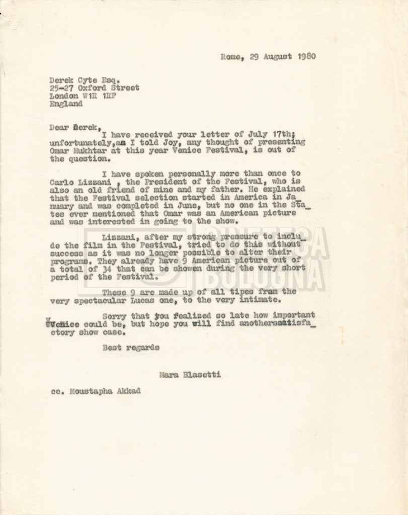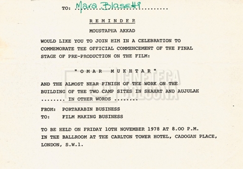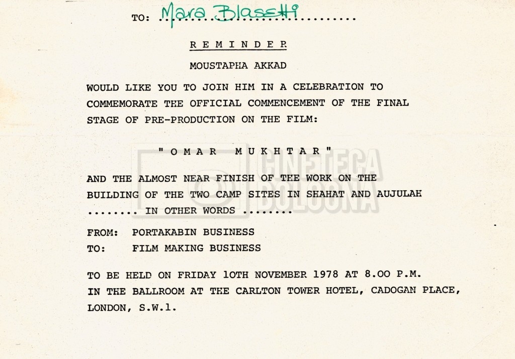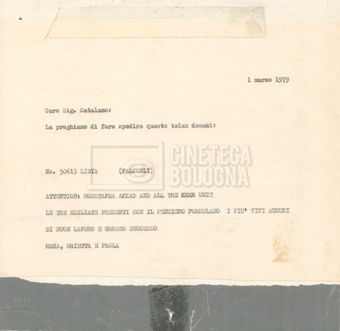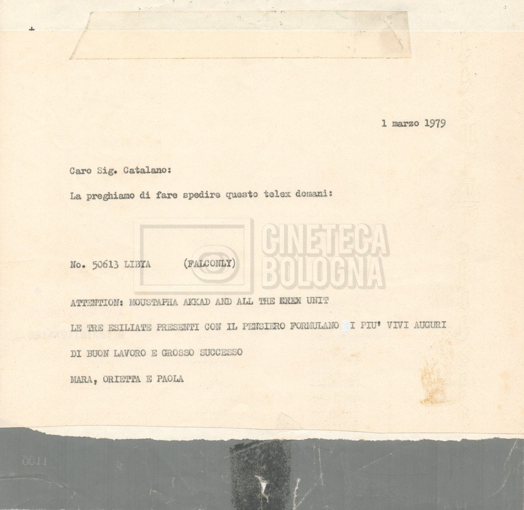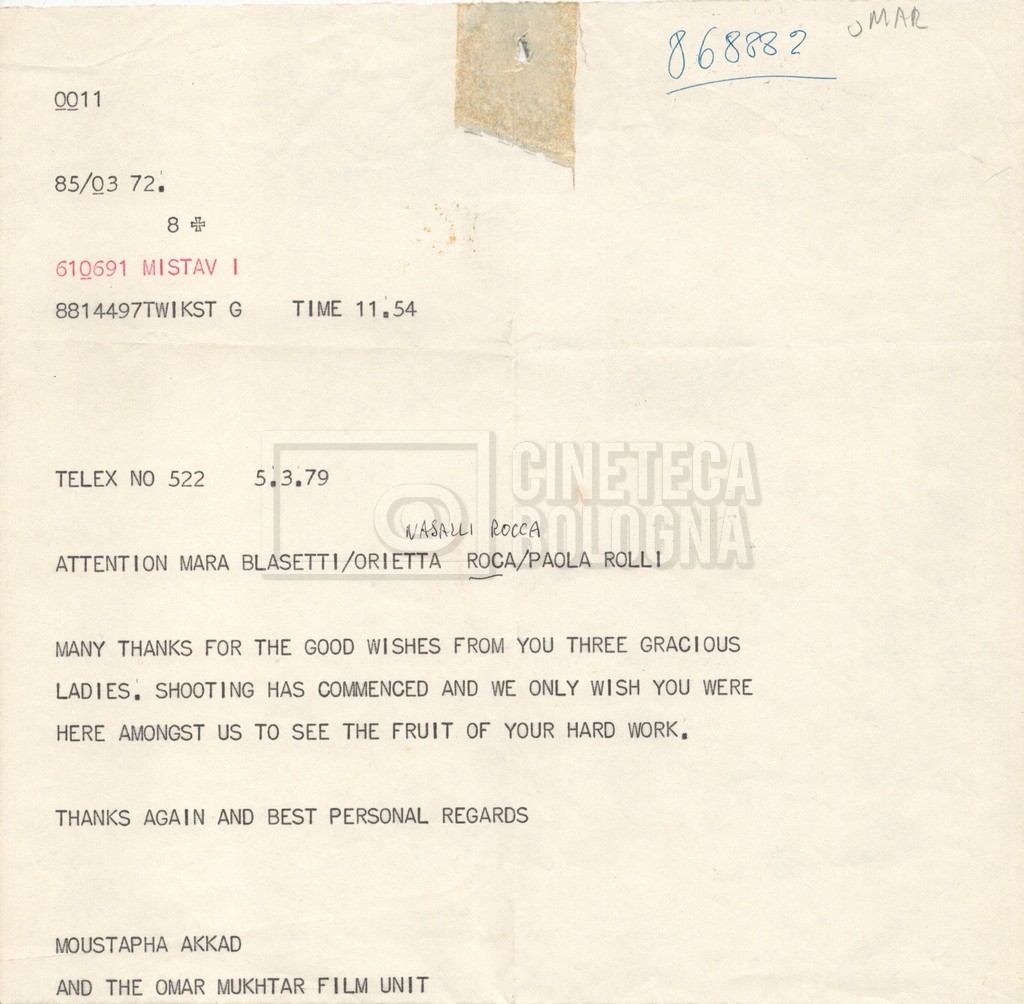 – Un telegramma di ringraziamento inviato a Mara Blasetti da parte del regista Mustapha Akkad, in occasione dell’inizio delle riprese (05 marzo 1979);