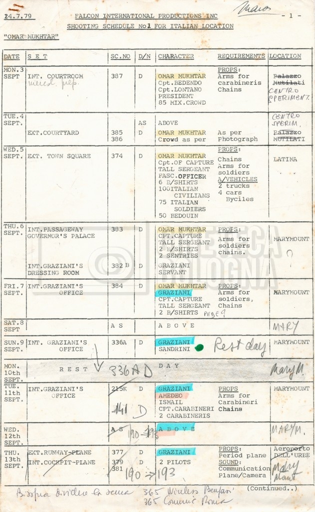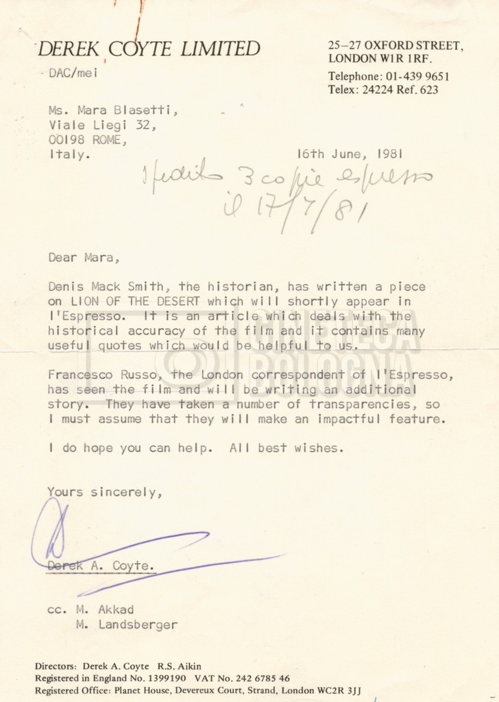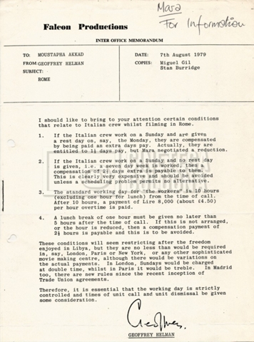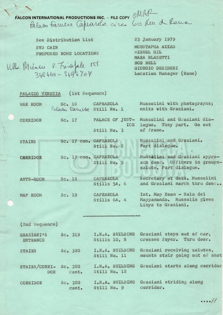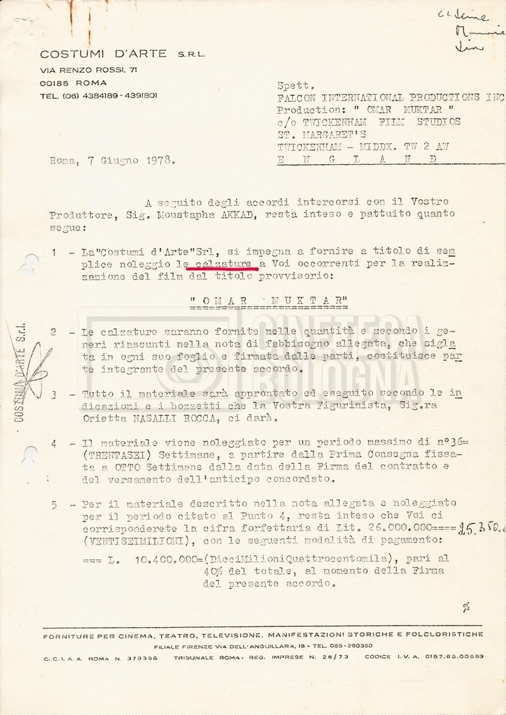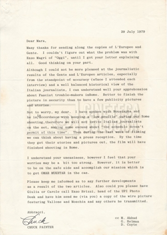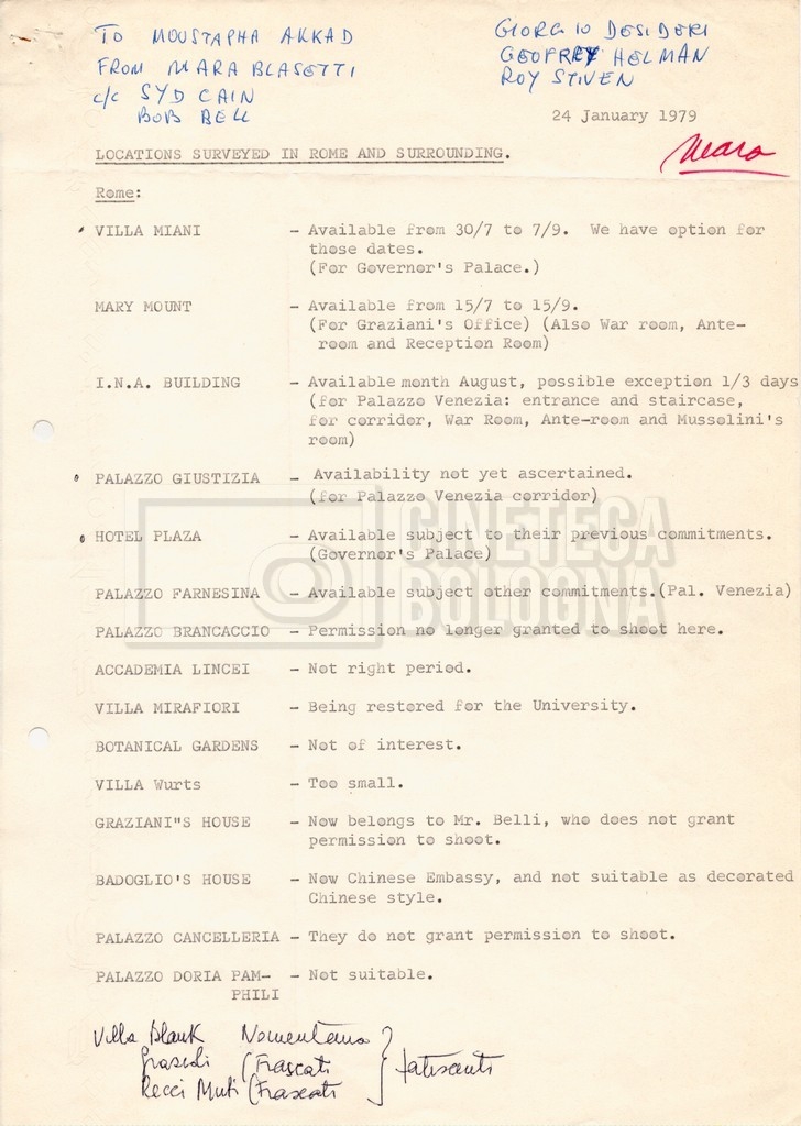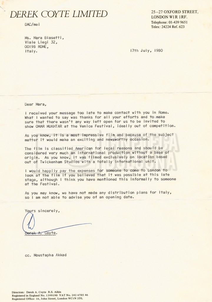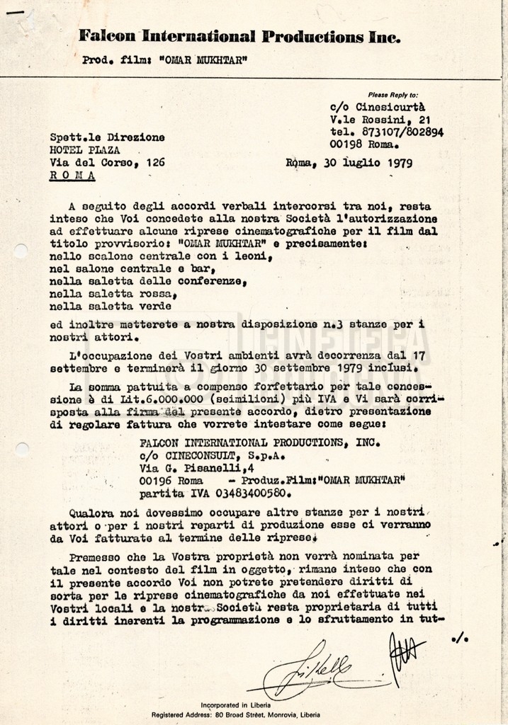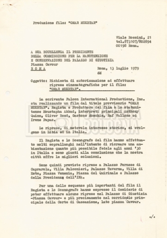 – Un telegramma di ringraziamento inviato a Mara Blasetti da parte del regista Mustapha Akkad, in occasione dell’inizio delle riprese (05 marzo 1979);