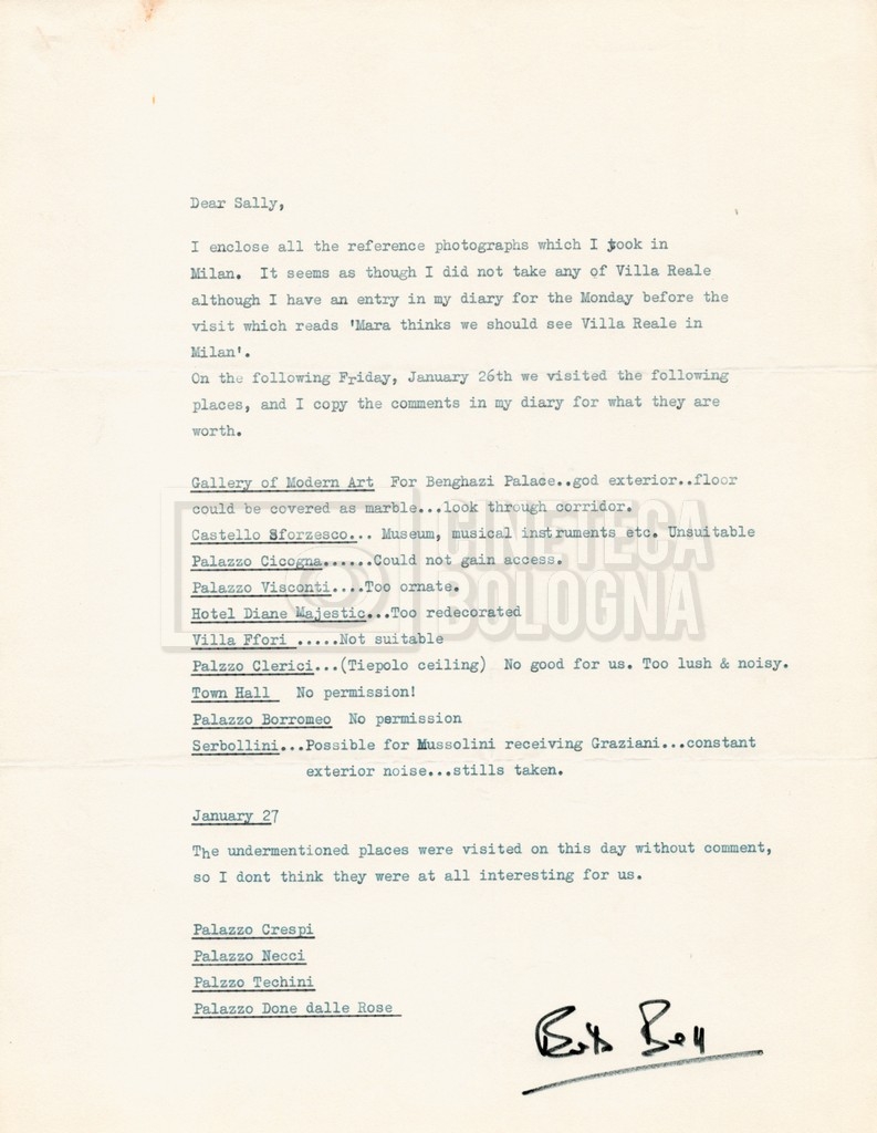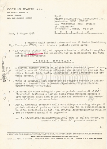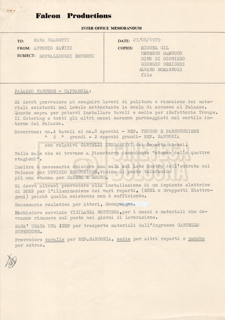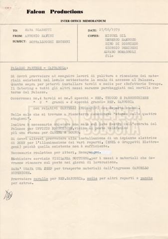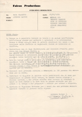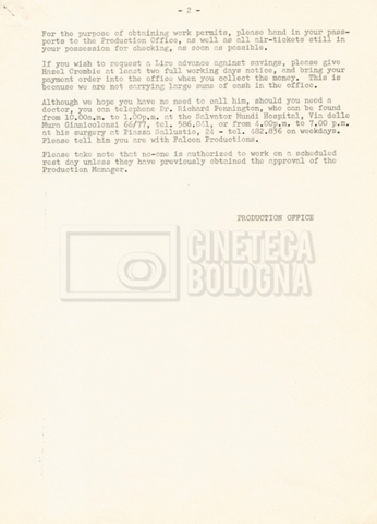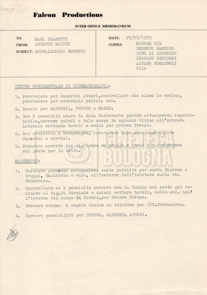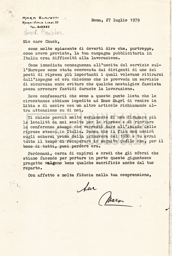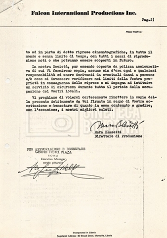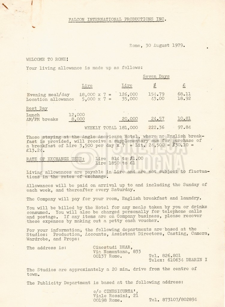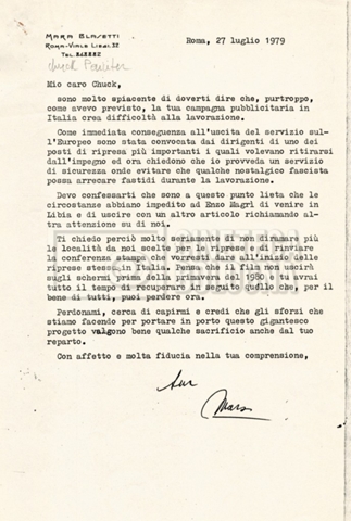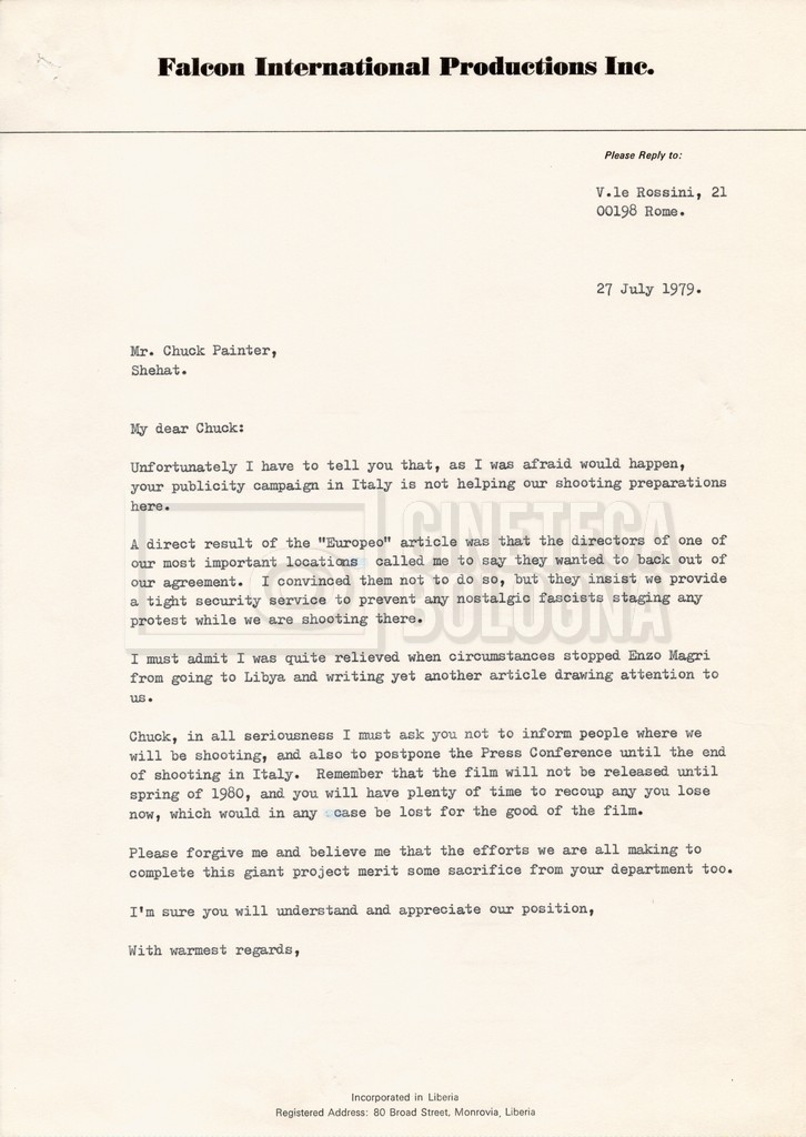 – Una lettera a Roy Stevens che illustra le procedure di produzione del il film in Italia;