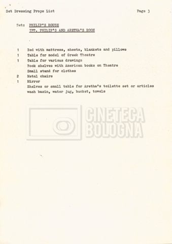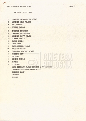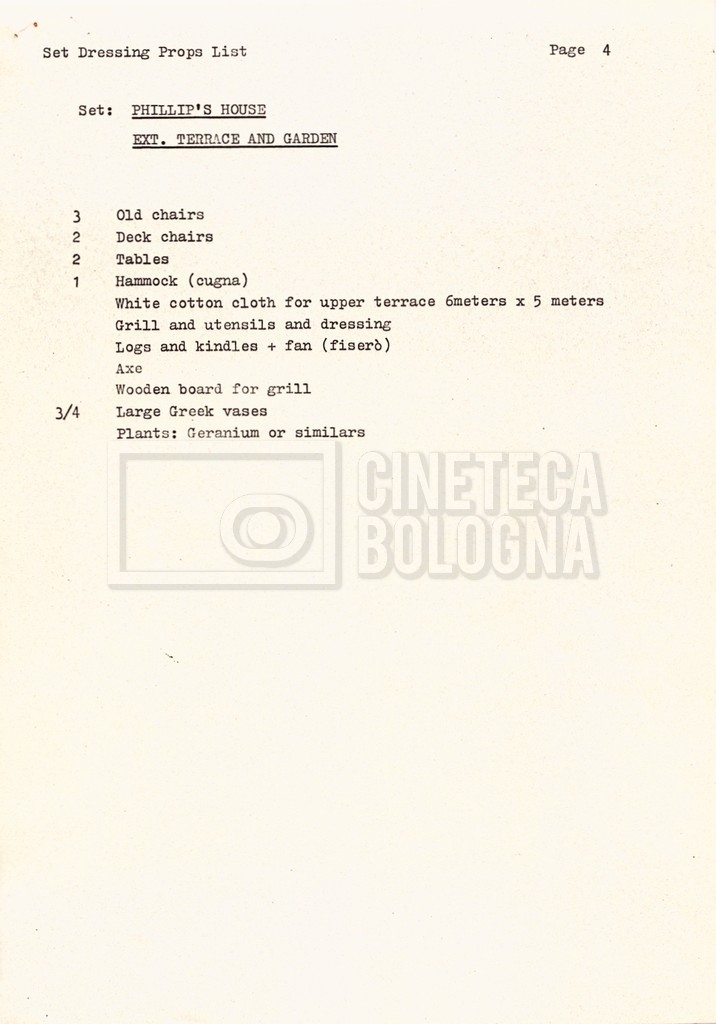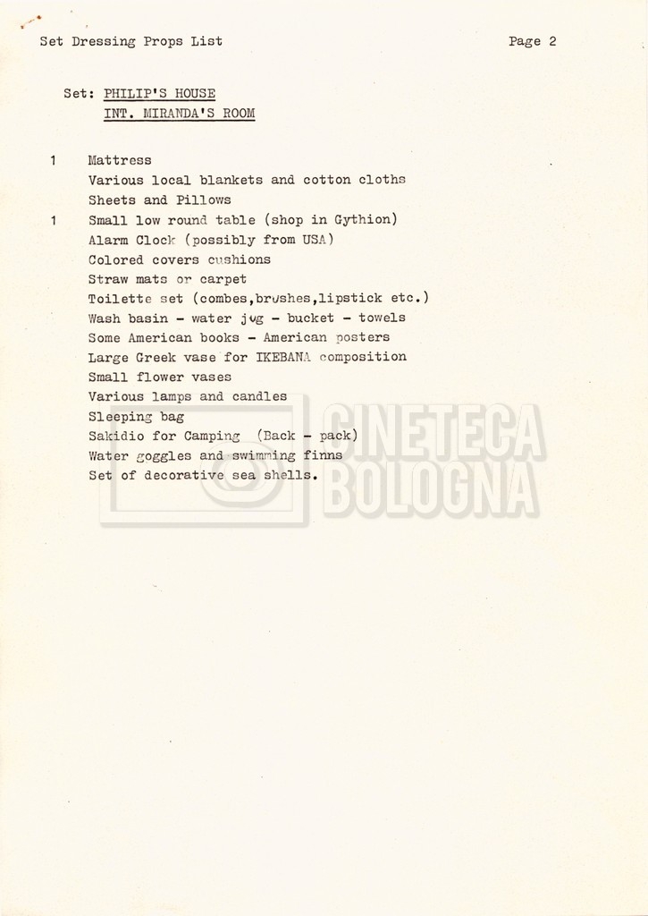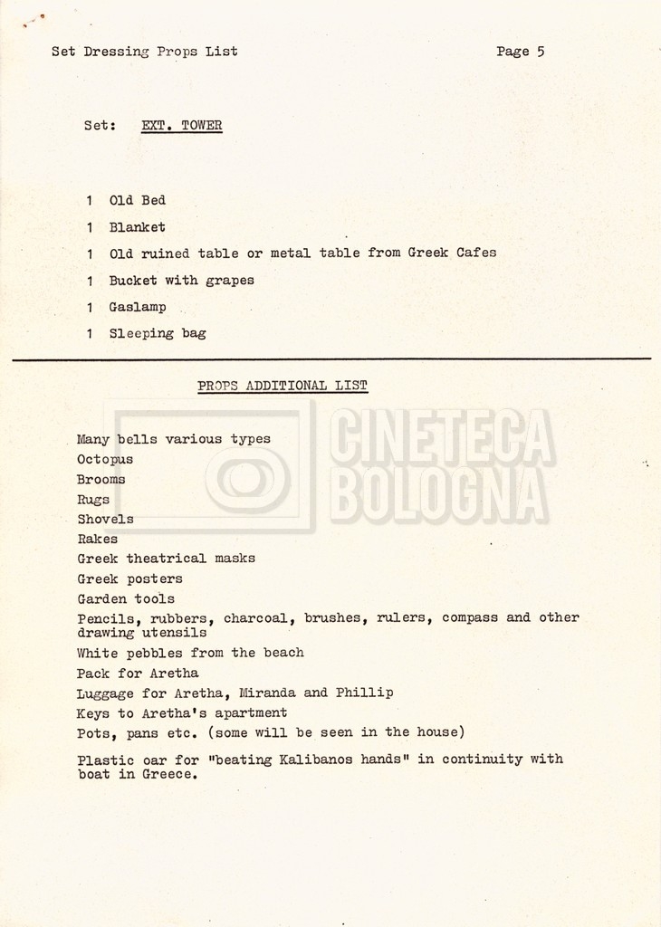 – Una lista del fabbisogno di arredamento (“Set dressing prop list”) (10 luglio 1981);