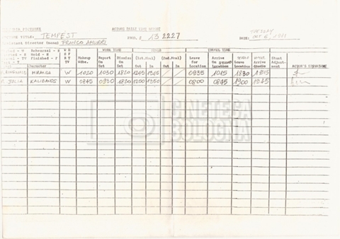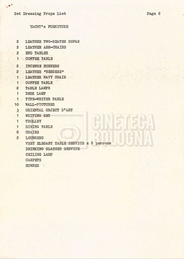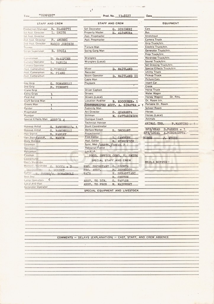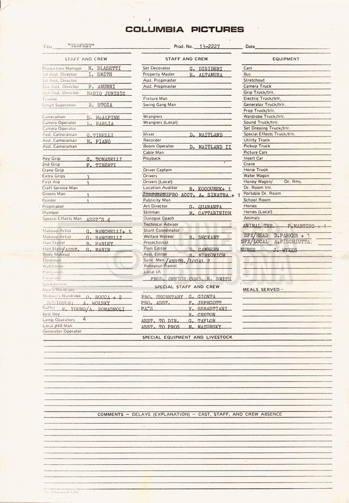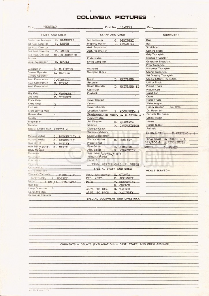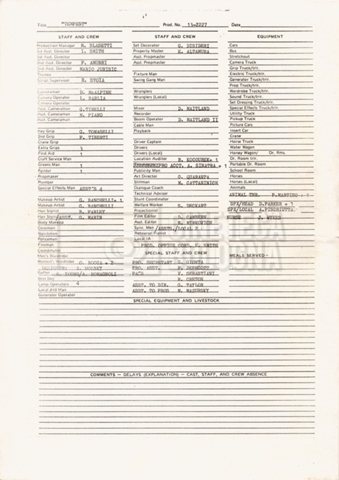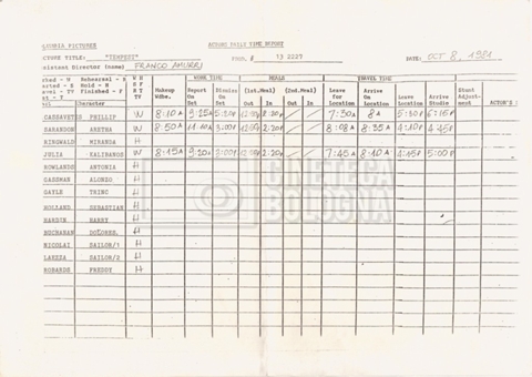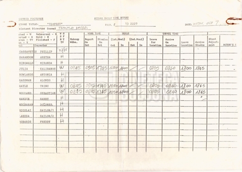– Una lista di voli per il cast e la troupe (“Tentative departure list”);