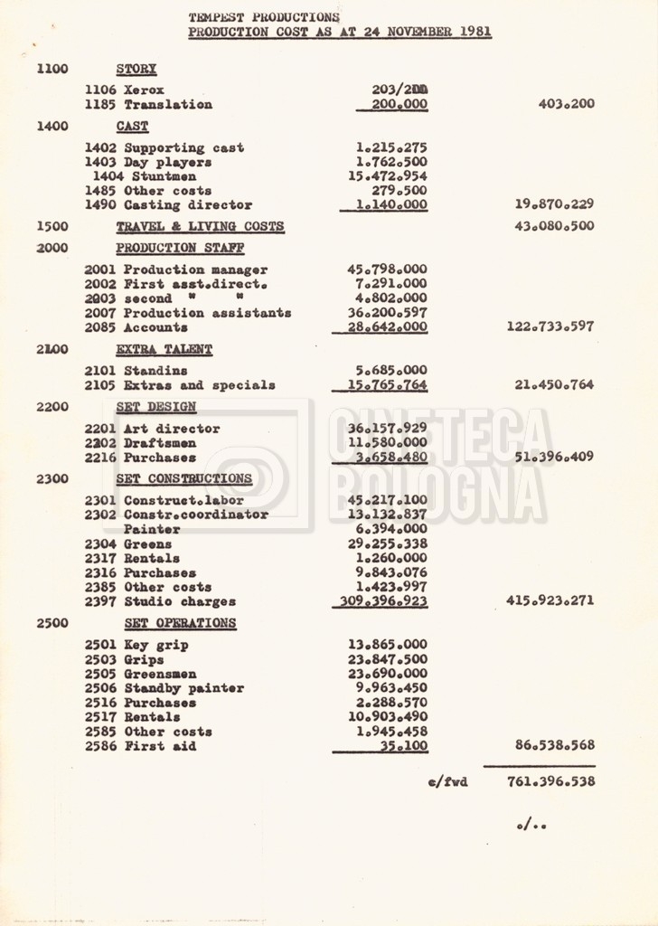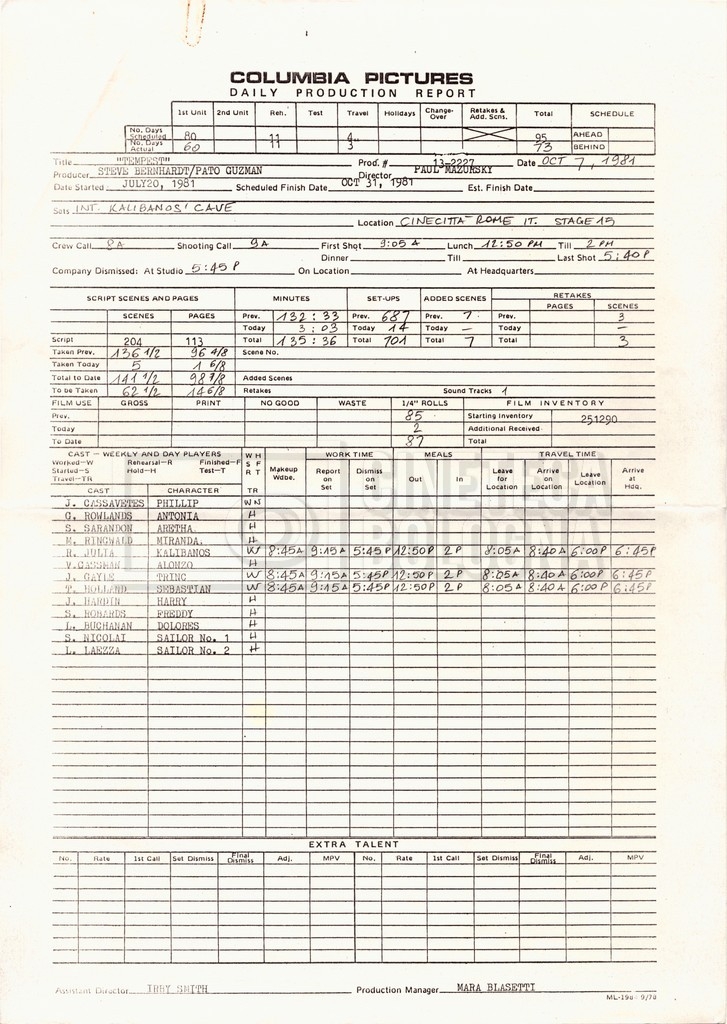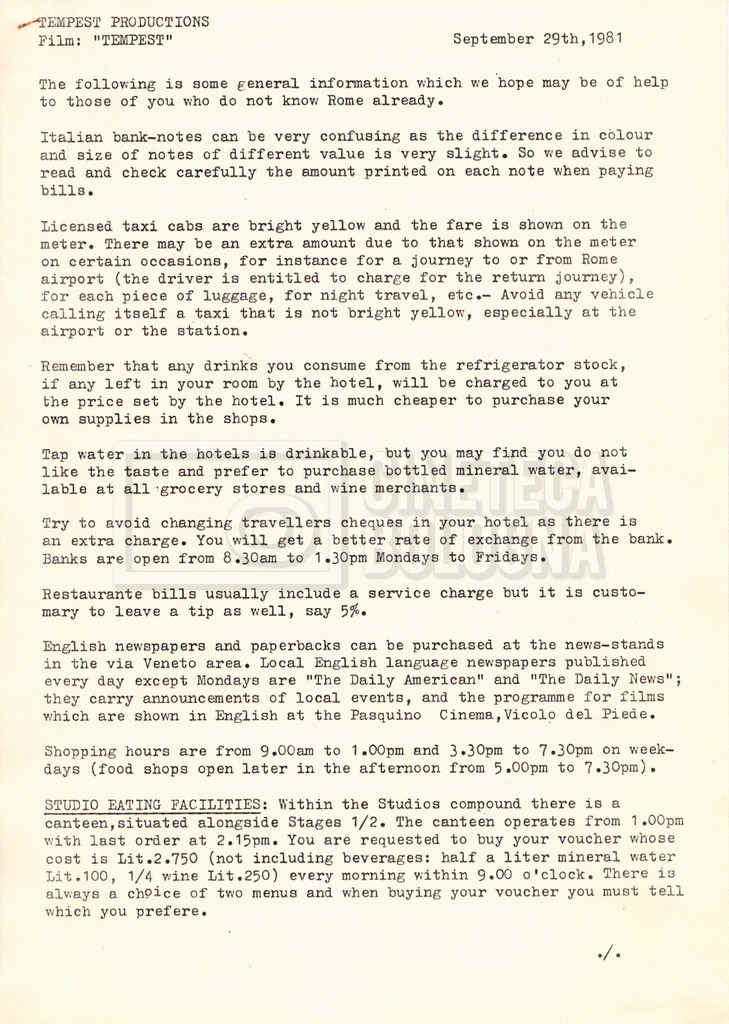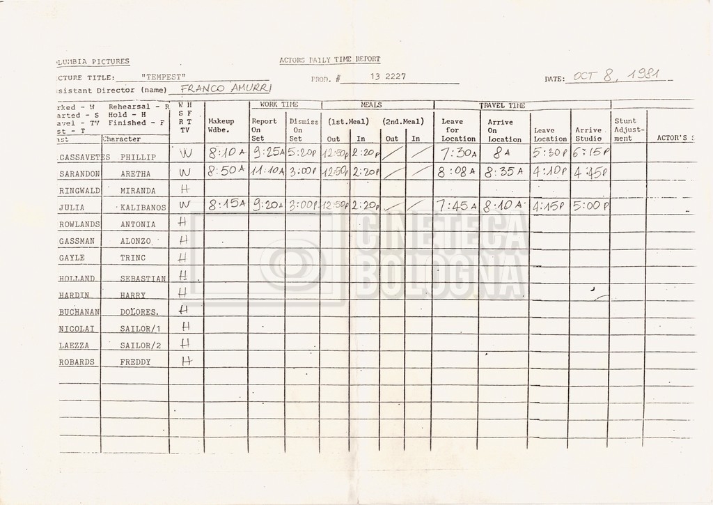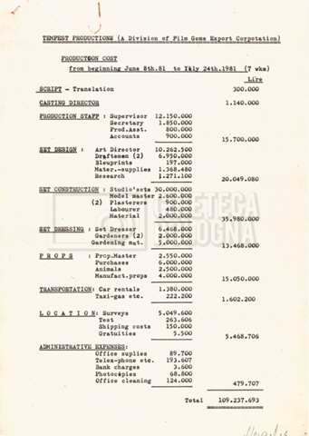 – Una lista della troupe italiana (“Italian crew list”) (08 luglio 1981);