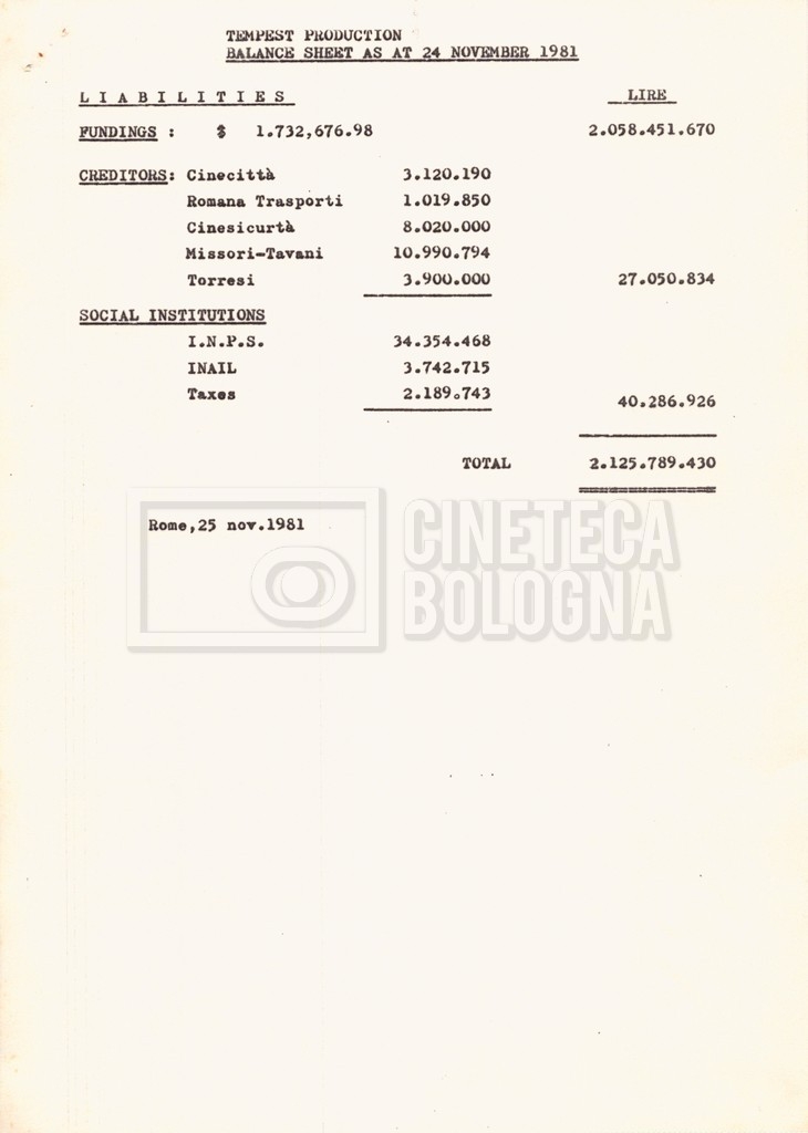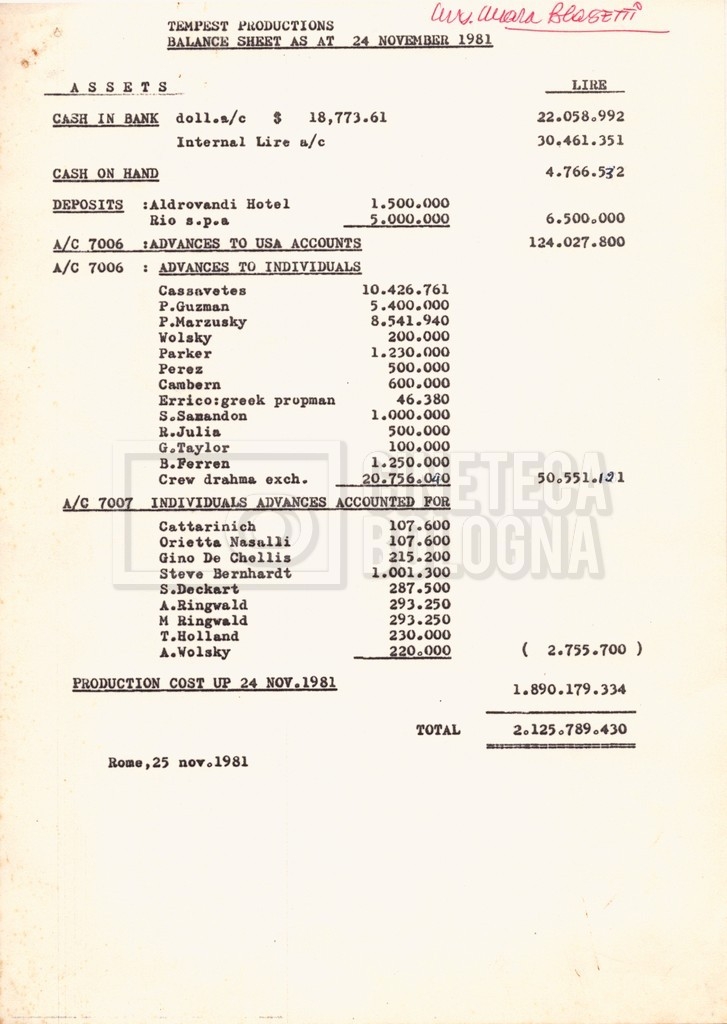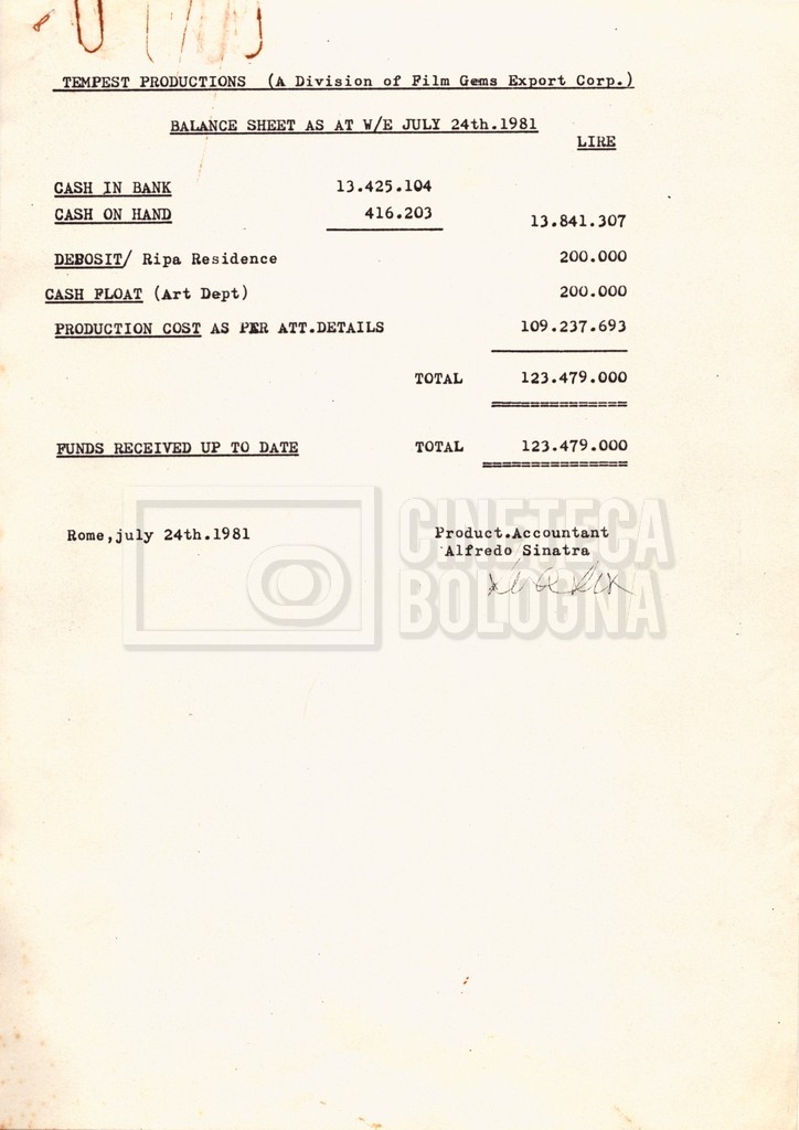 – Due rendiconti sul bilancio, uno al 24 luglio 1981, l’altro al 24 novembre 1981 (“Balance sheet”);