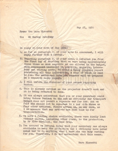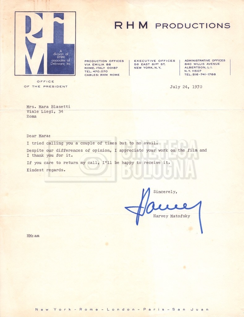 – Carteggio tra Mara e Harvey Matofsky della ‘RHM productions’ (26 maggio – 24 luglio 1970);