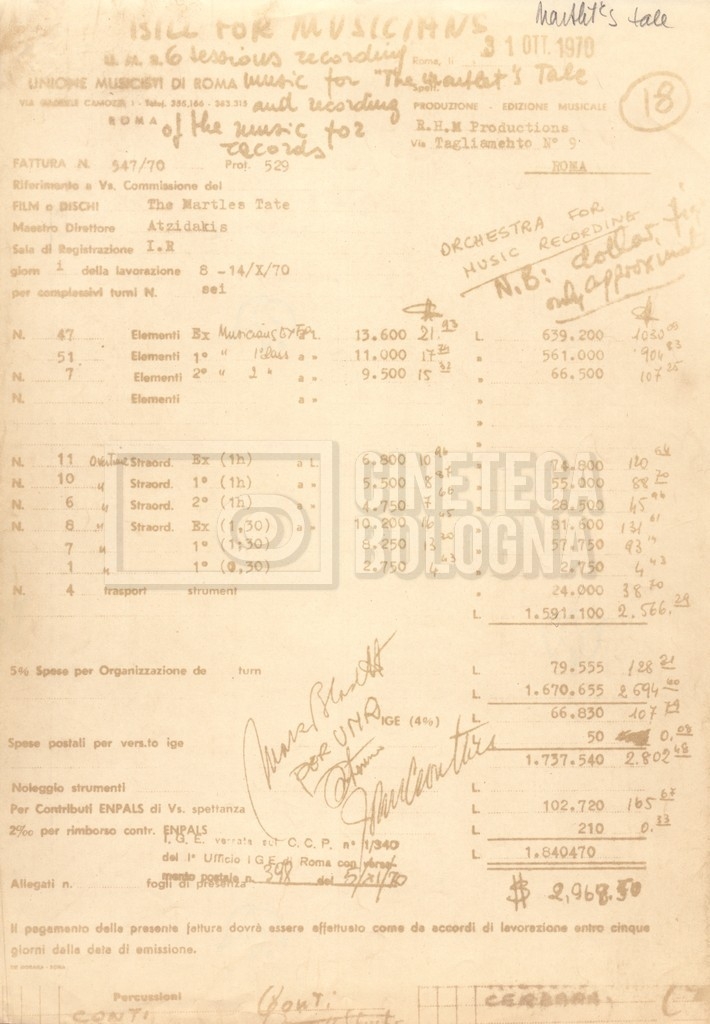 – Una fattura per la musica del film (31 ottobre 1970).