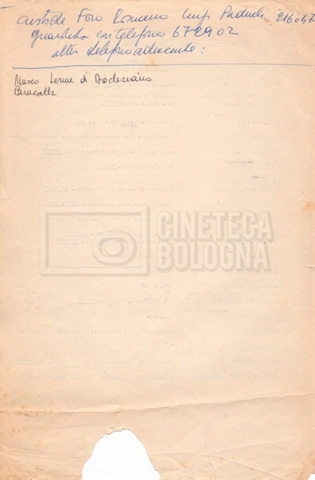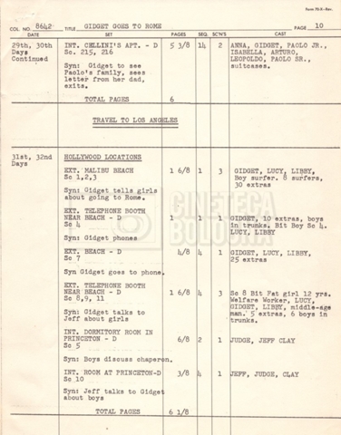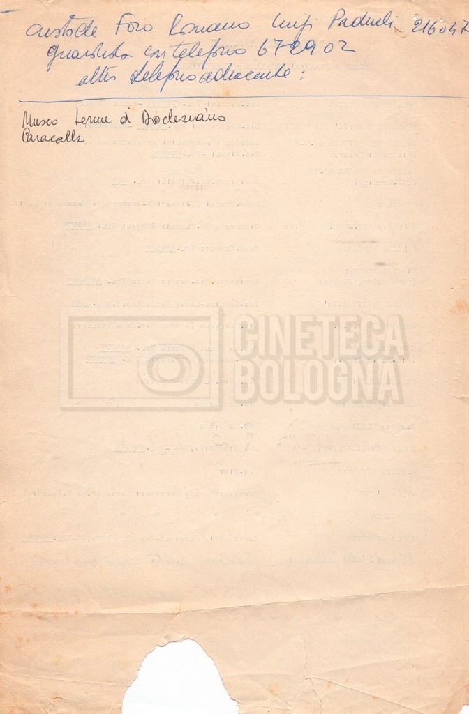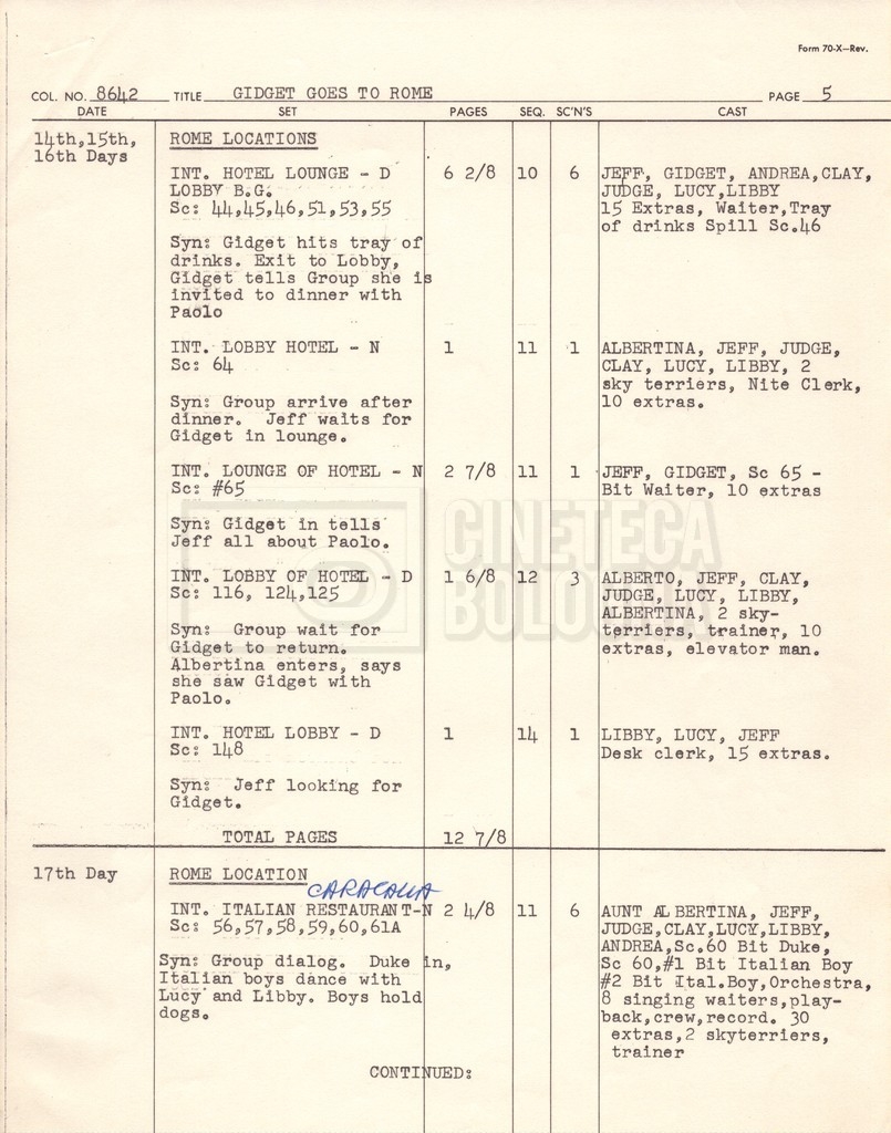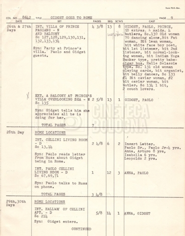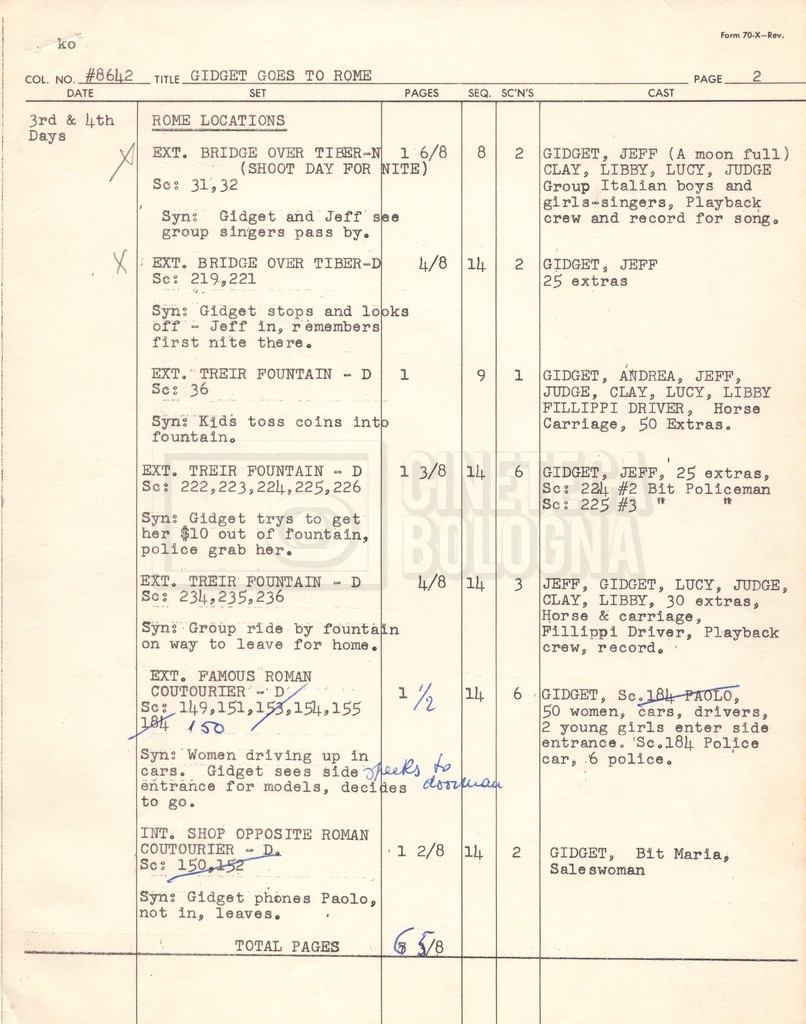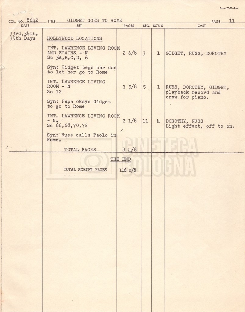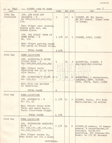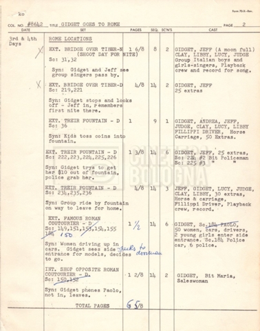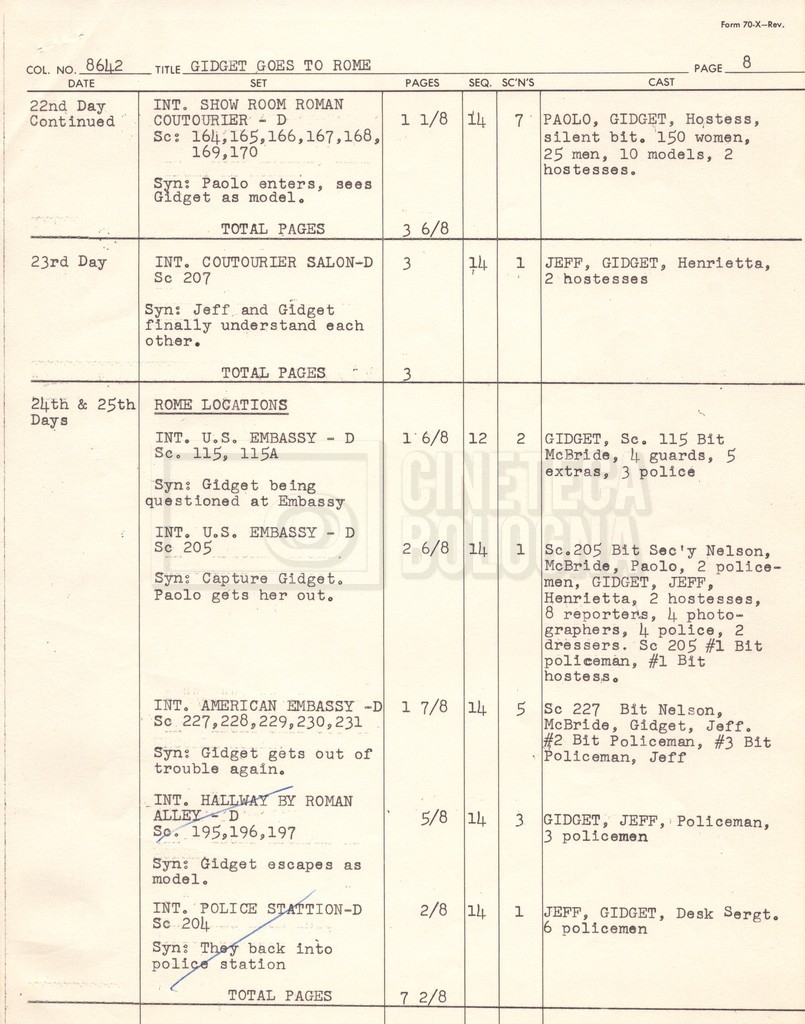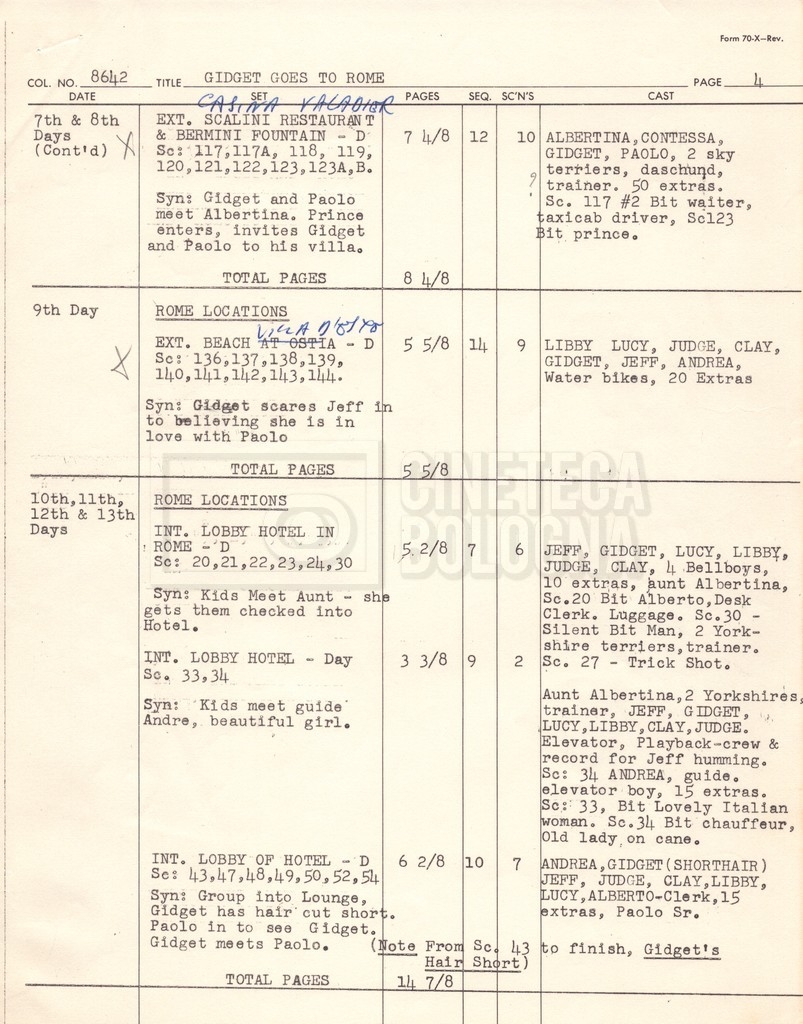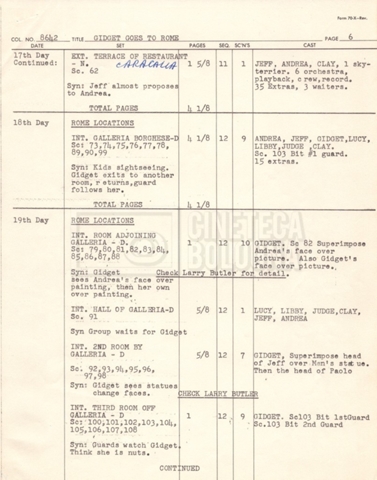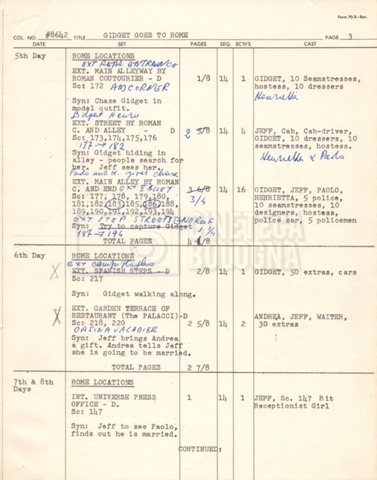 – Un piano delle riprese (“Shooting schedule”) (17 settembre 1962);