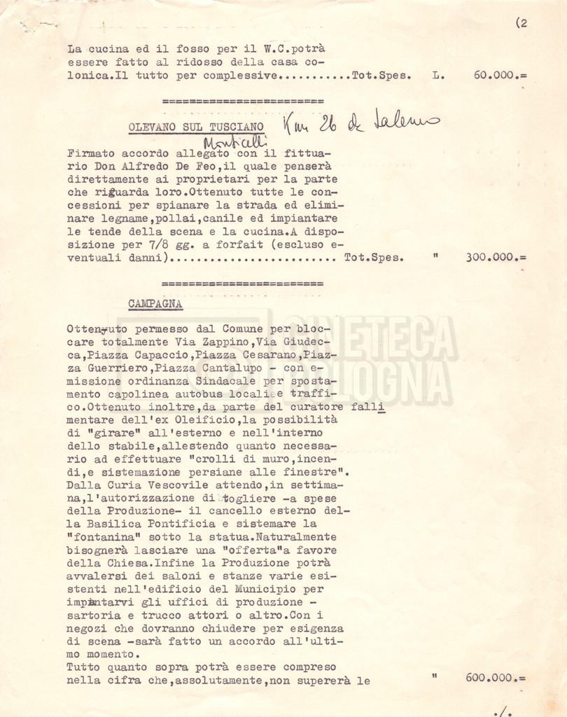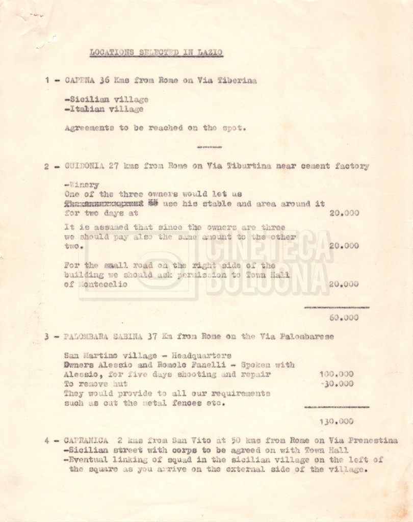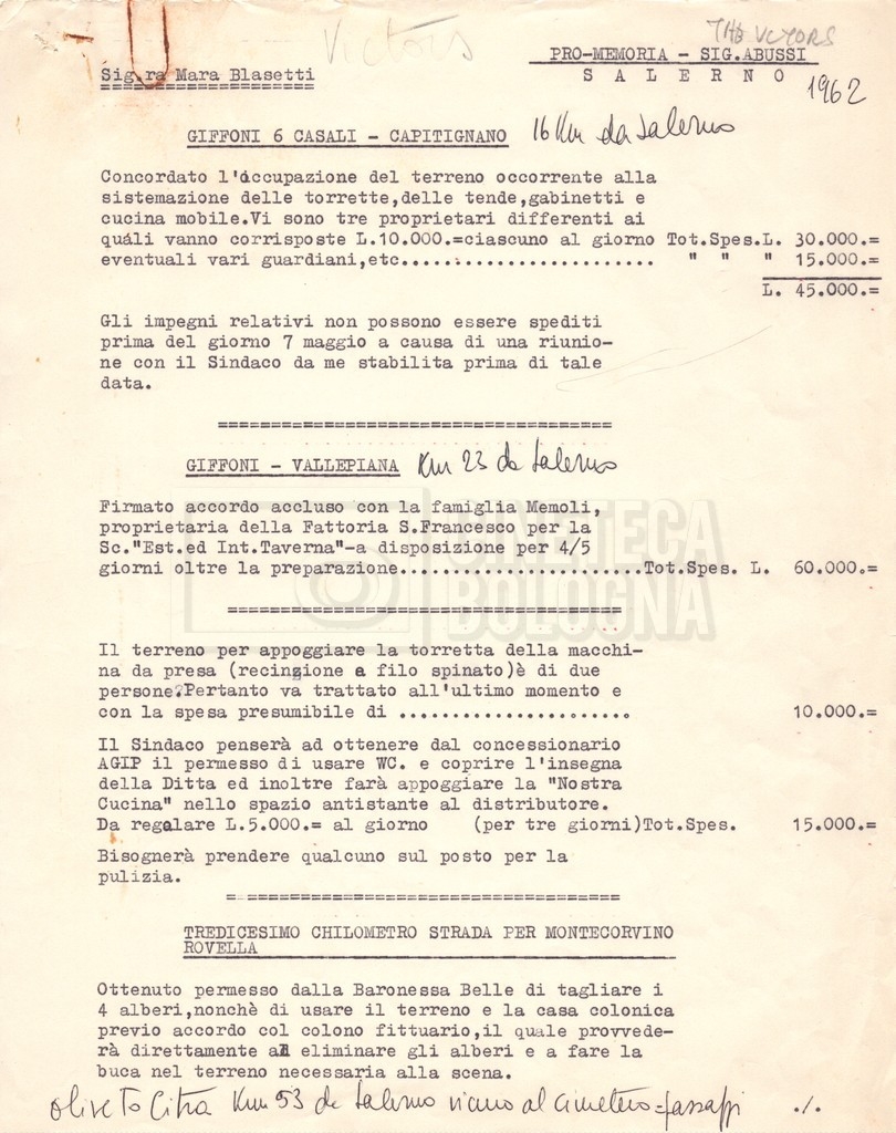 Torna alla banca dati Gestione delle riprese in esterno Documento storico Fondo Mara Blasetti / “Film Mara girati” / The Victors Ambiti e contenuto Si segnalano:– Una mappa delle location nei dintorni di Salerno (“Location map”);– Un promemoria legato ai permessi e agli accordi per girare in esterno. Informazioni archivistiche Cronologia: 1962 Numero di ordinamento definitivo: 1.8.2 Numero di ordinamento provvisorio: 7.1.A Descrizione fisica: fascicolo Immagini digitalizzate Informazioni sul film titolo originale: The Victors altri titoli: I vincitori regia: Foreman, Carl anno: 1963 paese di produzione: Stati Uniti – Regno Unito lingua principale: inglese altre lingue: francese – tedesca – italiana – russa Documenti correlati Vai alla banca dati DOCUMENTO STORICO “Cast e unit lists” DOCUMENTO STORICO “The victors”
