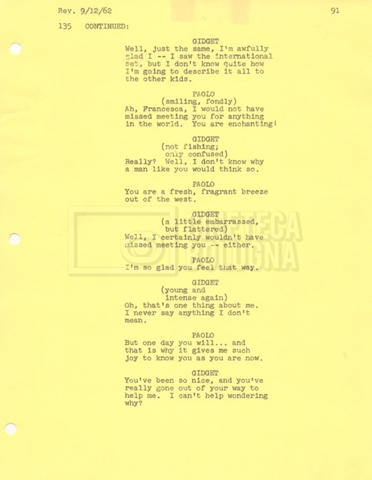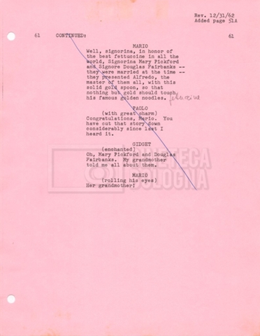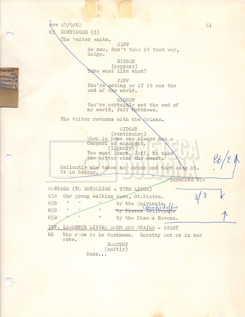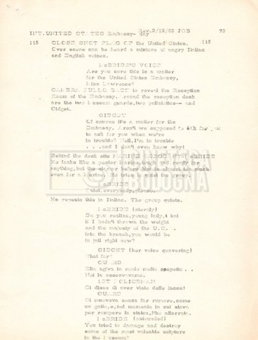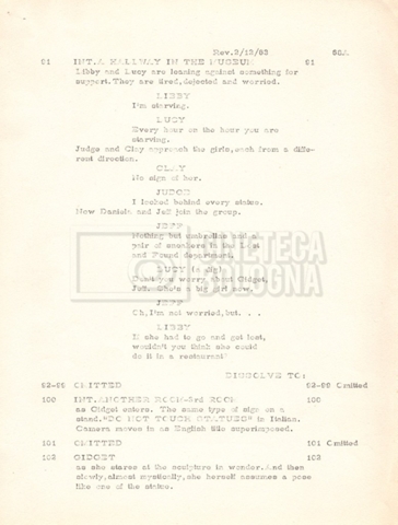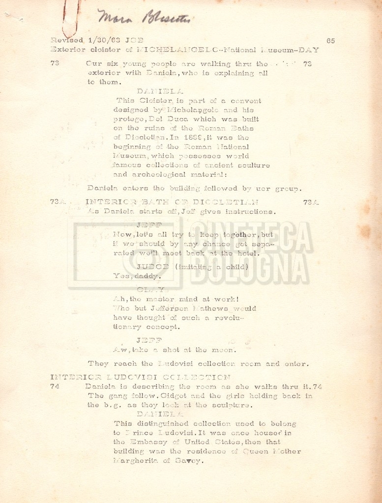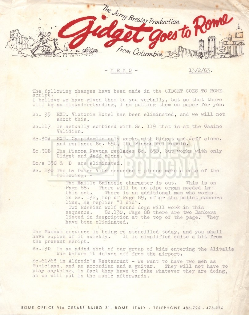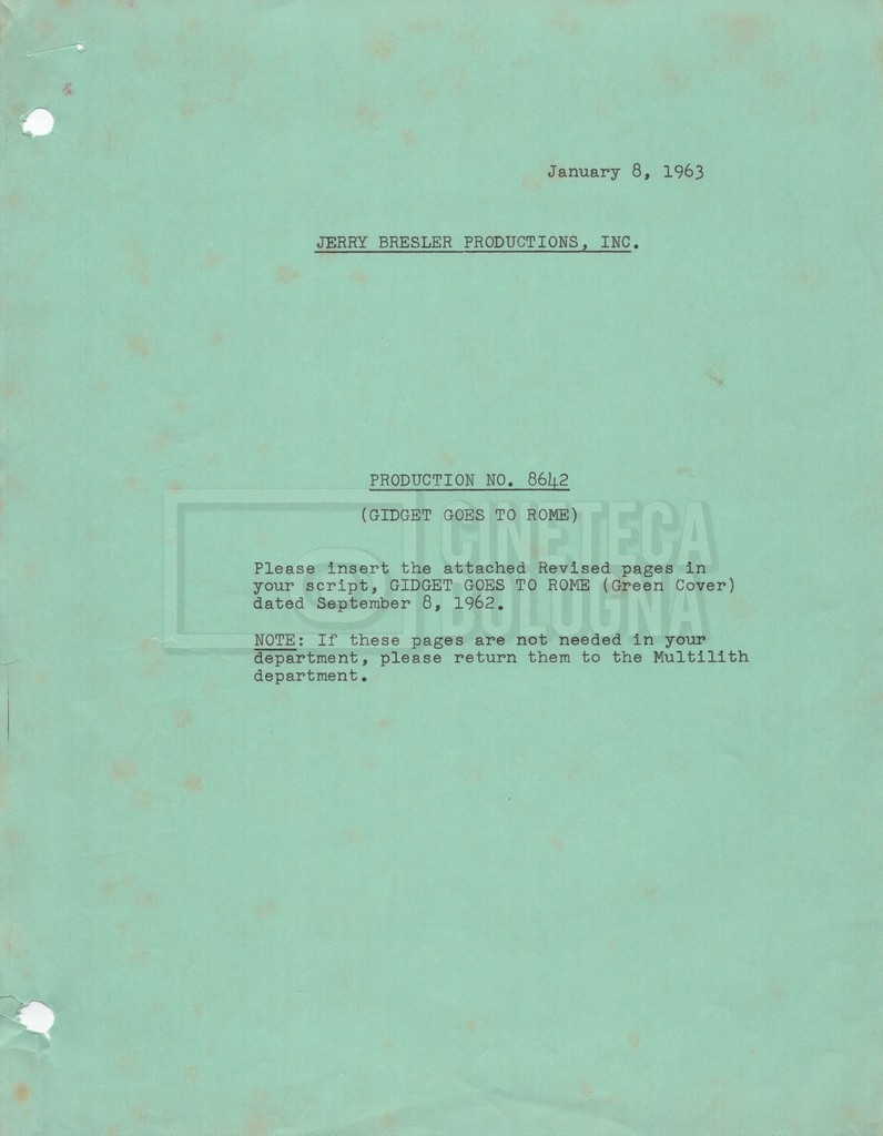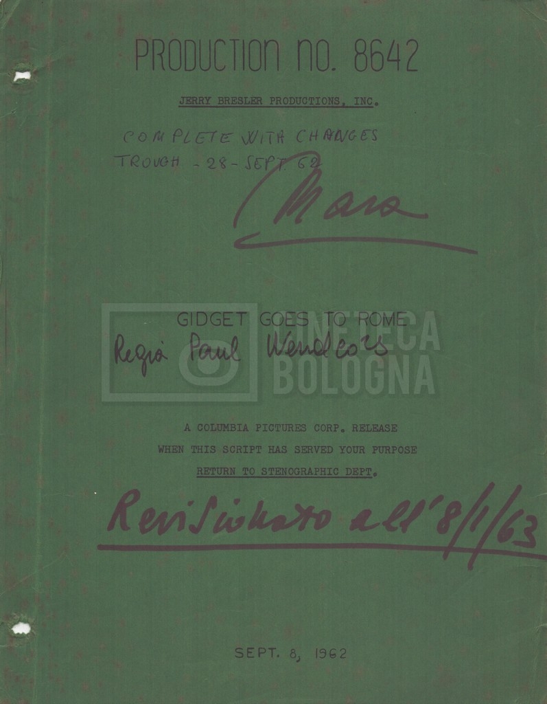 Torna alla banca dati “Gidget Goes to Rome” Documento storico Fondo Mara Blasetti / “Film Mara girati” / Gidget Goes to Rome Ambiti e contenuto Gli autori sono Katherine Eunson e Dale Eunson. Si segnala, inoltre, in allegato alla sceneggiatura, un promemoria con alcuni cambiamenti apportati alla stessa (13 febbraio 1963). Informazioni archivistiche Cronologia: 08 settembre 1962 – 13 febbraio 1963 Numero di ordinamento definitivo: 1.9.3 Numero di ordinamento provvisorio: M1.3 Descrizione fisica: volume Immagini digitalizzate Informazioni sul film titolo originale: Gidget Goes to Rome altri titoli: Gidget a Roma regia: Wendkos, Paul anno: 1963 paese di produzione: Stati Uniti lingua principale: inglese altre lingue: italiana Documenti correlati Vai alla banca dati DOCUMENTO STORICO “Cast e unit lists” DOCUMENTO STORICO Gestione delle riprese e corrispondenza