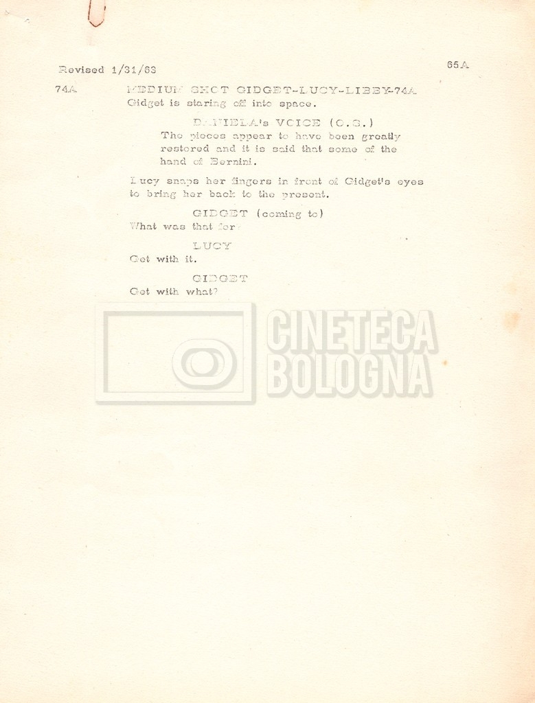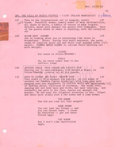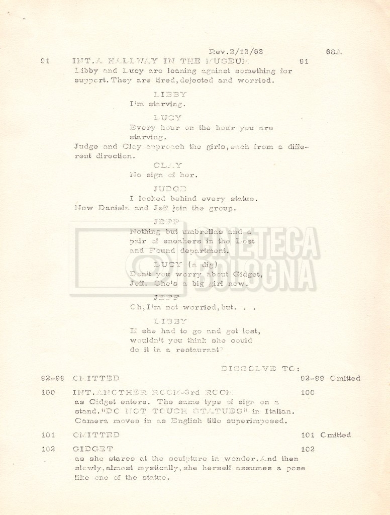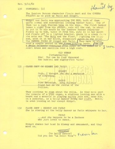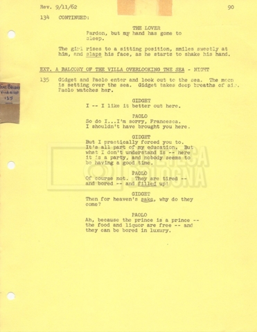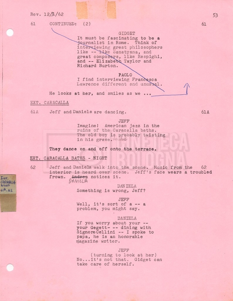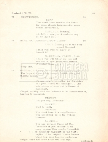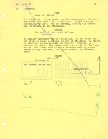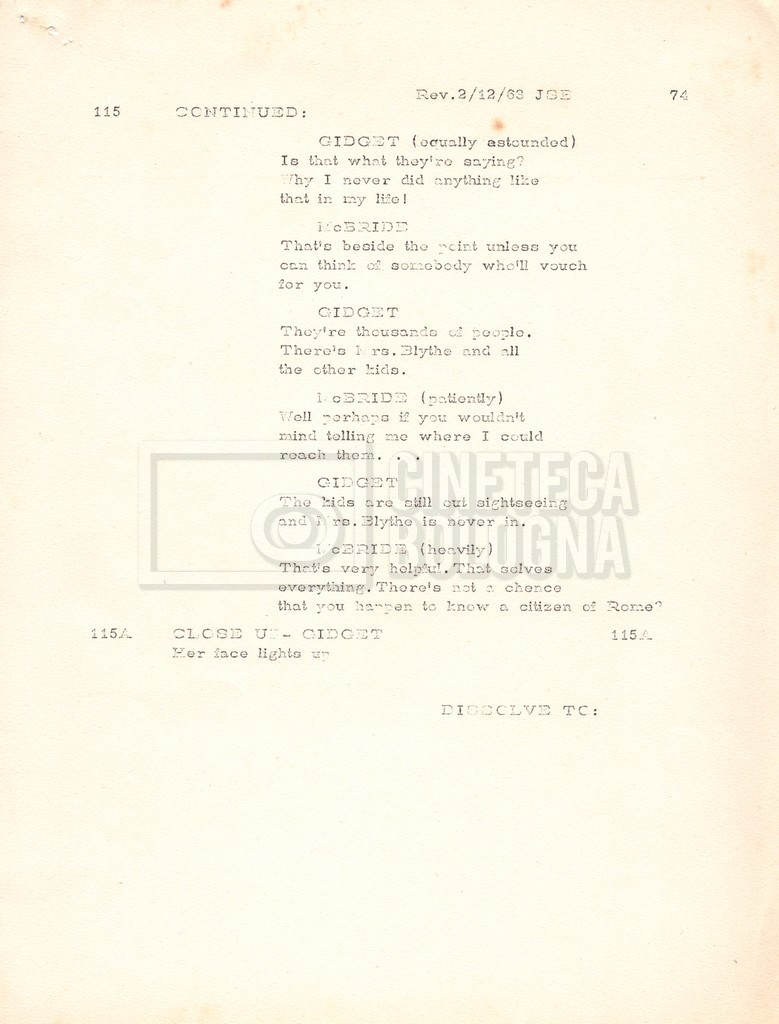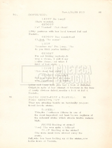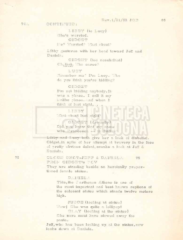 Torna alla banca dati “Gidget Goes to Rome” Documento storico Fondo Mara Blasetti / “Film Mara girati” / Gidget Goes to Rome Ambiti e contenuto Gli autori sono Katherine Eunson e Dale Eunson. Si segnala, inoltre, in allegato alla sceneggiatura, un promemoria con alcuni cambiamenti apportati alla stessa (13 febbraio 1963). Informazioni archivistiche Cronologia: 08 settembre 1962 – 13 febbraio 1963 Numero di ordinamento definitivo: 1.9.3 Numero di ordinamento provvisorio: M1.3 Descrizione fisica: volume Immagini digitalizzate Informazioni sul film titolo originale: Gidget Goes to Rome altri titoli: Gidget a Roma regia: Wendkos, Paul anno: 1963 paese di produzione: Stati Uniti lingua principale: inglese altre lingue: italiana Documenti correlati Vai alla banca dati DOCUMENTO STORICO “Cast e unit lists” DOCUMENTO STORICO Gestione delle riprese e corrispondenza
