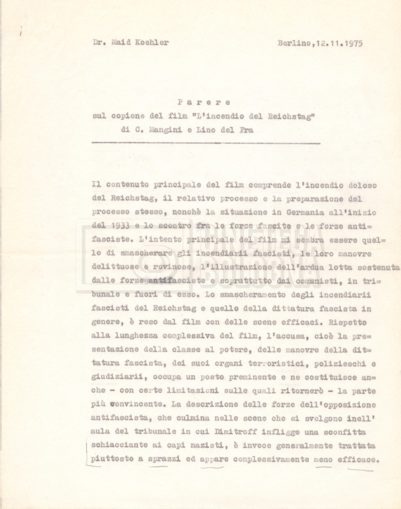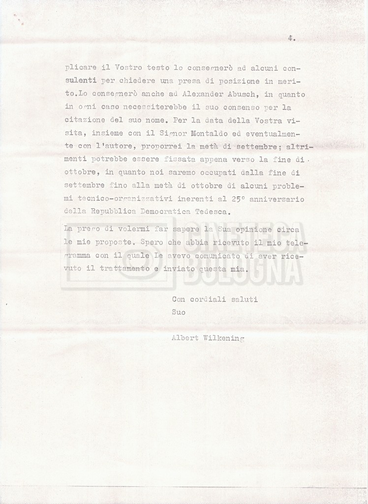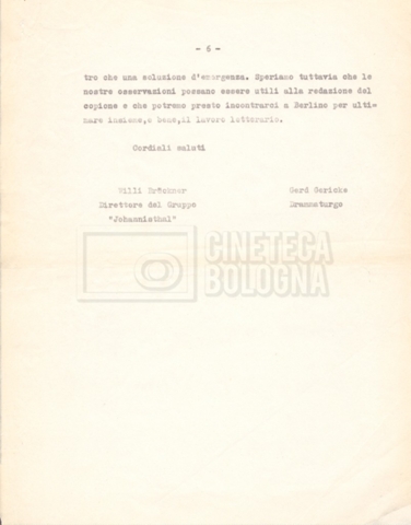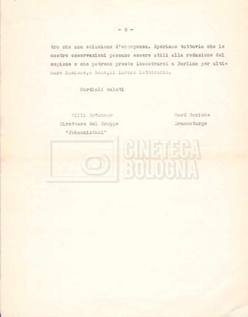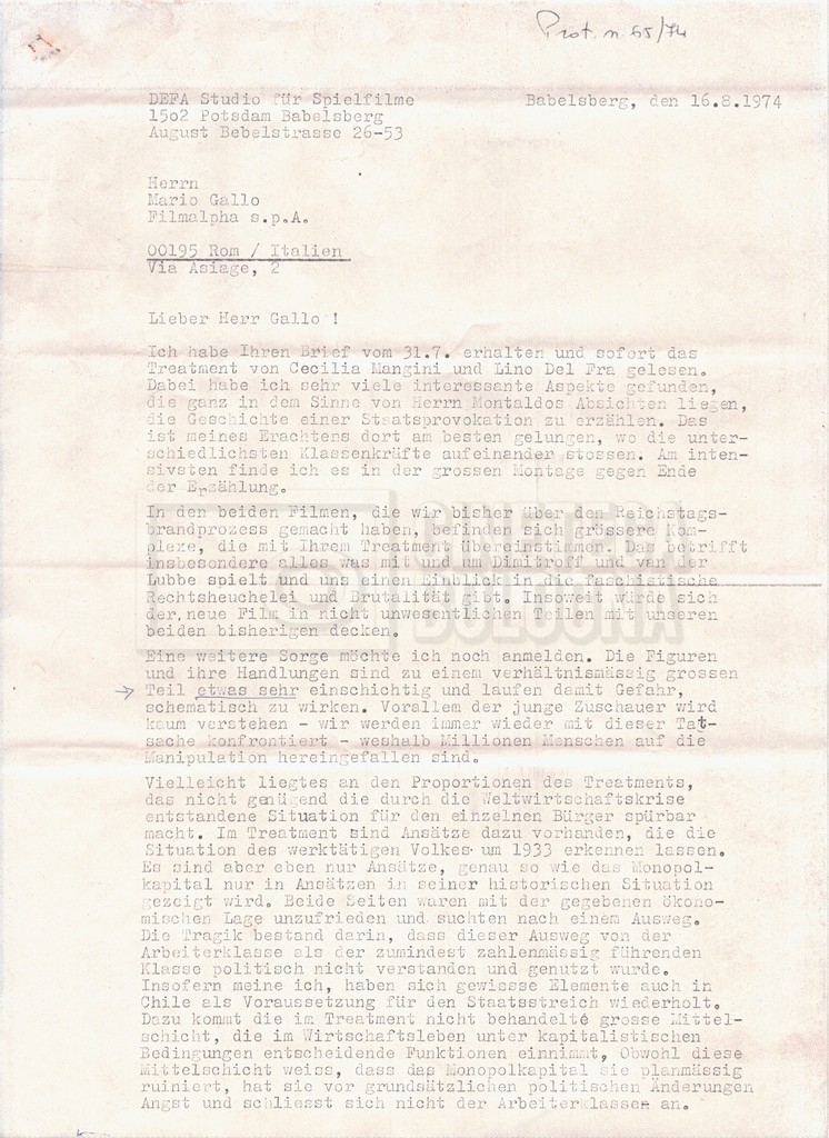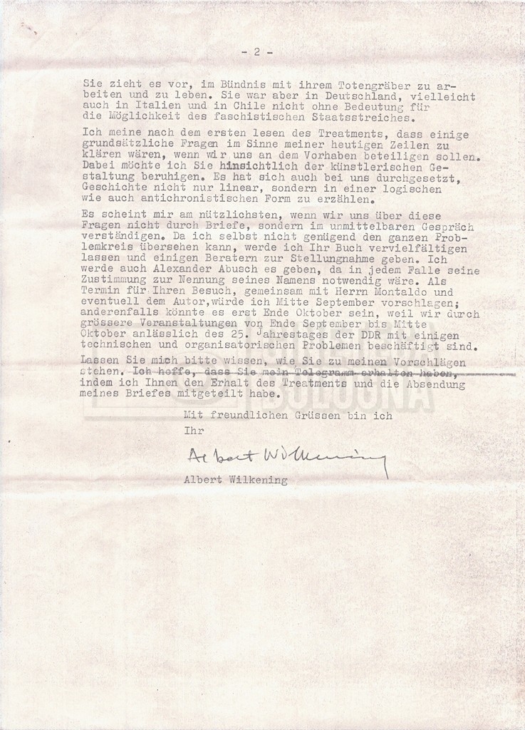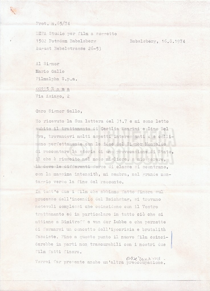 – Una lettera di Albert Wilkening, produttore cinematografico della ‘Deutsche Film AG’ (DEFA), a Mario Gallo, in italiano e in tedesco, con opinioni sul trattamento;