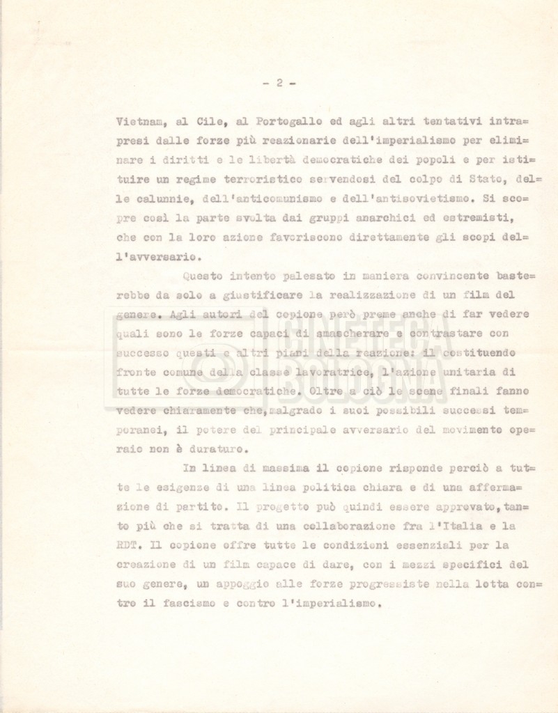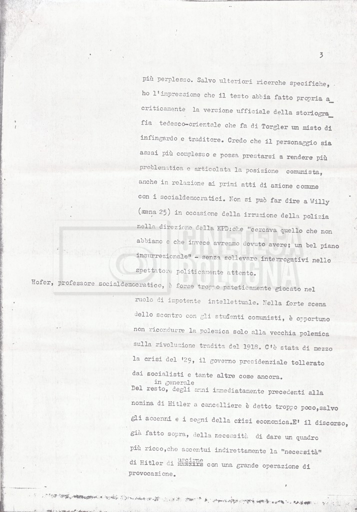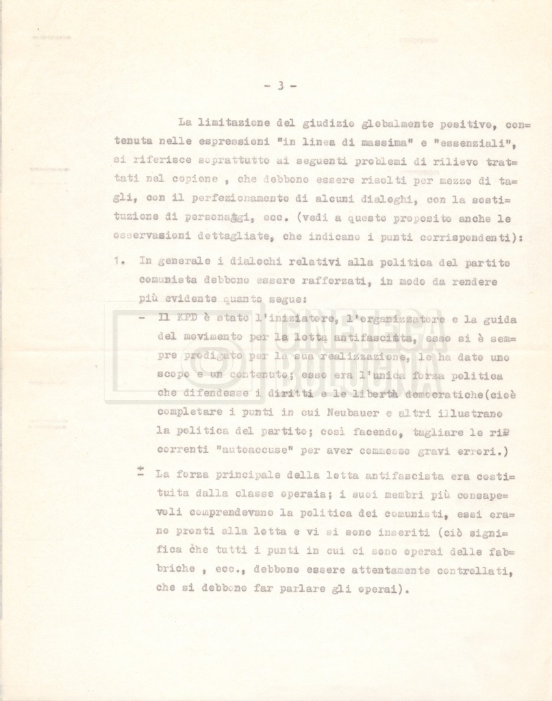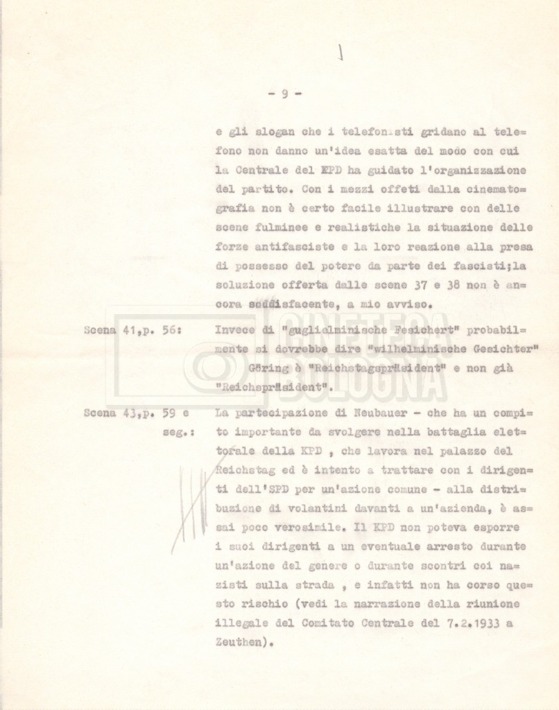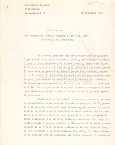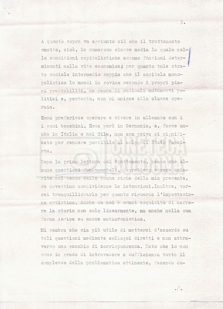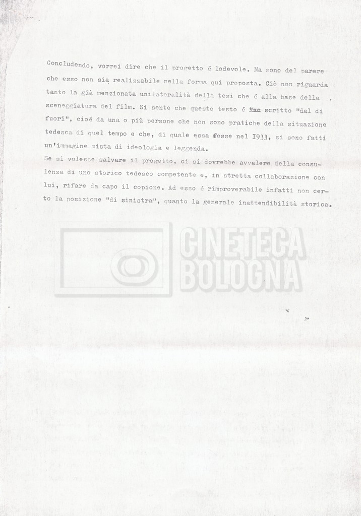 – Una lettera di Albert Wilkening, produttore cinematografico della ‘Deutsche Film AG’ (DEFA), a Mario Gallo, in italiano e in tedesco, con opinioni sul trattamento;