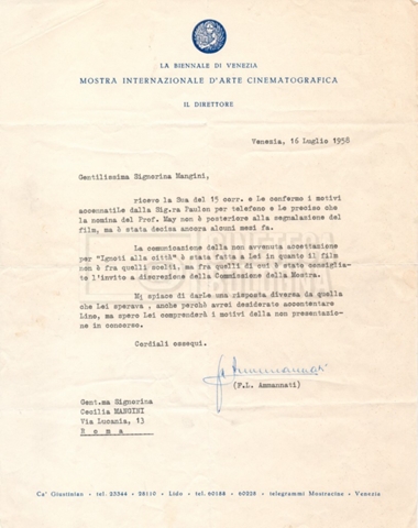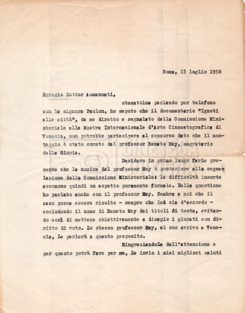 – “Corrispondenza”: si segnala una lettera tra l’on. Francesco de Martino e l’on. sottosegretario Raffaele Resta sulla censura del documentario (s.d.) e carteggio tra Mangini e Floris Luigi Ammanati per l’esclusione del documentario dalla ‘Mostra cinematografica biennale di Venezia’, in quanto il montaggio è stato curato da Renato May, segretario della giuria della mostra stessa (1968);