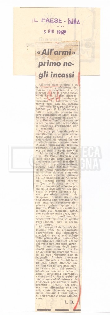 Contiene rassegna stampa a proposito degli incassi del film.