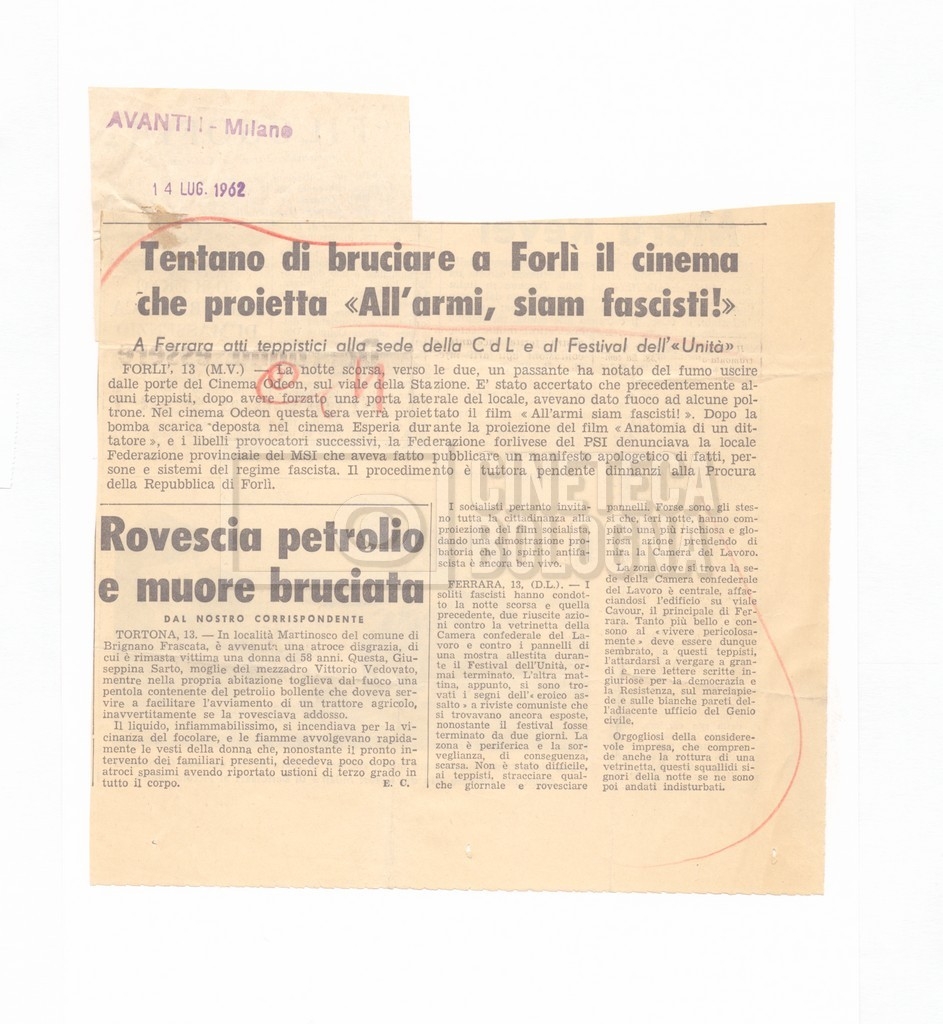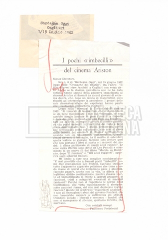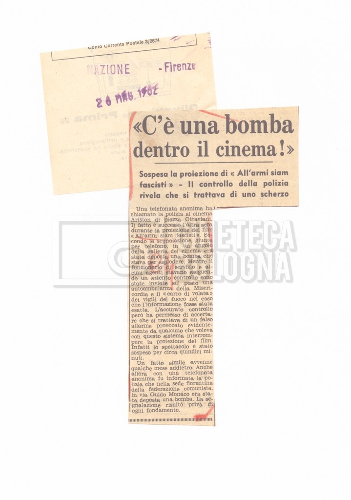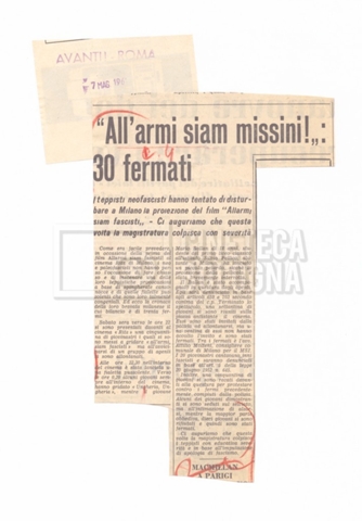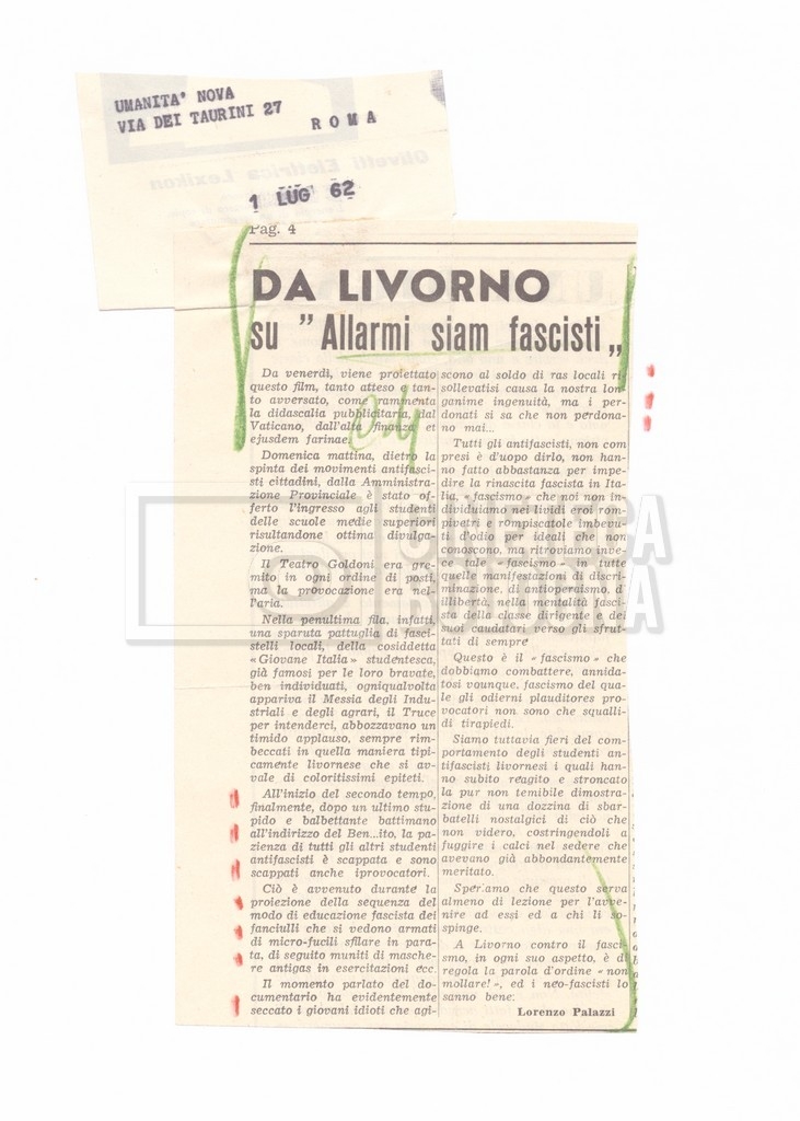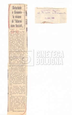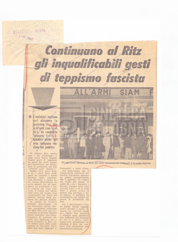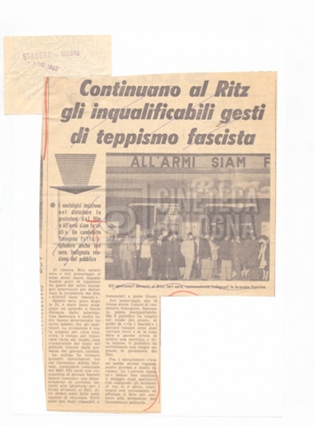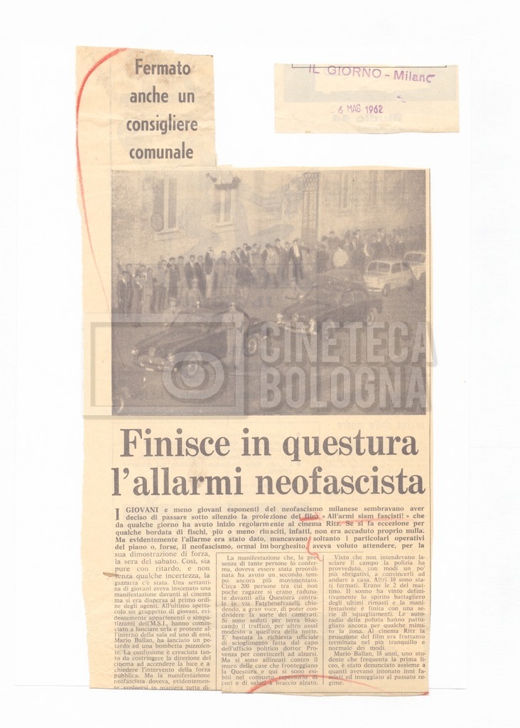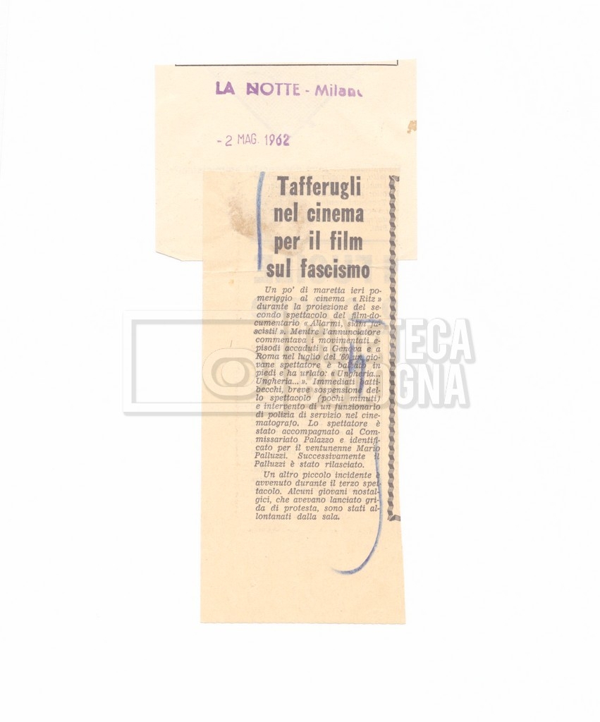 Contiene rassegna stampa a proposito di incidenti avvenuti in altre città italiane, oltre a Roma, legati al film.