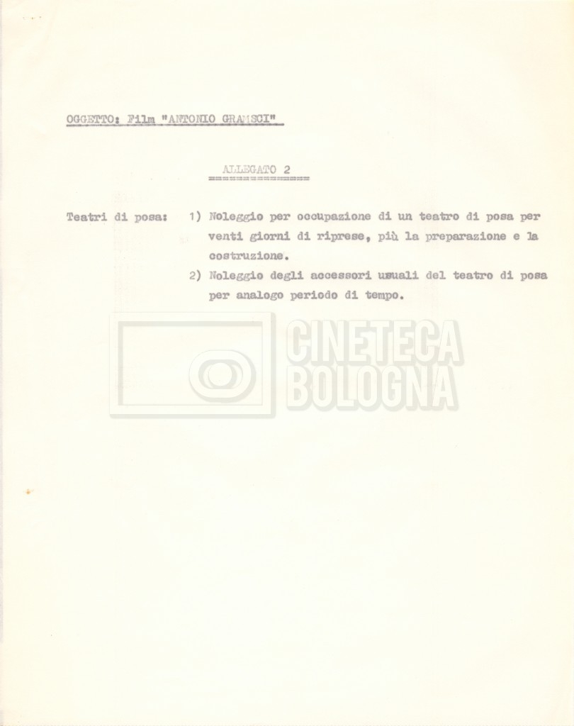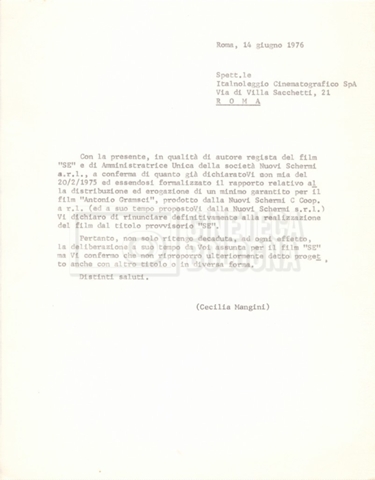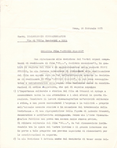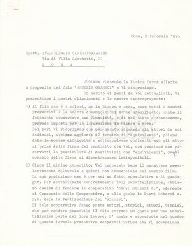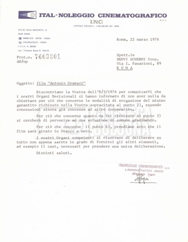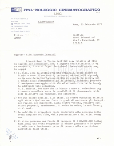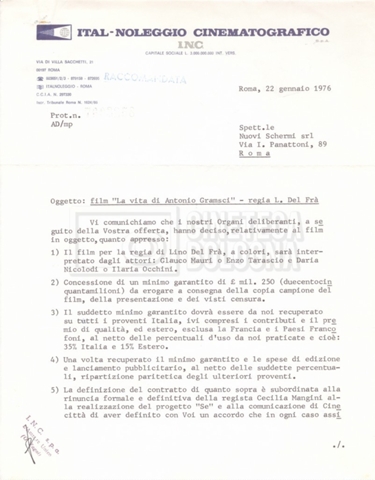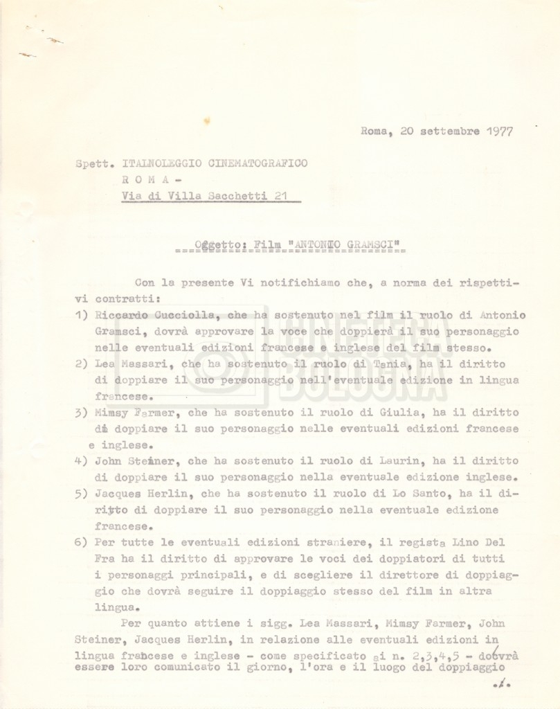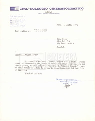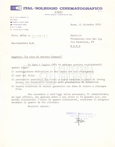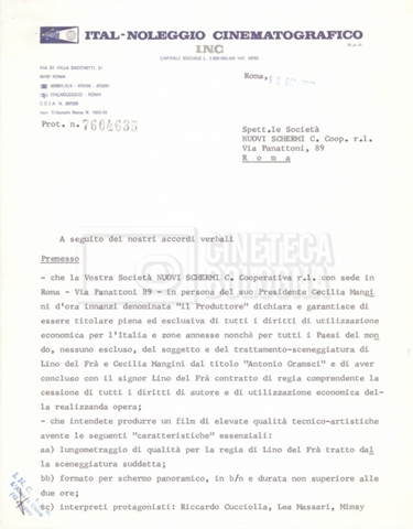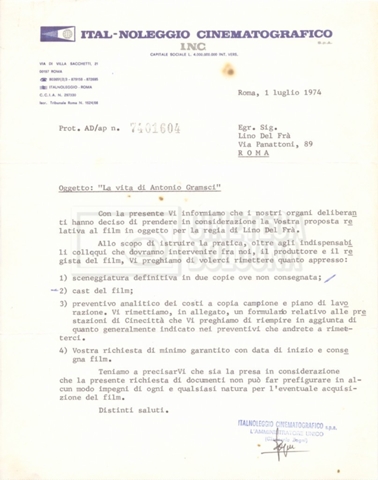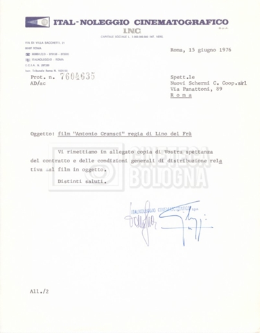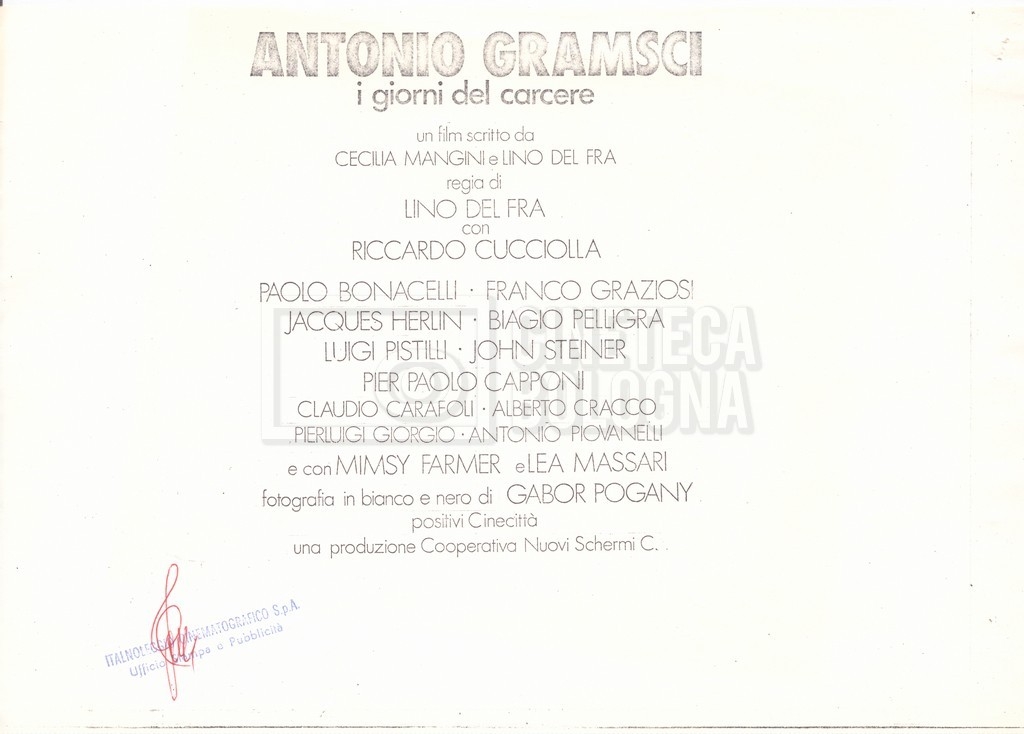 Torna alla banca dati “Italnoleggio” Documento storico Fondo Cecilia Mangini – Lino Del Fra / “Film di fiction realizzati” / “Antonio Gramsci – I giorni del carcere” Ambiti e contenuto Contiene documentazione riguardante la produzione e la distribuzione del film. Informazioni archivistiche Cronologia: 03 maggio 1973 – 05 febbraio 1980 Numero di ordinamento definitivo: 4.2.36 Numero di ordinamento provvisorio: 18.08 Descrizione fisica: fascicolo Immagini digitalizzate Informazioni sul film titolo originale: Antonio Gramsci – I giorni del carcere regia: Del Fra, Lino anno: 1977 paese di produzione: Italia lingua principale: italiana Documenti correlati Vai alla banca dati DOCUMENTO STORICO “Preventivo; piano di lavorazione (il primo)” DOCUMENTO STORICO “Prima versione sceneggiatura; scaletta desunta” DOCUMENTO STORICO “Il soggetto stampato; trattamento; trattamento in francese” DOCUMENTO STORICO “Diari di lavorazione” DOCUMENTO STORICO “Appunti per la sceneggiatura” DOCUMENTO STORICO “Ordini del giorno” DOCUMENTO STORICO “Il casting; gli ambienti” DOCUMENTO STORICO “Durante le riprese” DOCUMENTO STORICO “I titoli di testa; i titoli di coda; le percentuali di grandezza” DOCUMENTO STORICO “Lettere sul film; nota bene: presidente della Camera dei deputati era Sandro Pertini” DOCUMENTO STORICO “I contratti degli attori” DOCUMENTO STORICO “Scene soppresse” DOCUMENTO STORICO “Antonio Gramsci; copia edizione” DOCUMENTO STORICO “Antonio Gramsci; sceneggiatura” DOCUMENTO STORICO “Antonio Gramsci; copia doppiaggio” DOCUMENTO STORICO “Antonio Gramsci; dialoghi definitivi per il doppiaggio e per il ministero” DOCUMENTO STORICO “Materiale Italnoleggio” DOCUMENTO STORICO “Interviste a Lino Del Fra” DOCUMENTO STORICO “Riprese” DOCUMENTO STORICO “Corrispondenza con Claude Ledû”