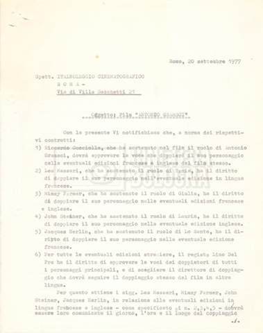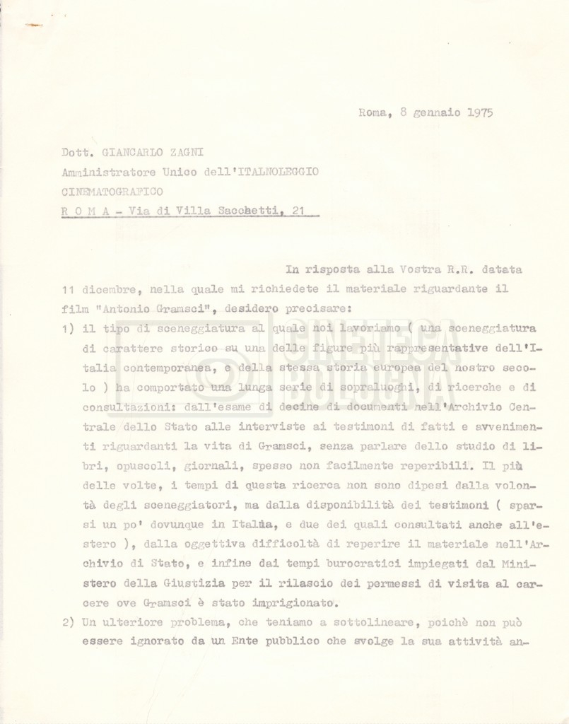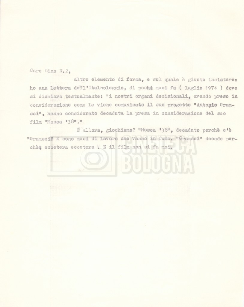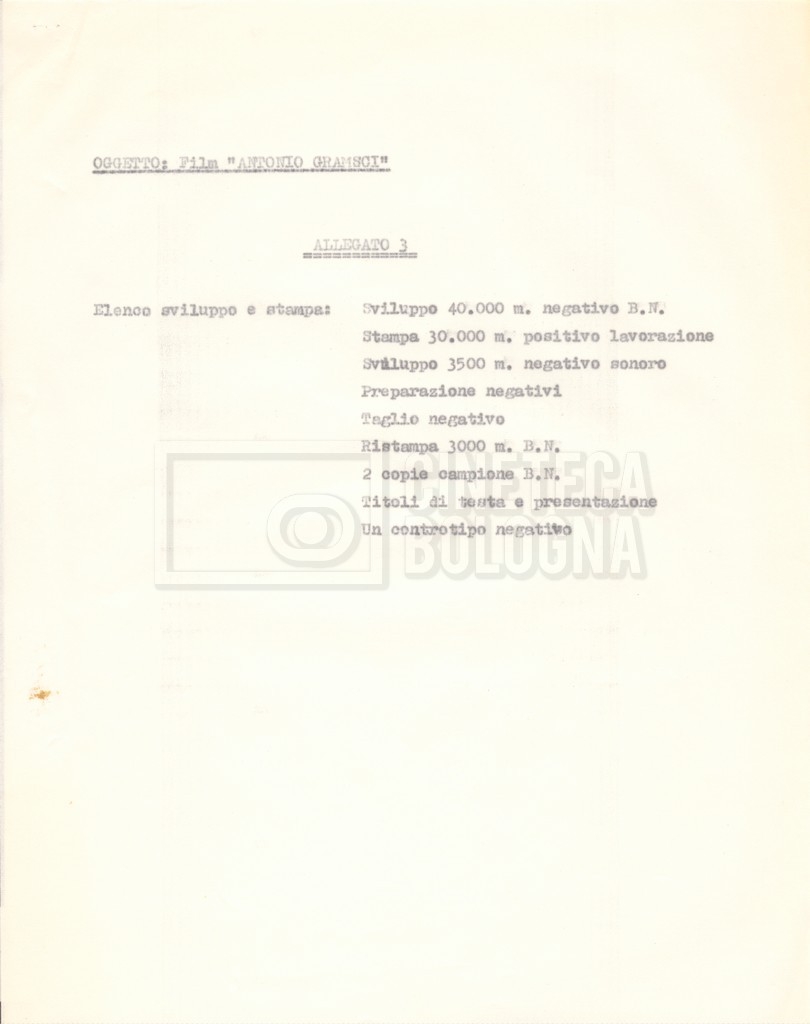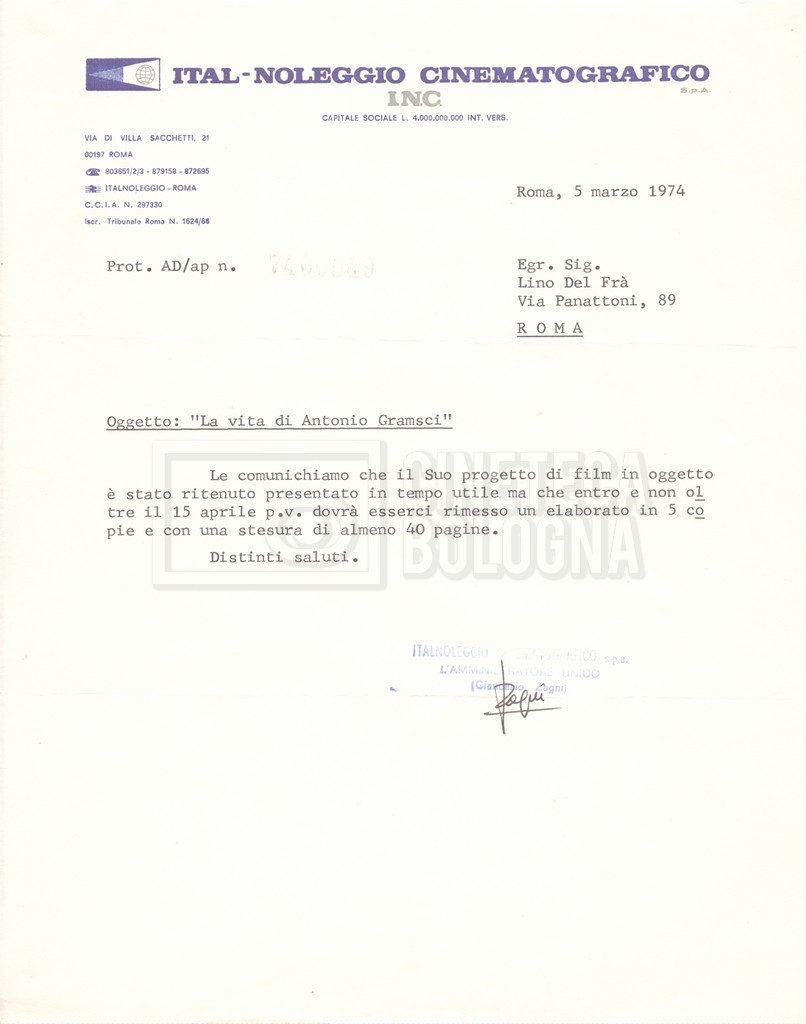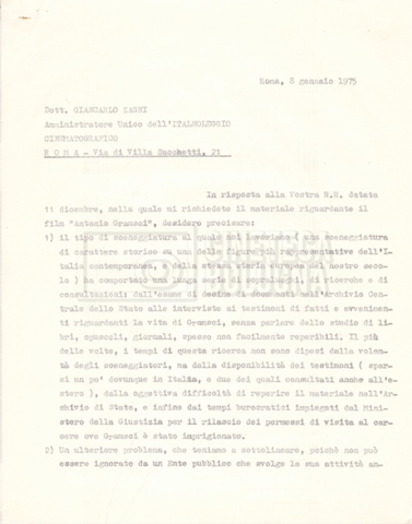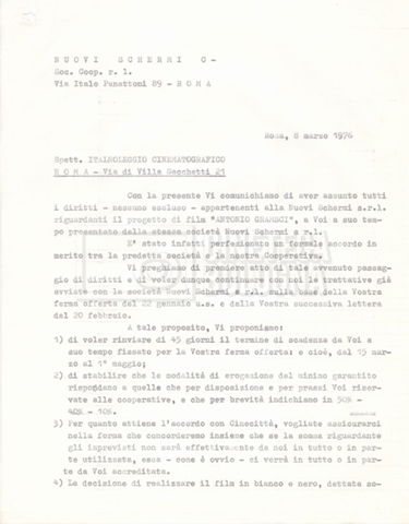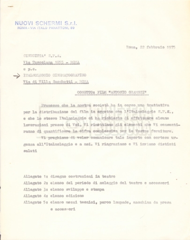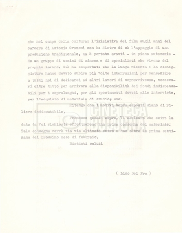 Torna alla banca dati “Italnoleggio” Documento storico Fondo Cecilia Mangini – Lino Del Fra / “Film di fiction realizzati” / “Antonio Gramsci – I giorni del carcere” Ambiti e contenuto Contiene documentazione riguardante la produzione e la distribuzione del film. Informazioni archivistiche Cronologia: 03 maggio 1973 – 05 febbraio 1980 Numero di ordinamento definitivo: 4.2.36 Numero di ordinamento provvisorio: 18.08 Descrizione fisica: fascicolo Immagini digitalizzate Informazioni sul film titolo originale: Antonio Gramsci – I giorni del carcere regia: Del Fra, Lino anno: 1977 paese di produzione: Italia lingua principale: italiana Documenti correlati Vai alla banca dati DOCUMENTO STORICO “Preventivo; piano di lavorazione (il primo)” DOCUMENTO STORICO “Prima versione sceneggiatura; scaletta desunta” DOCUMENTO STORICO “Il soggetto stampato; trattamento; trattamento in francese” DOCUMENTO STORICO “Diari di lavorazione” DOCUMENTO STORICO “Appunti per la sceneggiatura” DOCUMENTO STORICO “Ordini del giorno” DOCUMENTO STORICO “Il casting; gli ambienti” DOCUMENTO STORICO “Durante le riprese” DOCUMENTO STORICO “I titoli di testa; i titoli di coda; le percentuali di grandezza” DOCUMENTO STORICO “Lettere sul film; nota bene: presidente della Camera dei deputati era Sandro Pertini” DOCUMENTO STORICO “I contratti degli attori” DOCUMENTO STORICO “Scene soppresse” DOCUMENTO STORICO “Antonio Gramsci; copia edizione” DOCUMENTO STORICO “Antonio Gramsci; sceneggiatura” DOCUMENTO STORICO “Antonio Gramsci; copia doppiaggio” DOCUMENTO STORICO “Antonio Gramsci; dialoghi definitivi per il doppiaggio e per il ministero” DOCUMENTO STORICO “Materiale Italnoleggio” DOCUMENTO STORICO “Interviste a Lino Del Fra” DOCUMENTO STORICO “Riprese” DOCUMENTO STORICO “Corrispondenza con Claude Ledû”
