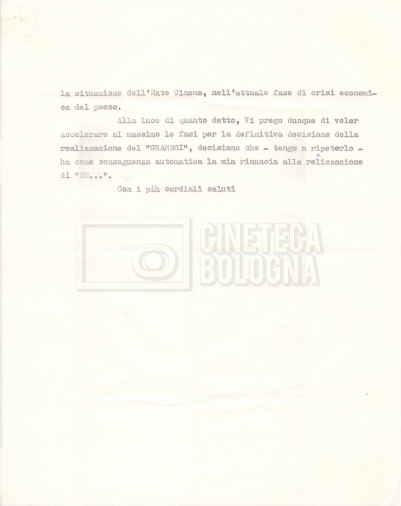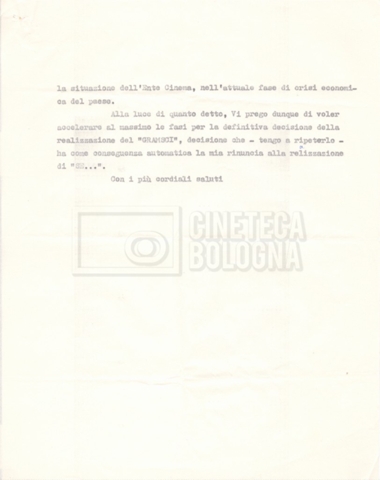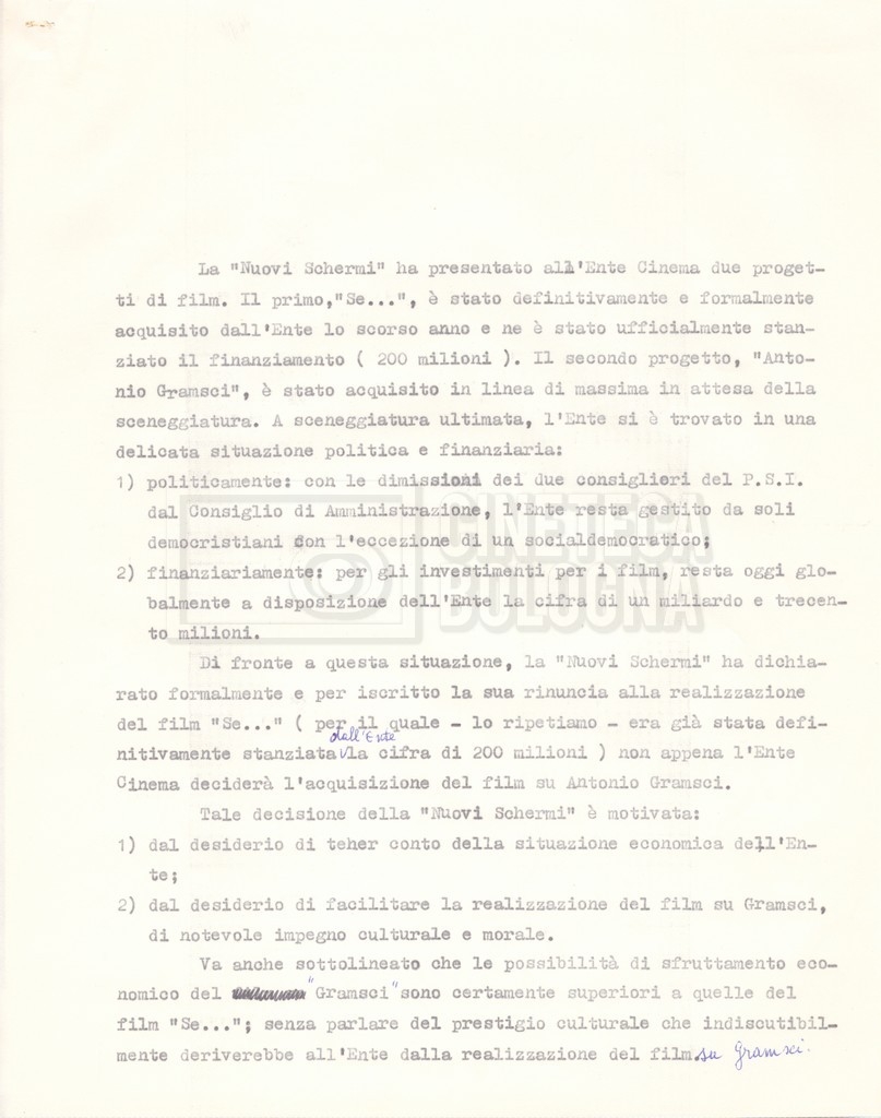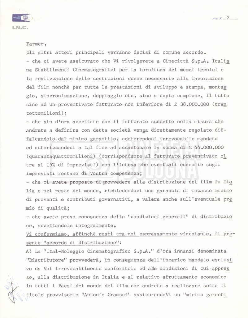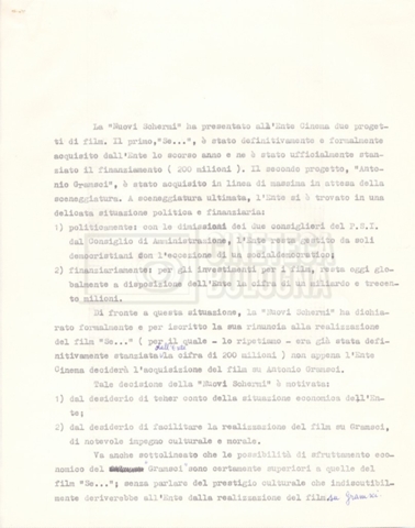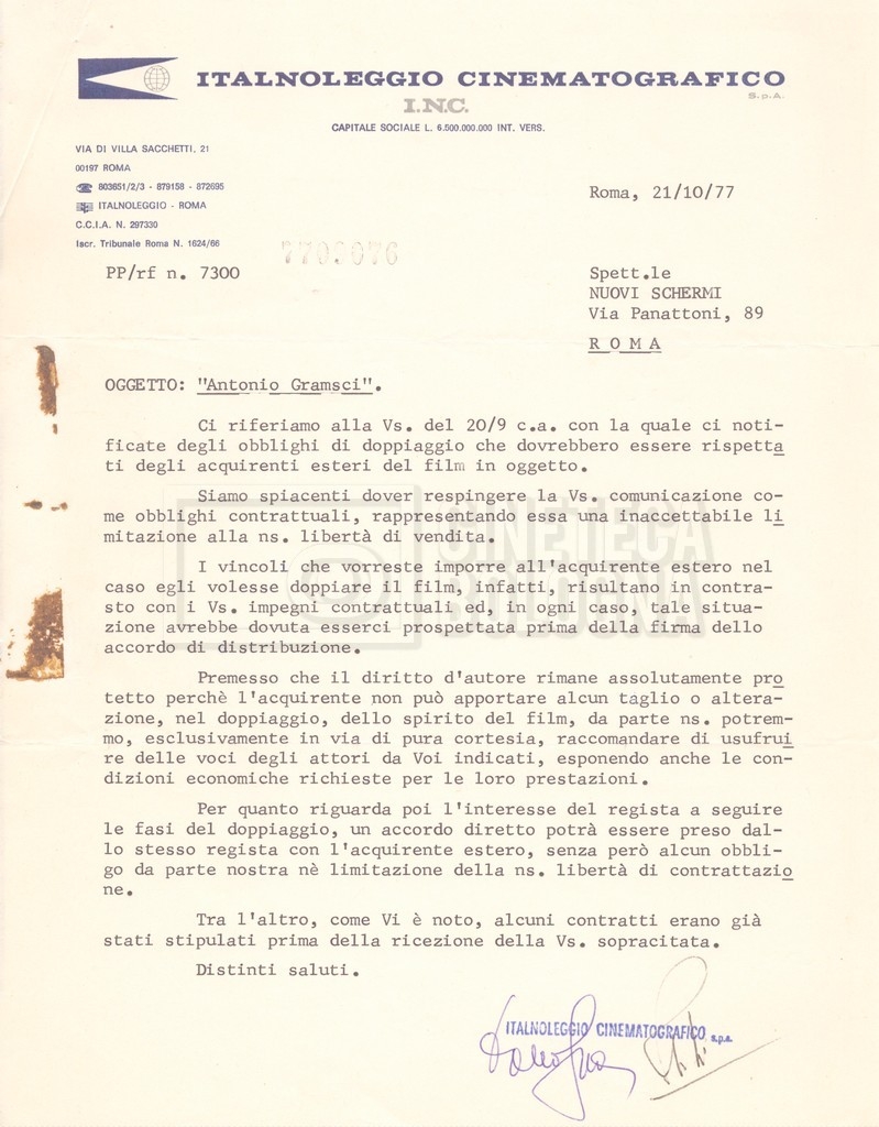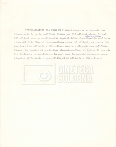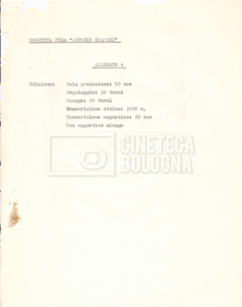 Torna alla banca dati “Italnoleggio” Documento storico Fondo Cecilia Mangini – Lino Del Fra / “Film di fiction realizzati” / “Antonio Gramsci – I giorni del carcere” Ambiti e contenuto Contiene documentazione riguardante la produzione e la distribuzione del film. Informazioni archivistiche Cronologia: 03 maggio 1973 – 05 febbraio 1980 Numero di ordinamento definitivo: 4.2.36 Numero di ordinamento provvisorio: 18.08 Descrizione fisica: fascicolo Immagini digitalizzate Informazioni sul film titolo originale: Antonio Gramsci – I giorni del carcere regia: Del Fra, Lino anno: 1977 paese di produzione: Italia lingua principale: italiana Documenti correlati Vai alla banca dati DOCUMENTO STORICO “Preventivo; piano di lavorazione (il primo)” DOCUMENTO STORICO “Prima versione sceneggiatura; scaletta desunta” DOCUMENTO STORICO “Il soggetto stampato; trattamento; trattamento in francese” DOCUMENTO STORICO “Diari di lavorazione” DOCUMENTO STORICO “Appunti per la sceneggiatura” DOCUMENTO STORICO “Ordini del giorno” DOCUMENTO STORICO “Il casting; gli ambienti” DOCUMENTO STORICO “Durante le riprese” DOCUMENTO STORICO “I titoli di testa; i titoli di coda; le percentuali di grandezza” DOCUMENTO STORICO “Lettere sul film; nota bene: presidente della Camera dei deputati era Sandro Pertini” DOCUMENTO STORICO “I contratti degli attori” DOCUMENTO STORICO “Scene soppresse” DOCUMENTO STORICO “Antonio Gramsci; copia edizione” DOCUMENTO STORICO “Antonio Gramsci; sceneggiatura” DOCUMENTO STORICO “Antonio Gramsci; copia doppiaggio” DOCUMENTO STORICO “Antonio Gramsci; dialoghi definitivi per il doppiaggio e per il ministero” DOCUMENTO STORICO “Materiale Italnoleggio” DOCUMENTO STORICO “Interviste a Lino Del Fra” DOCUMENTO STORICO “Riprese” DOCUMENTO STORICO “Corrispondenza con Claude Ledû”