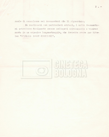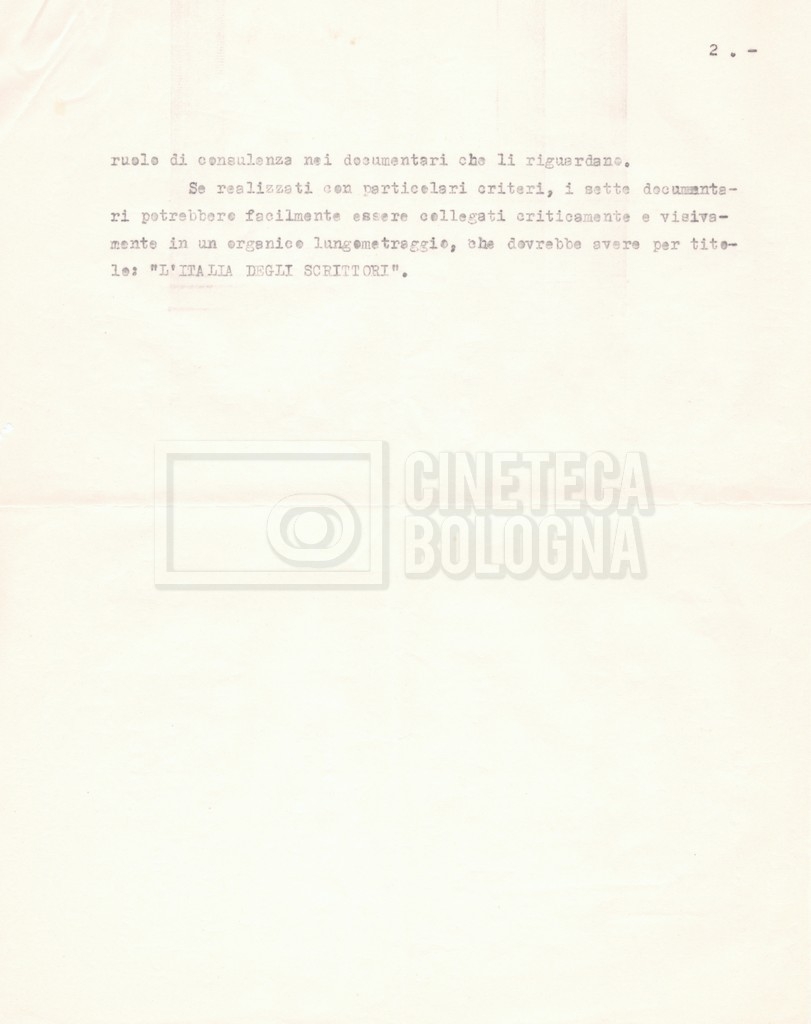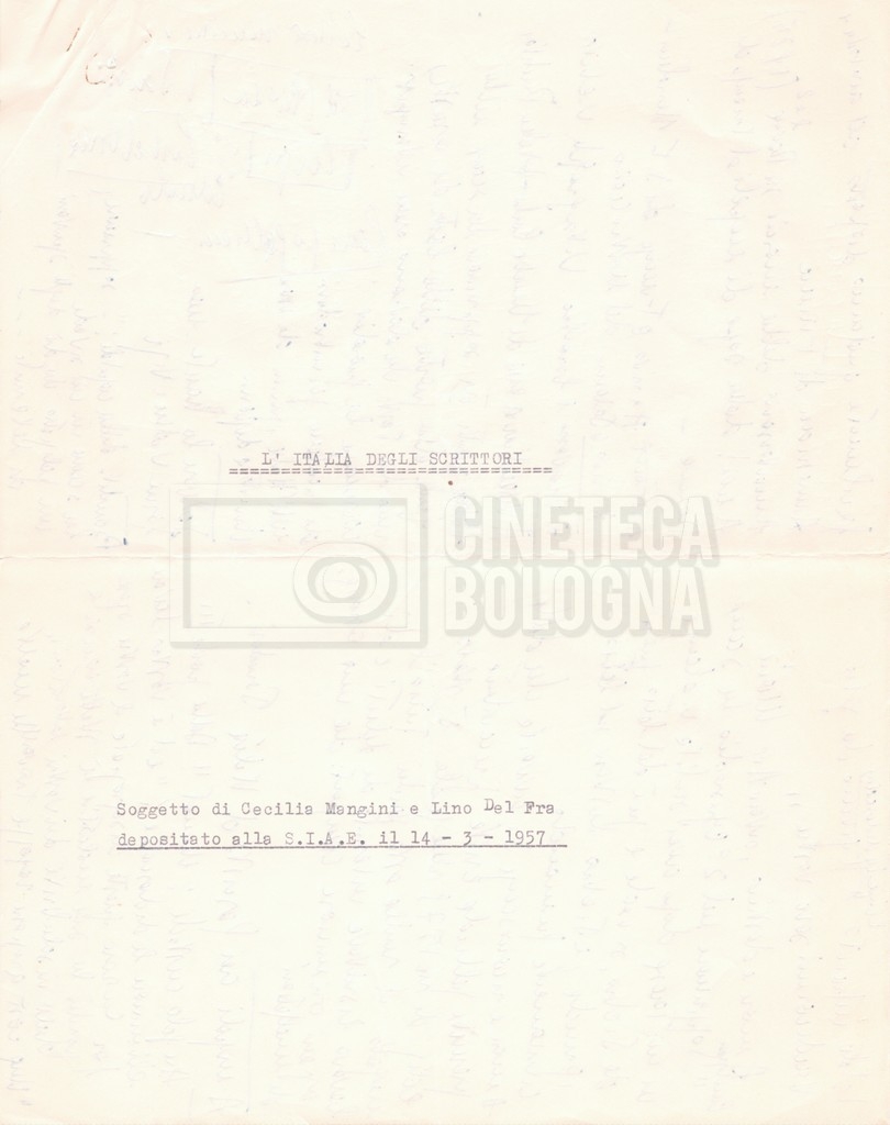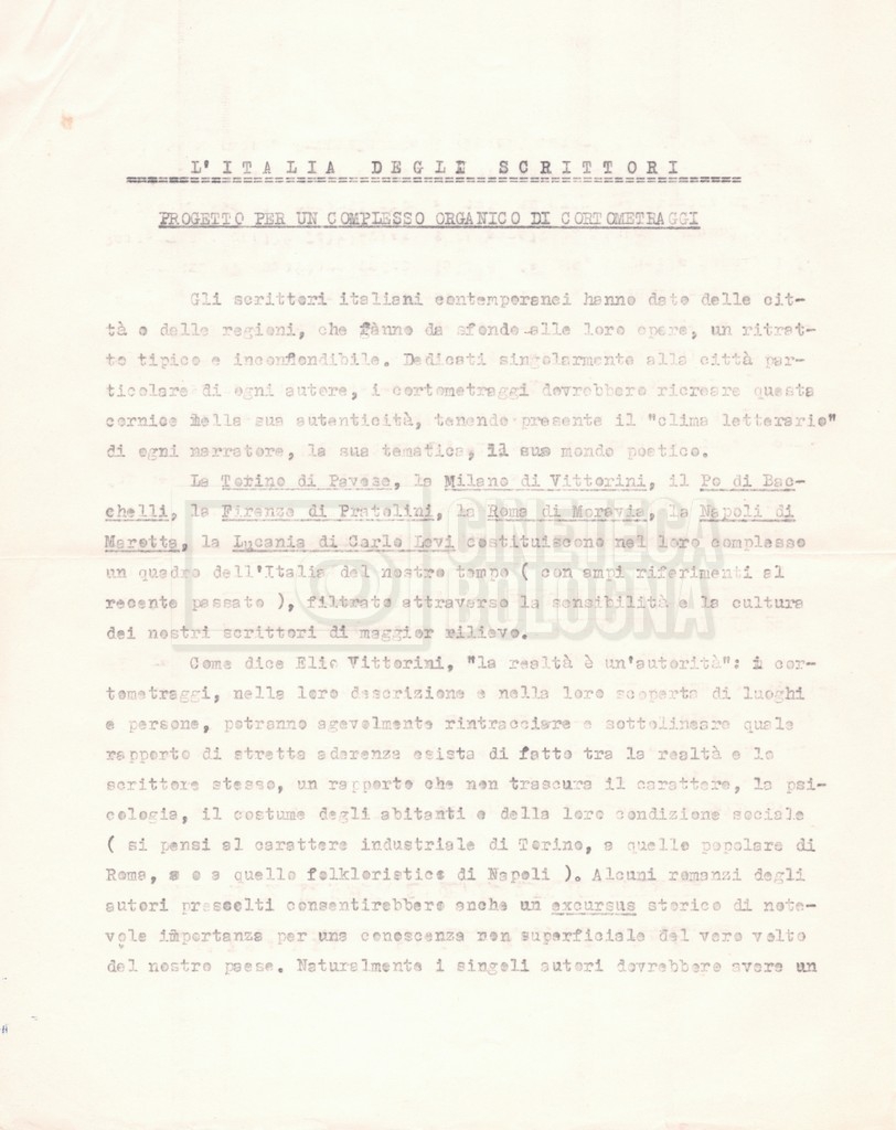 Progetto, firmato da Mangini e Del Fra, per un complesso organico di cortometraggi sugli scrittori italiani contemporanei: “la Torino di Pavese”, “la Milano di Vittorini”, “il Po di Bacchelli”, “la Firenze di Pratolini”, “la Roma di Moravia”, “la Napoli di Marotta”, “la Lucania di Carlo Levi”. L’unico documentario effettivamente realizzato da Cecilia Mangini è stato Firenze di Pratolini.