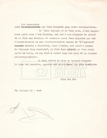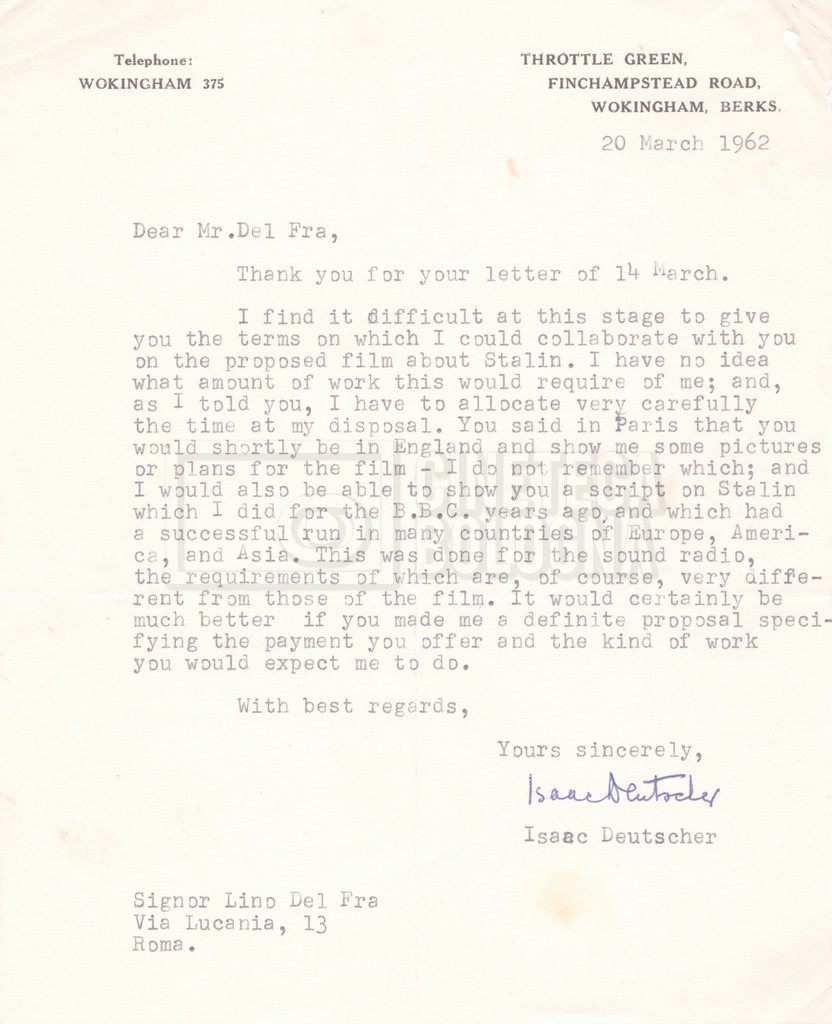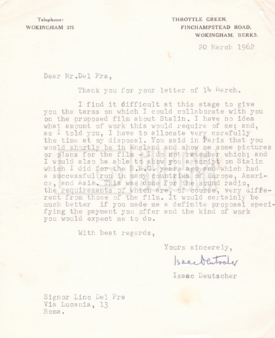 – Corrispondenza tra Lino Del Fra e Isaac Deutscher, storico polacco, in merito alla possibile partecipazione di quest’ultimo alla realizzazione del documentario;