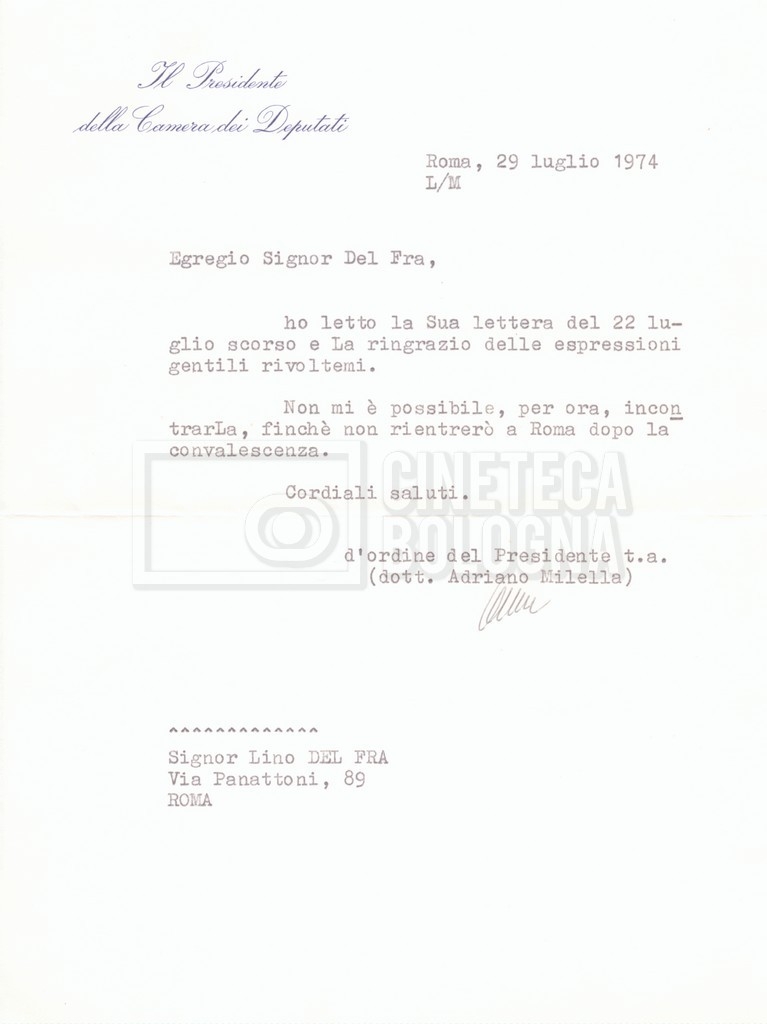 – Corrispondenza tra Lino Del Fra e il presidente della Camera dei deputati, Sandro Pertini, riguardo al film;