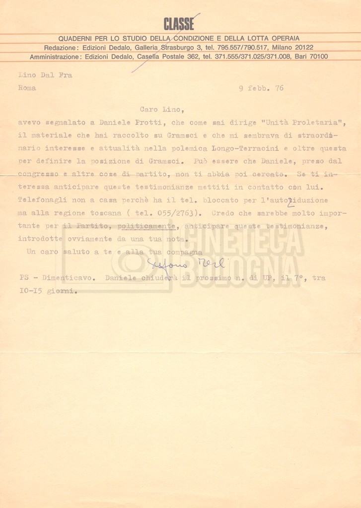 – Una lettera datt. di Stefano Merli per spronare Lino Del Fra a mettersi in contatto con Daniele Protti, dirigente del ‘Partito di unità proletaria’ (PDUP);