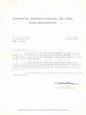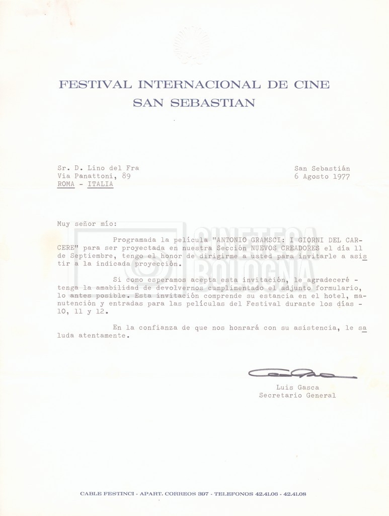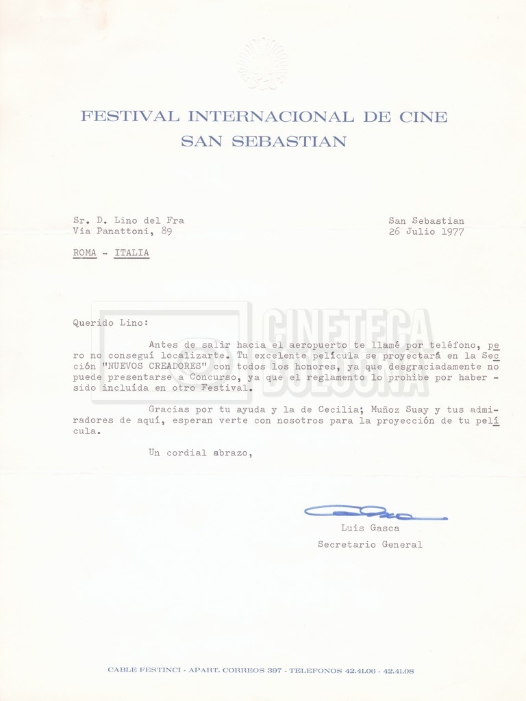 – Una lettera da Luis Gasca, segretario generale del ‘Festival internacional de Cine San Sebastian’, a Lino del Fra;