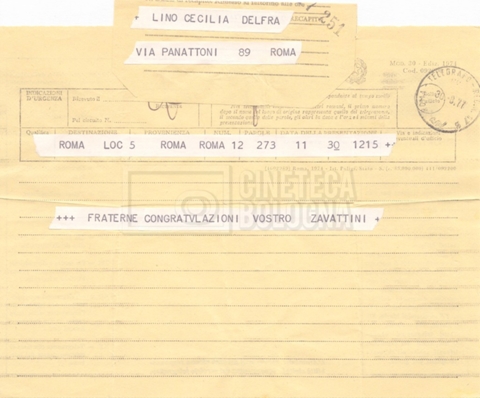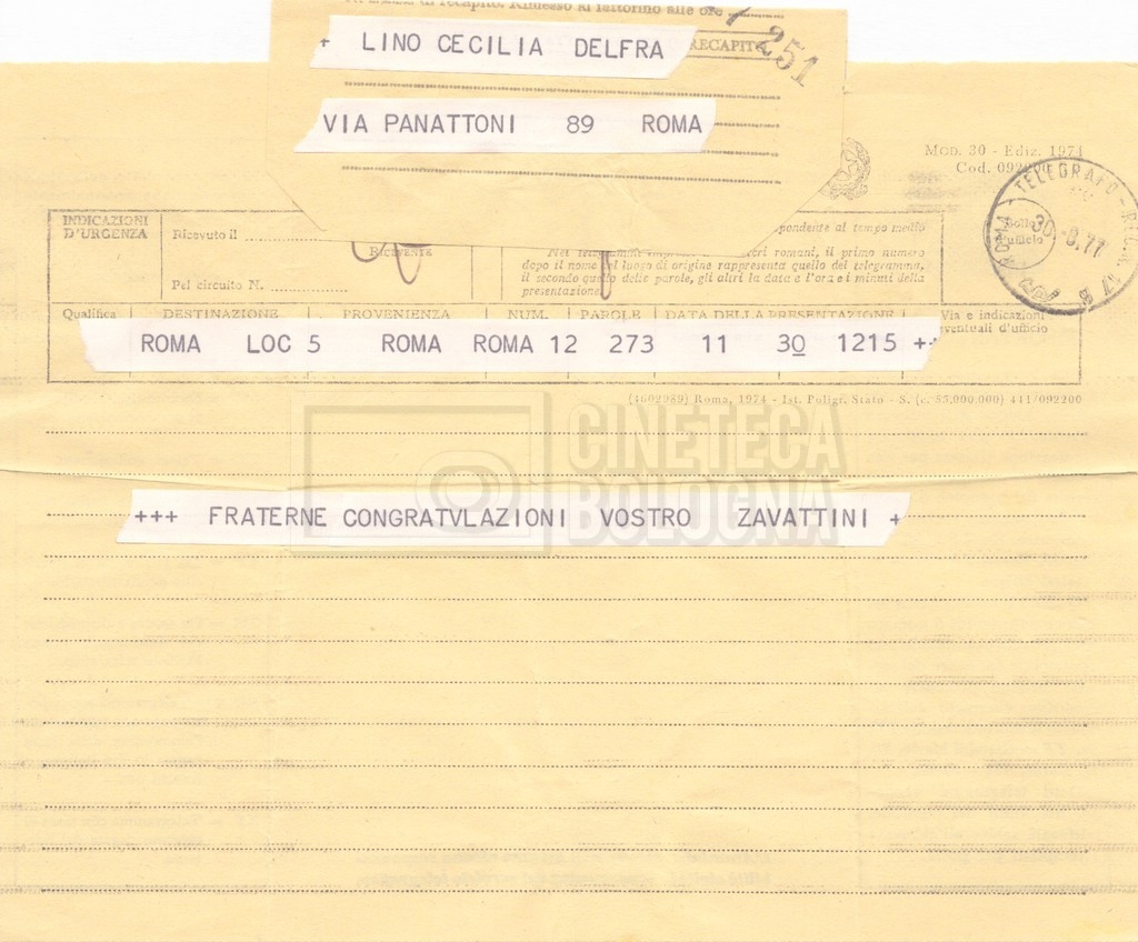 – Lettere, telegrammi e biglietti di congratulazioni e auguri per il film e per il suo successo al Festival di Locarno;
