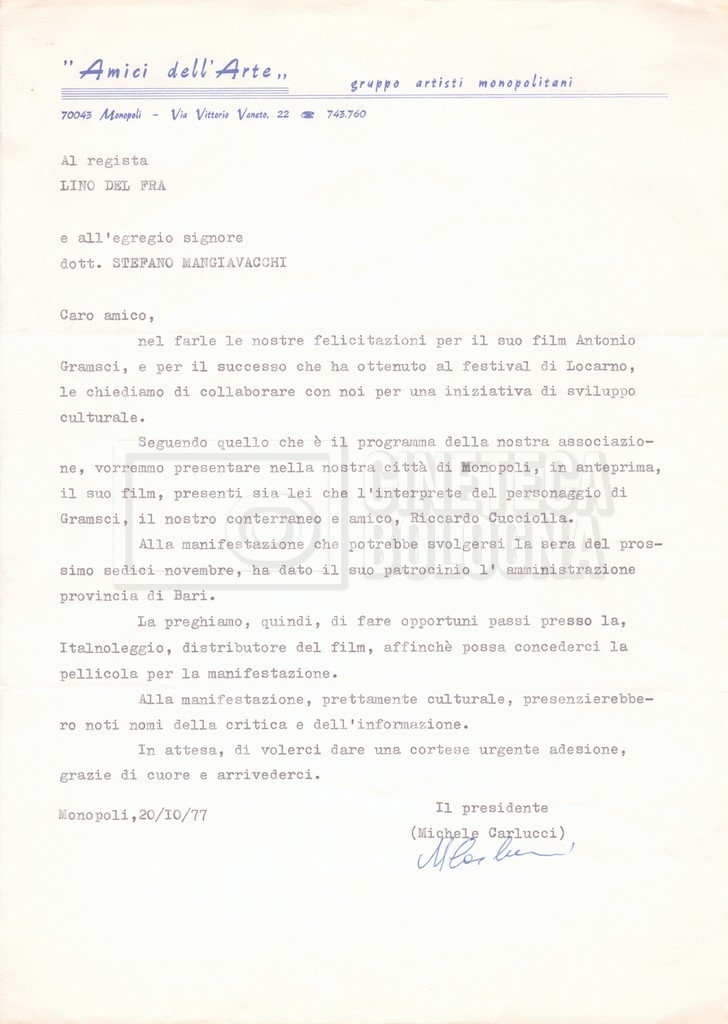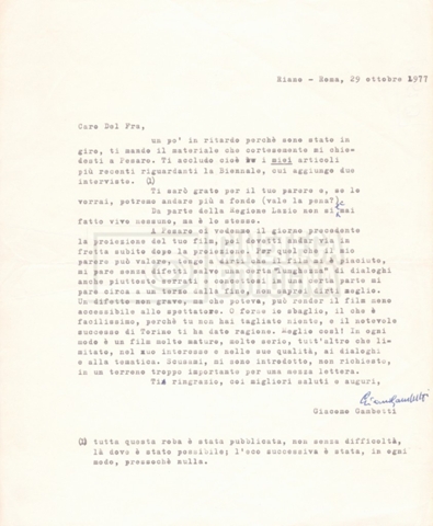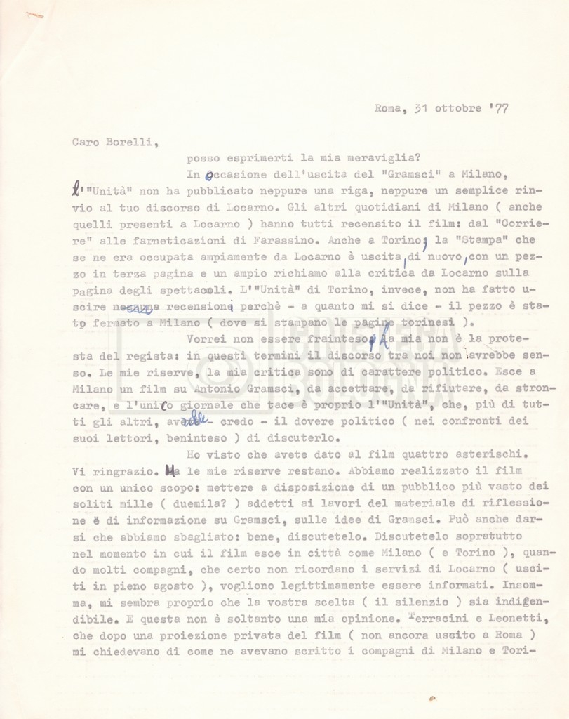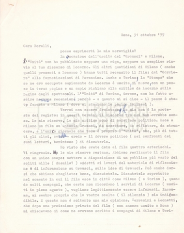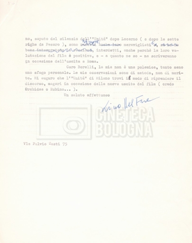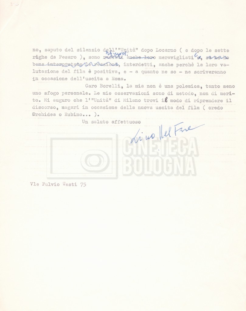 – Una lettera datt. di Lino del Fra a Giulio Borelli per chiedere al giornale l’Unità di scrivere del suo film;