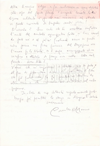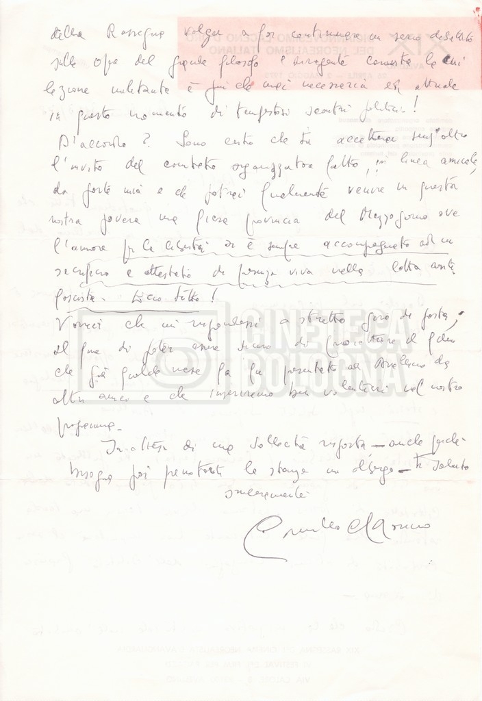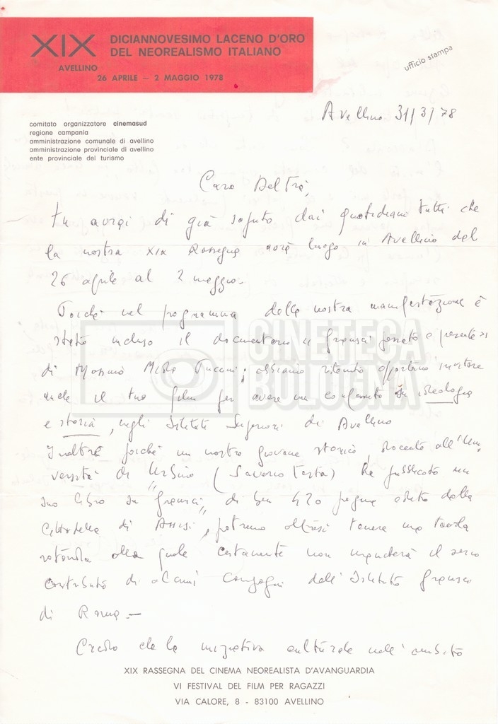 – Una lettera mss. di Camillo Marino per l’invito di Lino Del Fra ad una rassegna del cinema d’avanguardia chiamata ‘Laceno d’oro’;