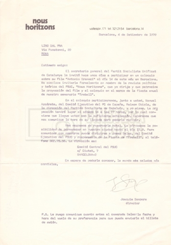– Un invito a Lino del Fra da parte di Joaquim Sempere per un colloquio sul suo film.
