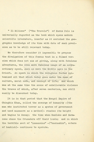 Trattasi di un trattamento di Italo Calvino. Si segnala, in allegato, la bozza di un articolo di ignoto sulle vicende dell’intero progetto di Franco Cristaldi per la casa cinematografica “Vides”, scritto su carta intestata del periodico “L’Espresso”.