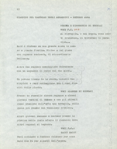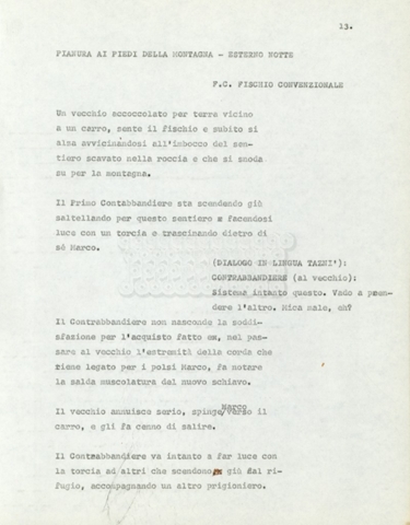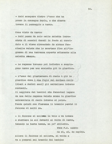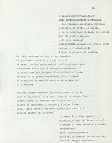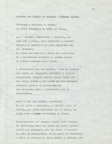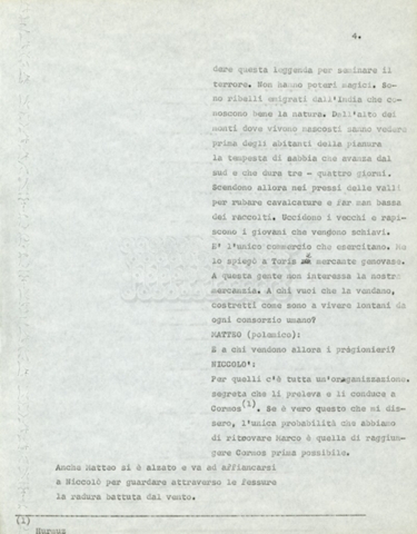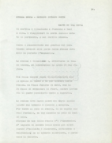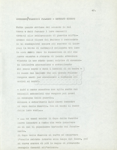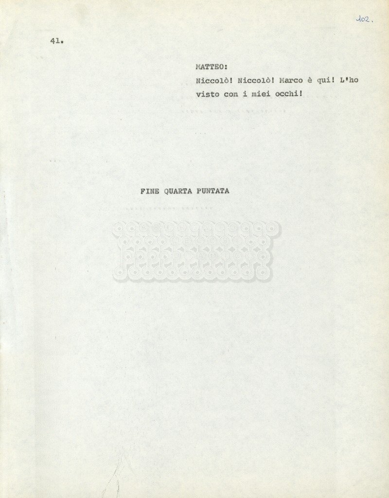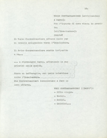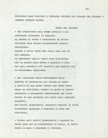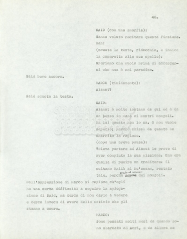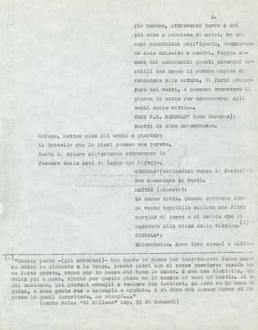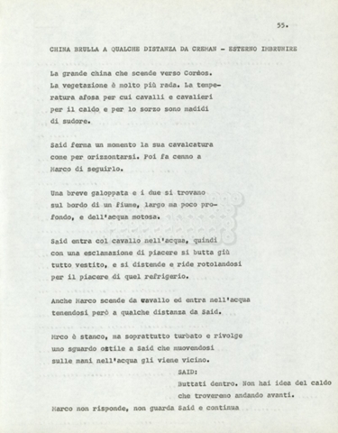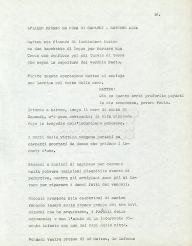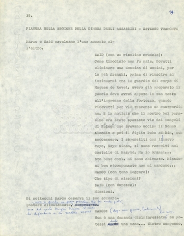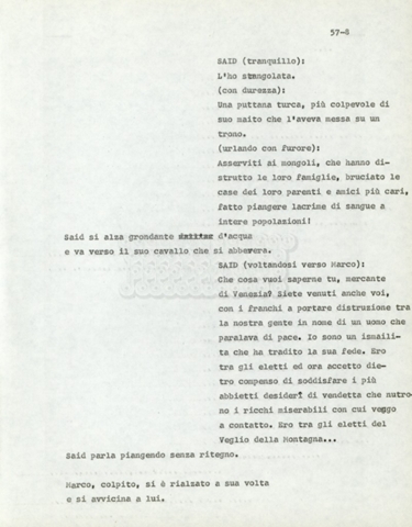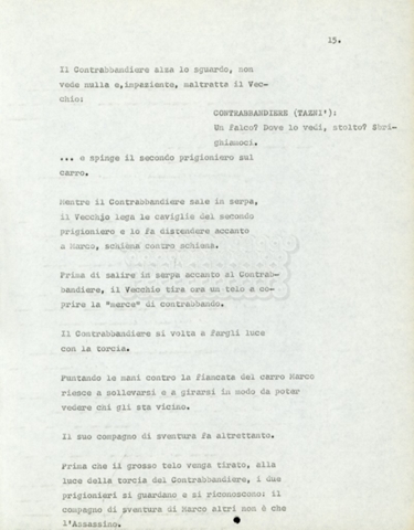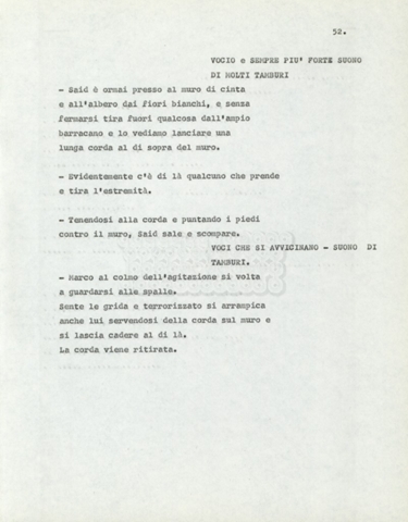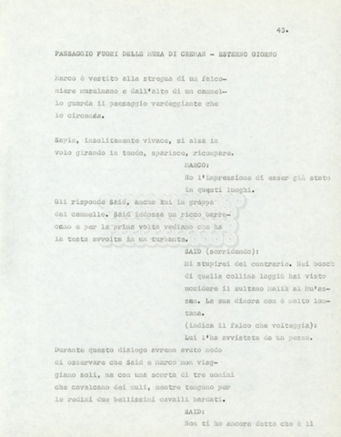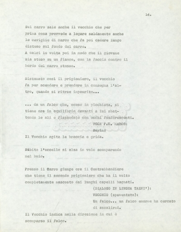 Torna alla banca dati Marco Polo – episodio 4 Documento storico Archivio Suso Cecchi d’Amico / Film e serie televisive non realizzate / Marco Polo Ambiti e contenuto Trattasi di una sceneggiatura di Suso Cecchi d’Amico. Informazioni archivistiche Cronologia: [1977 – 1978] Numero di ordinamento definitivo: 170 Numero di ordinamento provvisorio: 2.136 Descrizione fisica: volume pp. 102 Immagini digitalizzate Documenti correlati Vai alla banca dati DOCUMENTO STORICO “Marco Polo” DOCUMENTO STORICO “Episodio primo Marco Polo (prima versione)” DOCUMENTO STORICO Marco Polo – episodio 1 DOCUMENTO STORICO Marco Polo – episodio 3 DOCUMENTO STORICO Marco Polo – episodio 1 e 2