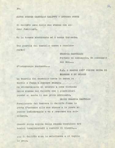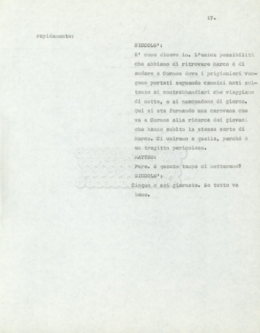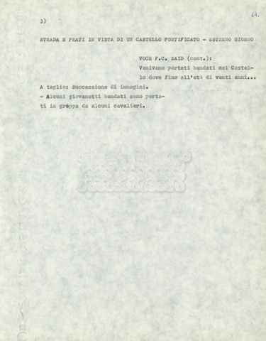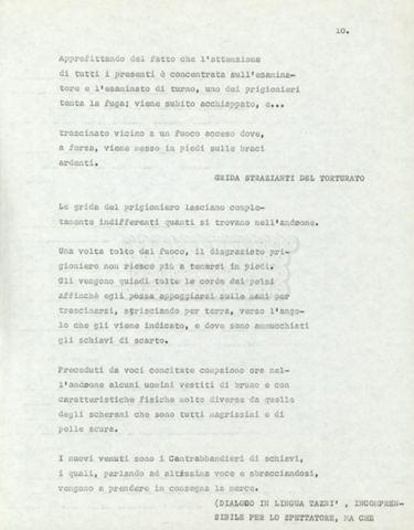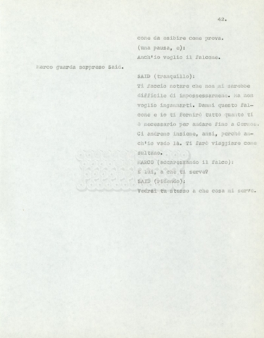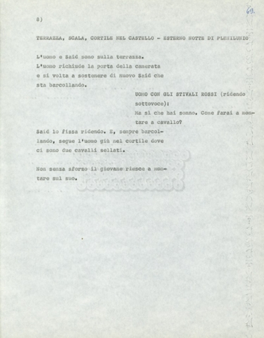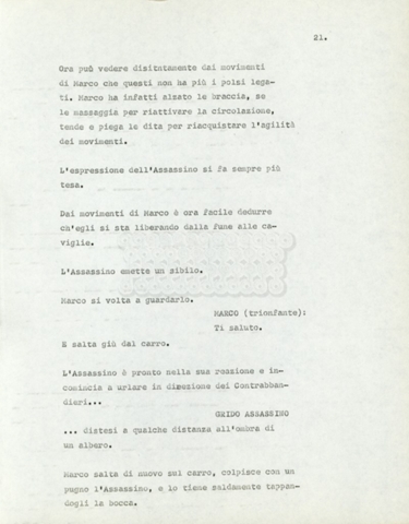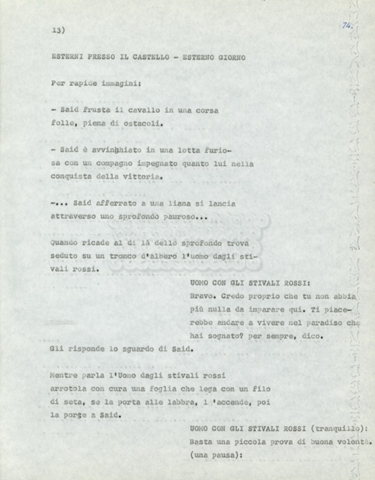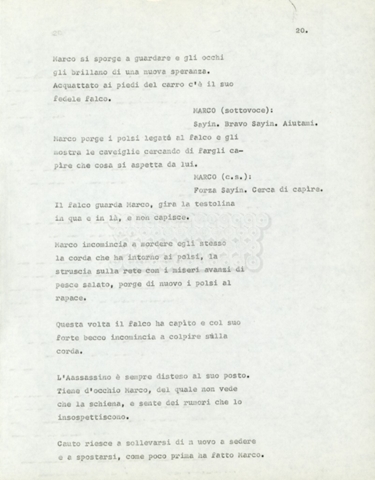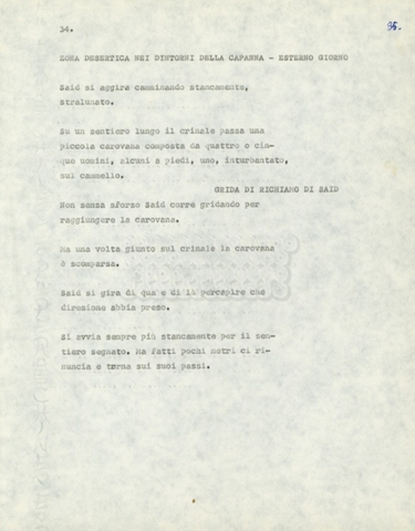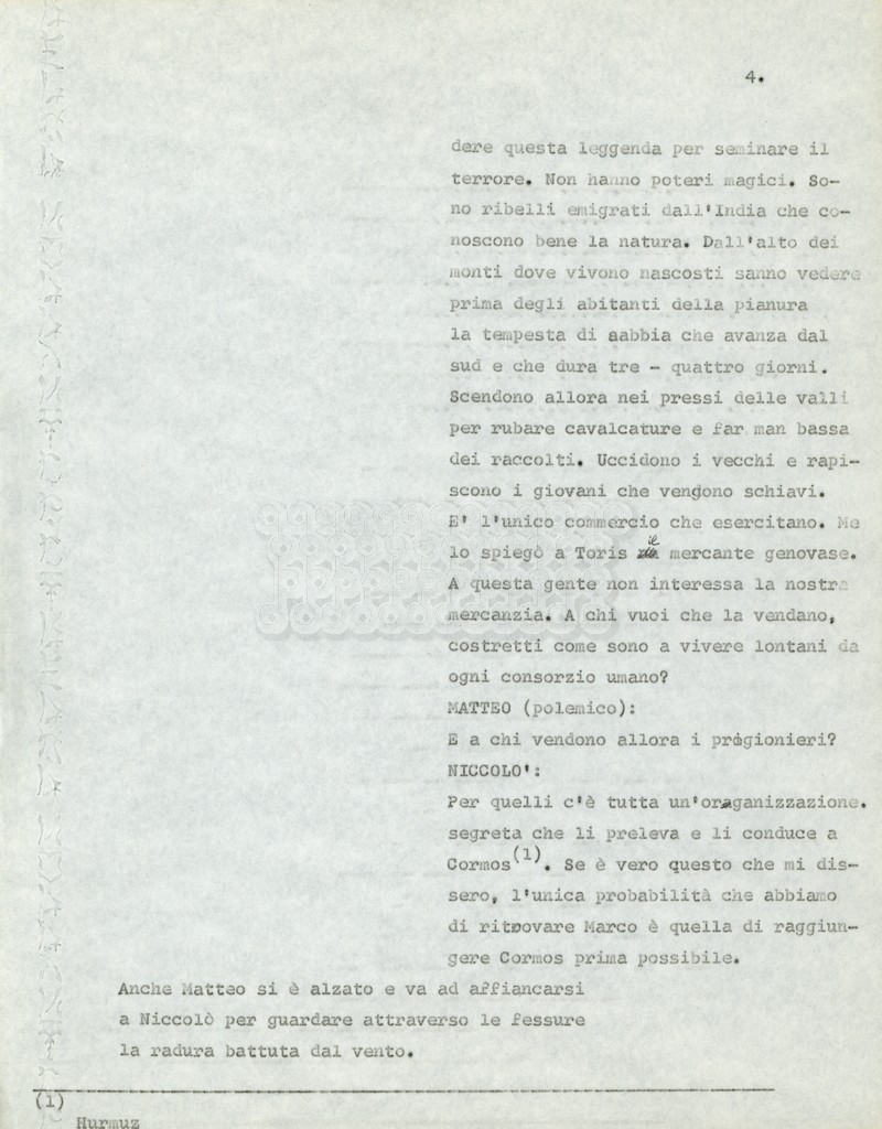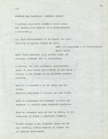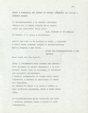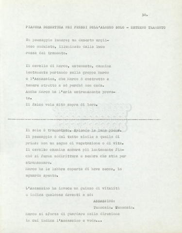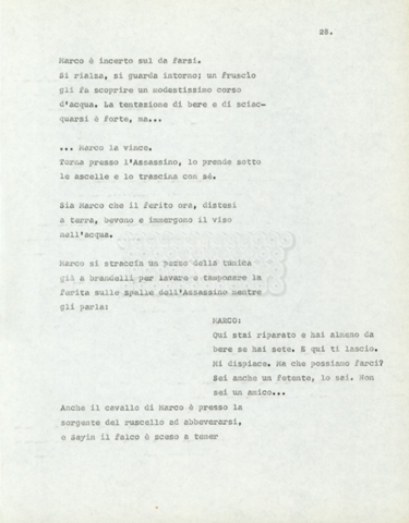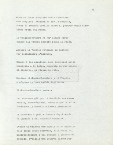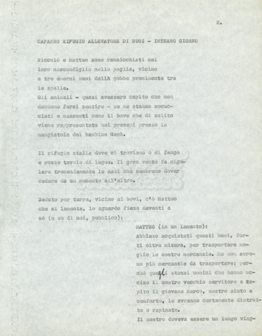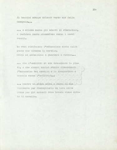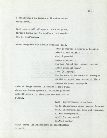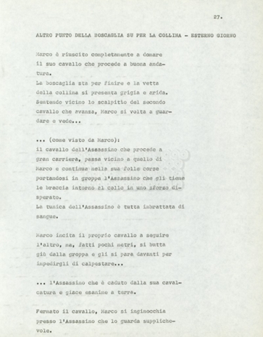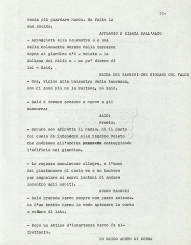 Torna alla banca dati Marco Polo – episodio 4 Documento storico Archivio Suso Cecchi d’Amico / Film e serie televisive non realizzate / Marco Polo Ambiti e contenuto Trattasi di una sceneggiatura di Suso Cecchi d’Amico. Informazioni archivistiche Cronologia: [1977 – 1978] Numero di ordinamento definitivo: 170 Numero di ordinamento provvisorio: 2.136 Descrizione fisica: volume pp. 102 Immagini digitalizzate Documenti correlati Vai alla banca dati DOCUMENTO STORICO “Marco Polo” DOCUMENTO STORICO “Episodio primo Marco Polo (prima versione)” DOCUMENTO STORICO Marco Polo – episodio 1 DOCUMENTO STORICO Marco Polo – episodio 3 DOCUMENTO STORICO Marco Polo – episodio 1 e 2