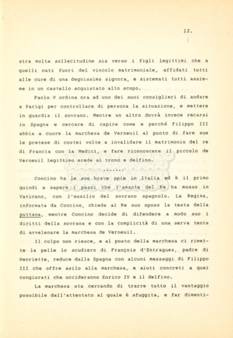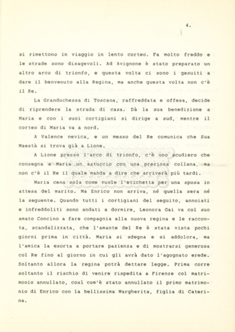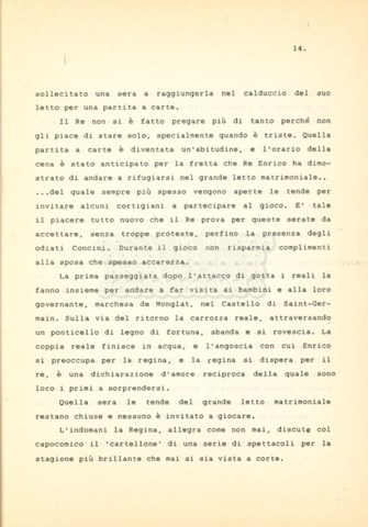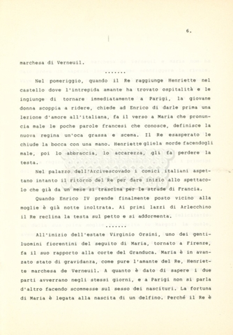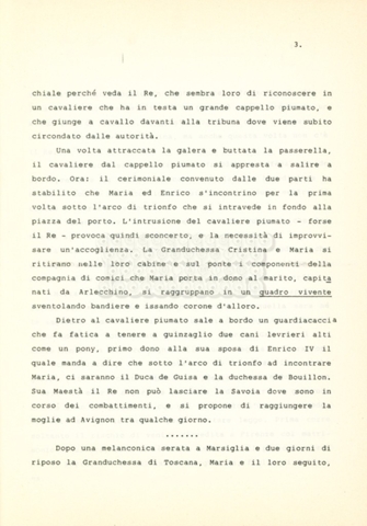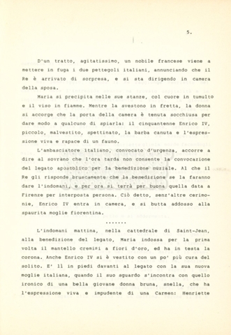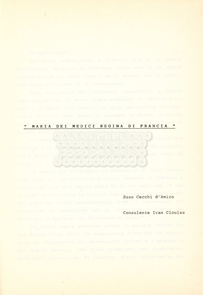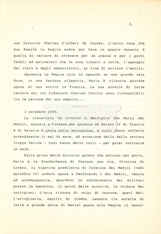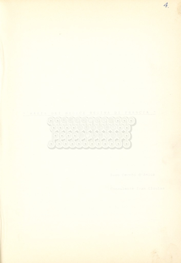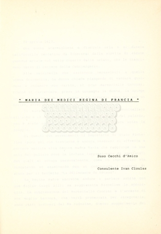 Torna alla banca dati “Maria dei Medici regina di Francia” Documento storico Archivio Suso Cecchi d’Amico / Film e serie televisive non realizzate / Storie dei Medici Ambiti e contenuto Trattasi del soggetto per il quinto episodio della serie. L’autrice è Suso Cecchi d’Amico e viene segnalata la consulenza di Ivan Coulas. Informazioni archivistiche Cronologia: [1979 – 1989] Numero di ordinamento definitivo: 180 Numero di ordinamento provvisorio: 2.151 Descrizione fisica: volume pp. 25 Immagini digitalizzate Documenti correlati Vai alla banca dati DOCUMENTO STORICO “Storie dei Medici – primo episodio” DOCUMENTO STORICO “Lorenzo dei Medici detto il Magnifico” DOCUMENTO STORICO “Leone X e Clemente VII, papi dei Medici” DOCUMENTO STORICO “Cosimo I dei Medici” DOCUMENTO STORICO “Cosimo Medici” DOCUMENTO STORICO “Caterina dei Medici regina di Francia” DOCUMENTO STORICO “Cosimo III e gli ultimi Medici”