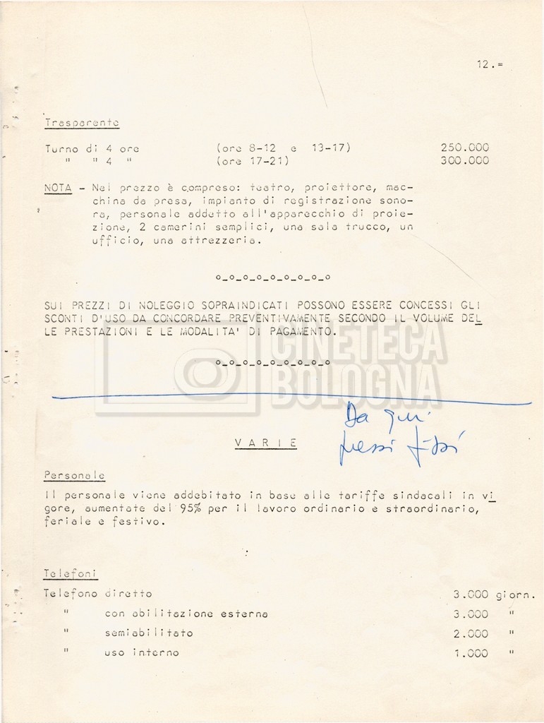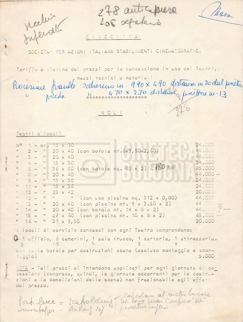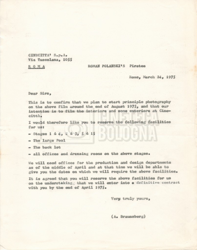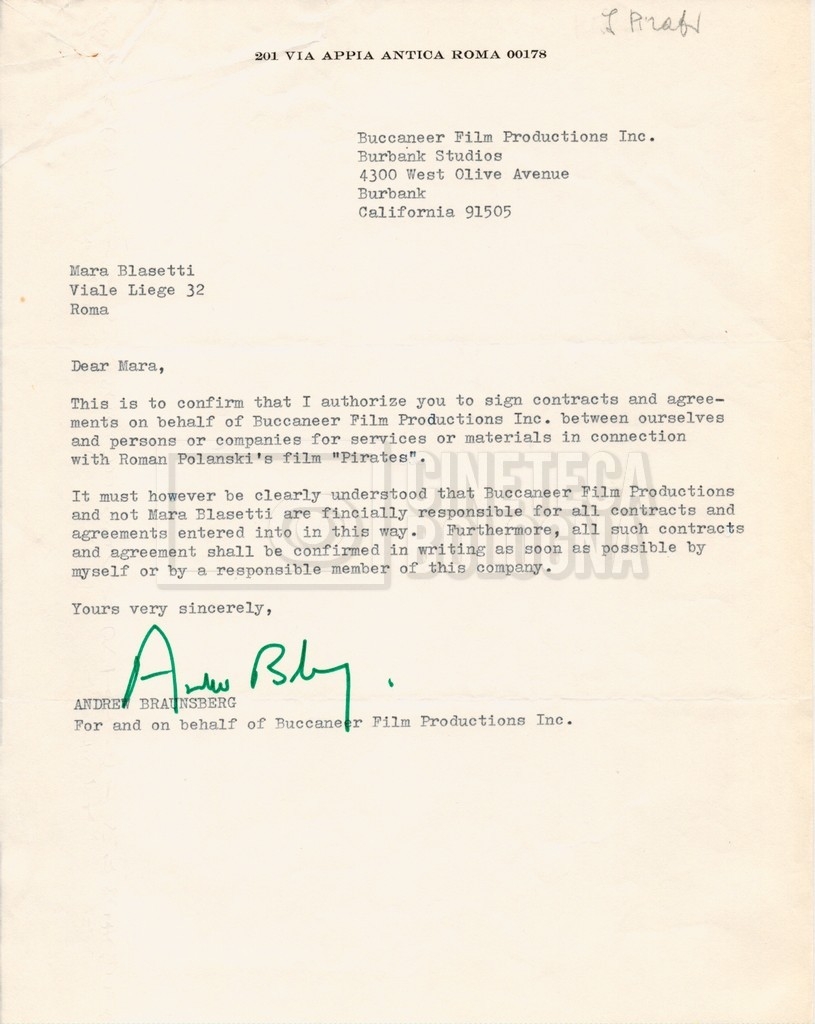 – Corrispondenza con Andrew Braunsberg della ‘Buccaneer Film Productions Inc.’, riguardante le riprese presso ‘Cinecittà’ e diverse questioni di produzione, tra cui si segnala una lettera di delega a Mara Blasetti per la firma di contratti e accordi;