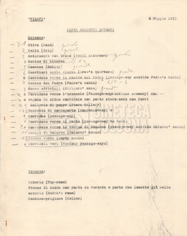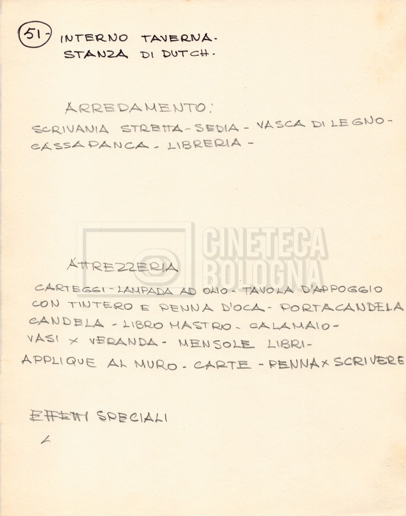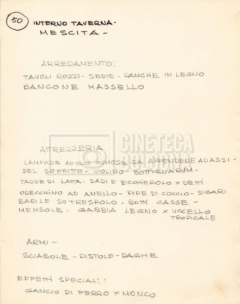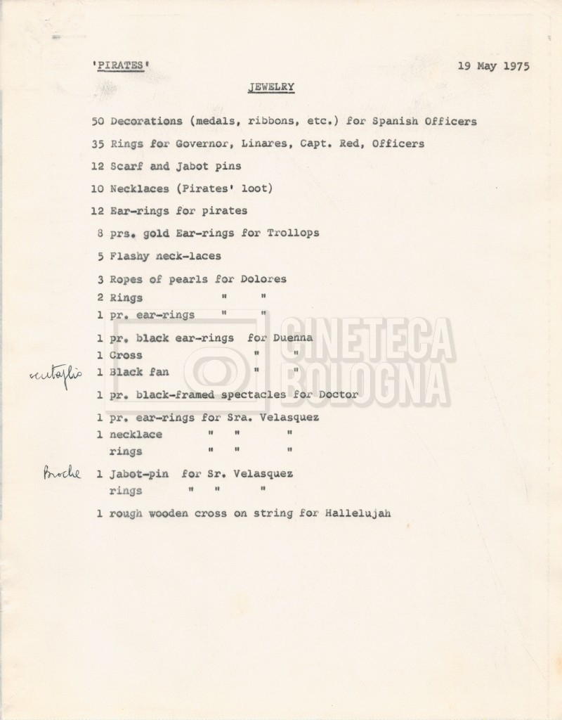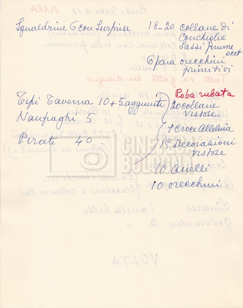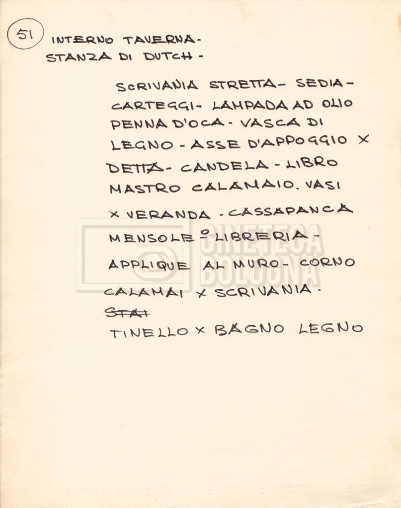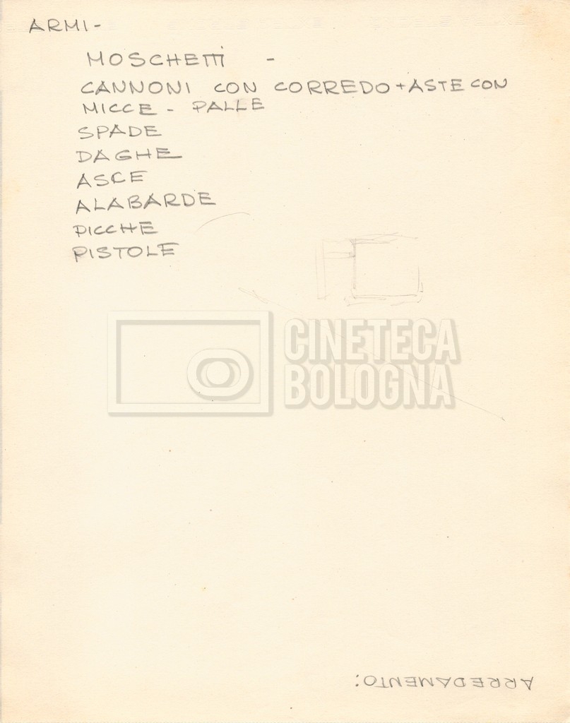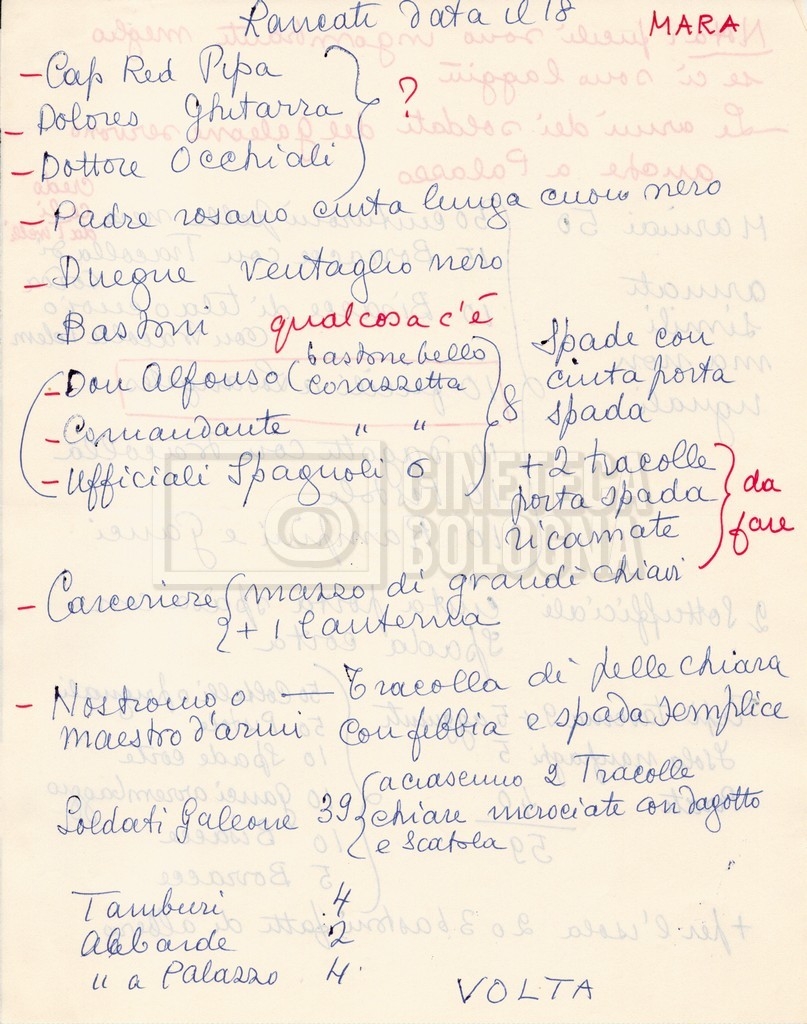 – Diverse liste di ambienti interni ed esterni, costumi, oggettistica, armi e dal cast, datt. e mss.;
