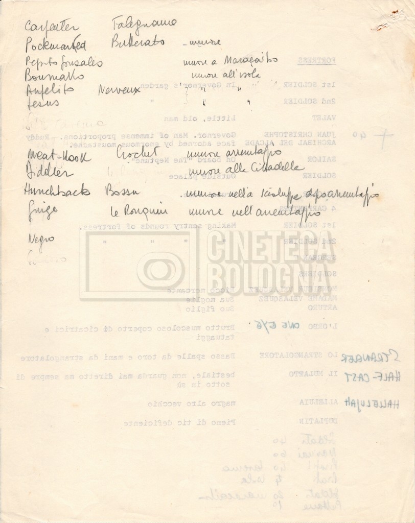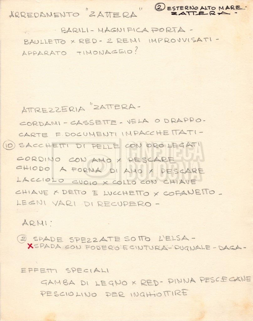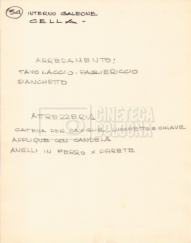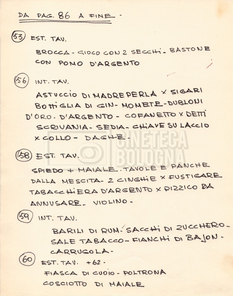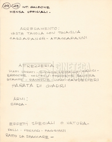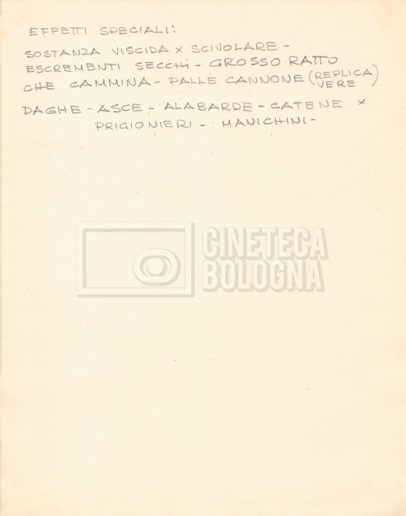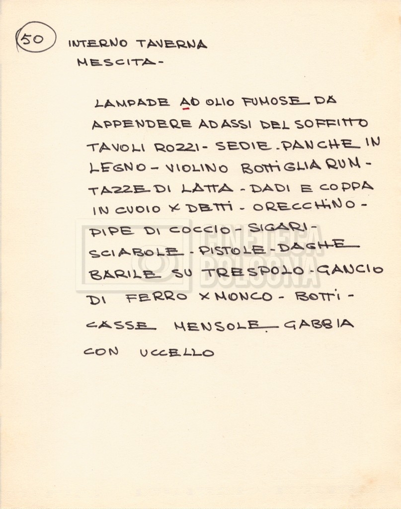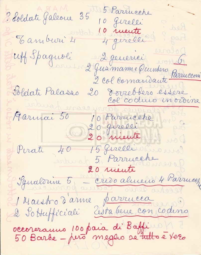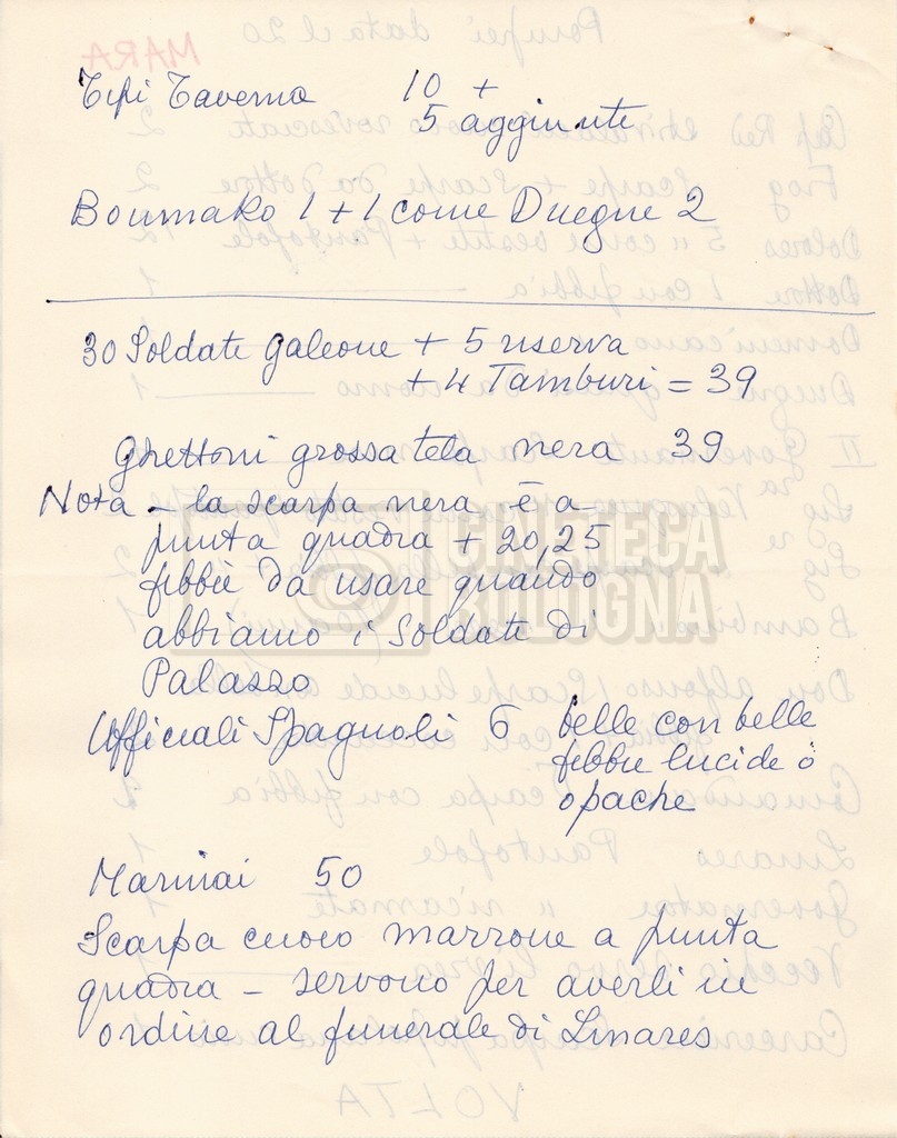 – Diverse liste di ambienti interni ed esterni, costumi, oggettistica, armi e dal cast, datt. e mss.;