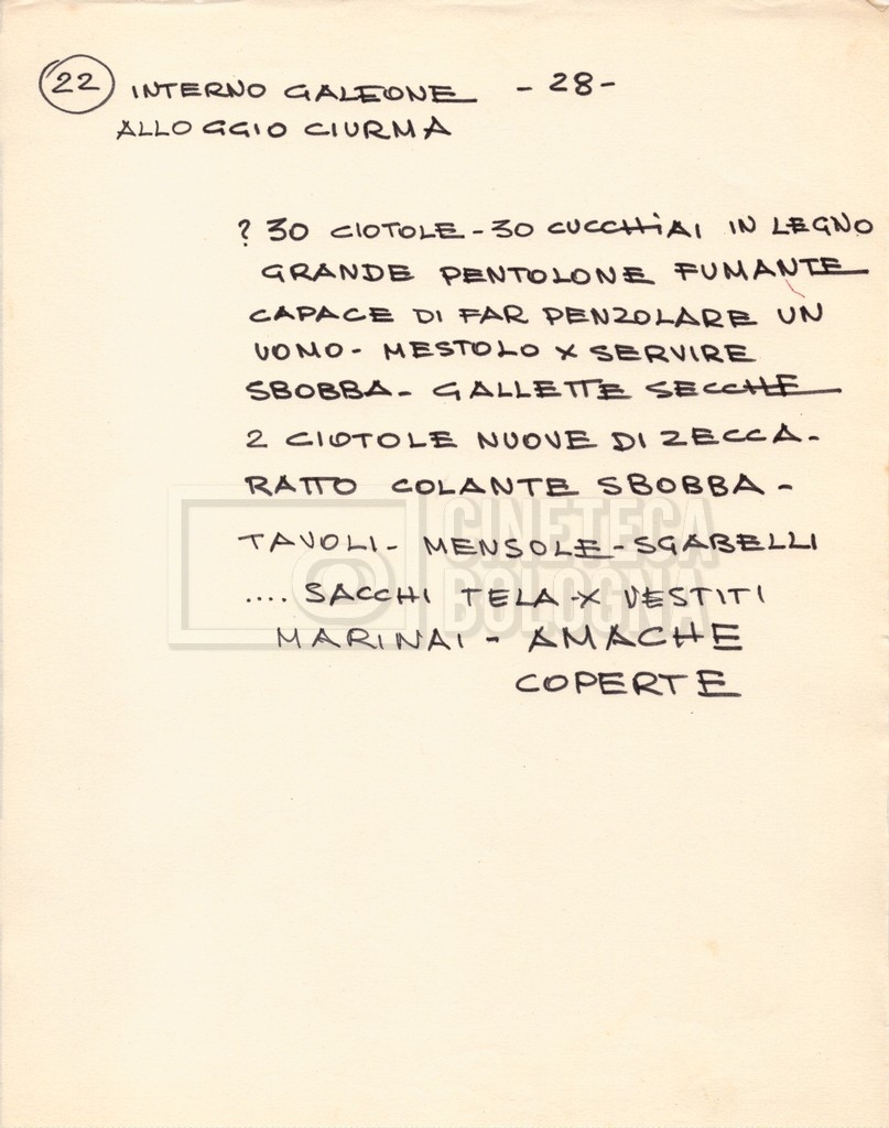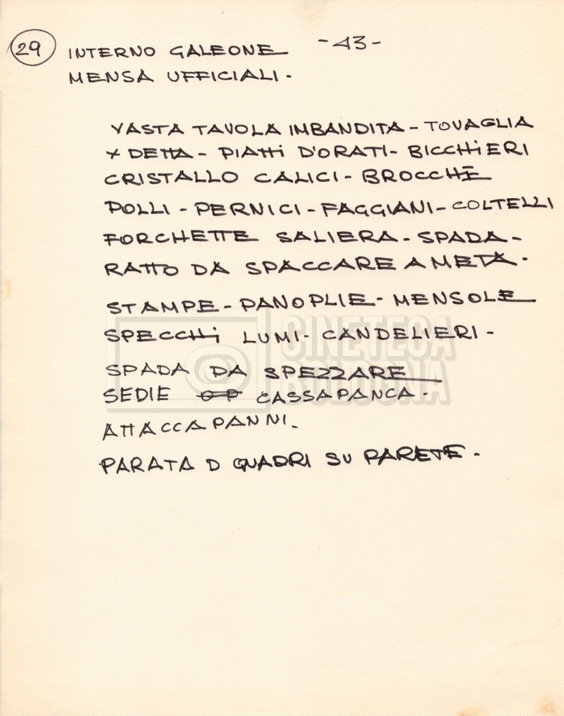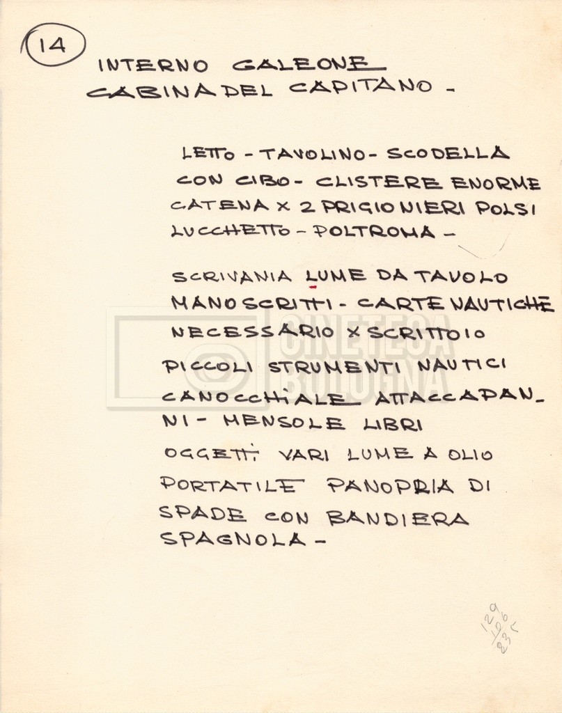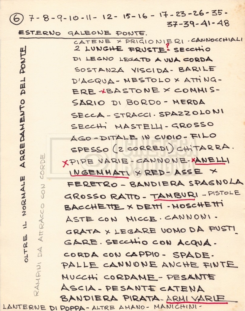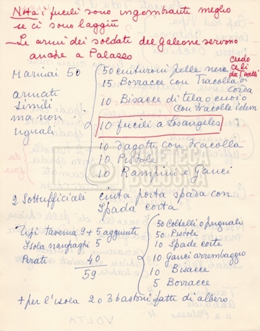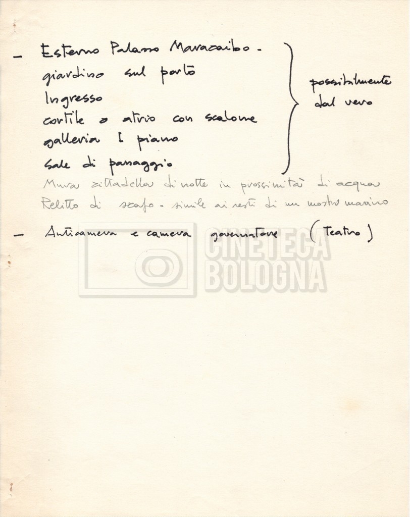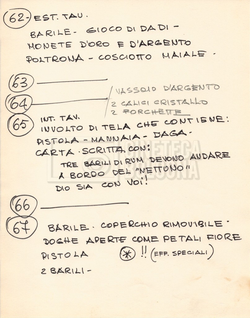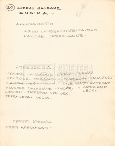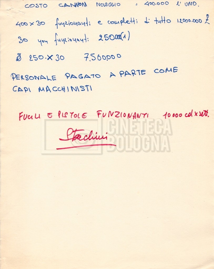 – Diverse liste di ambienti interni ed esterni, costumi, oggettistica, armi e dal cast, datt. e mss.;