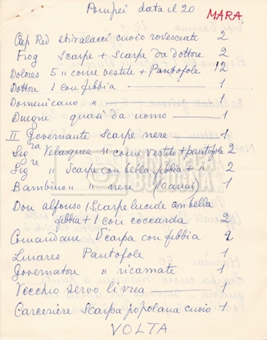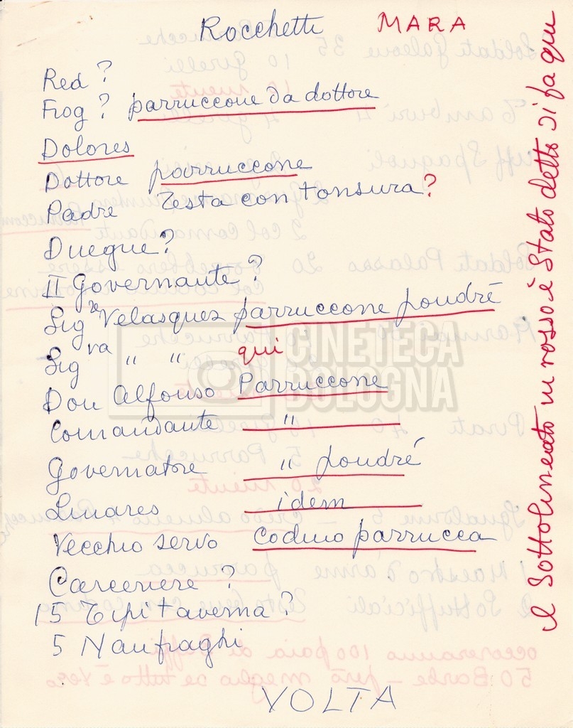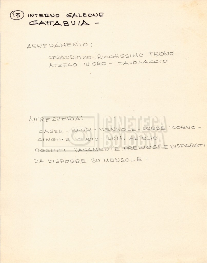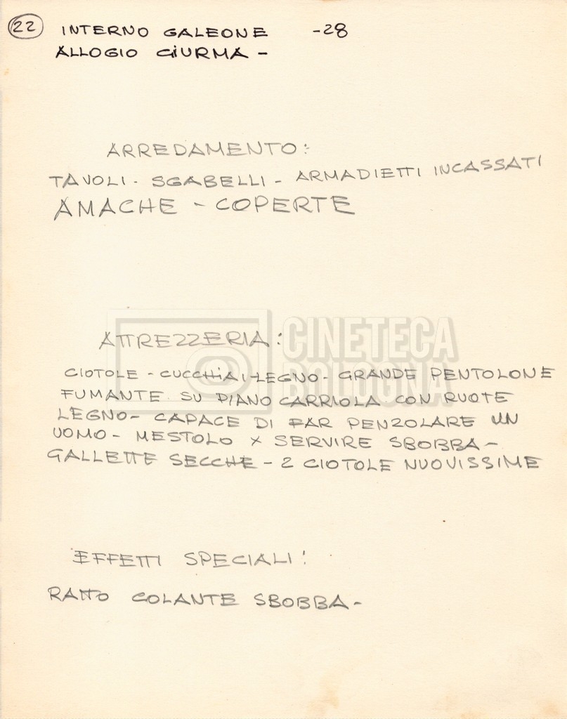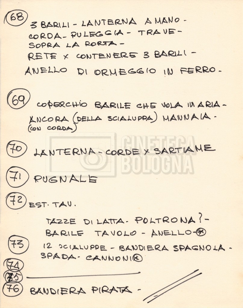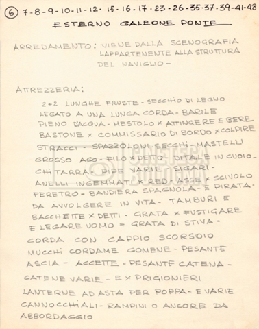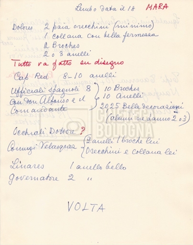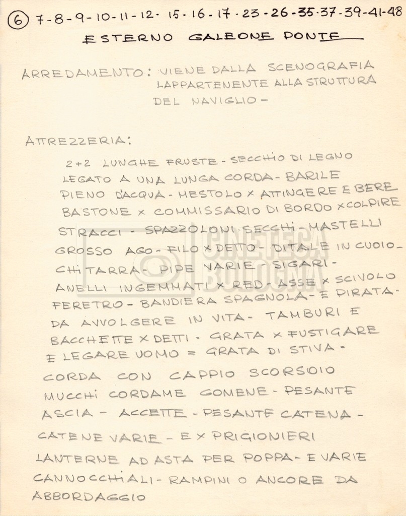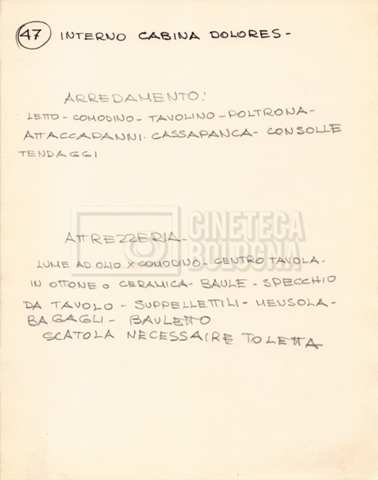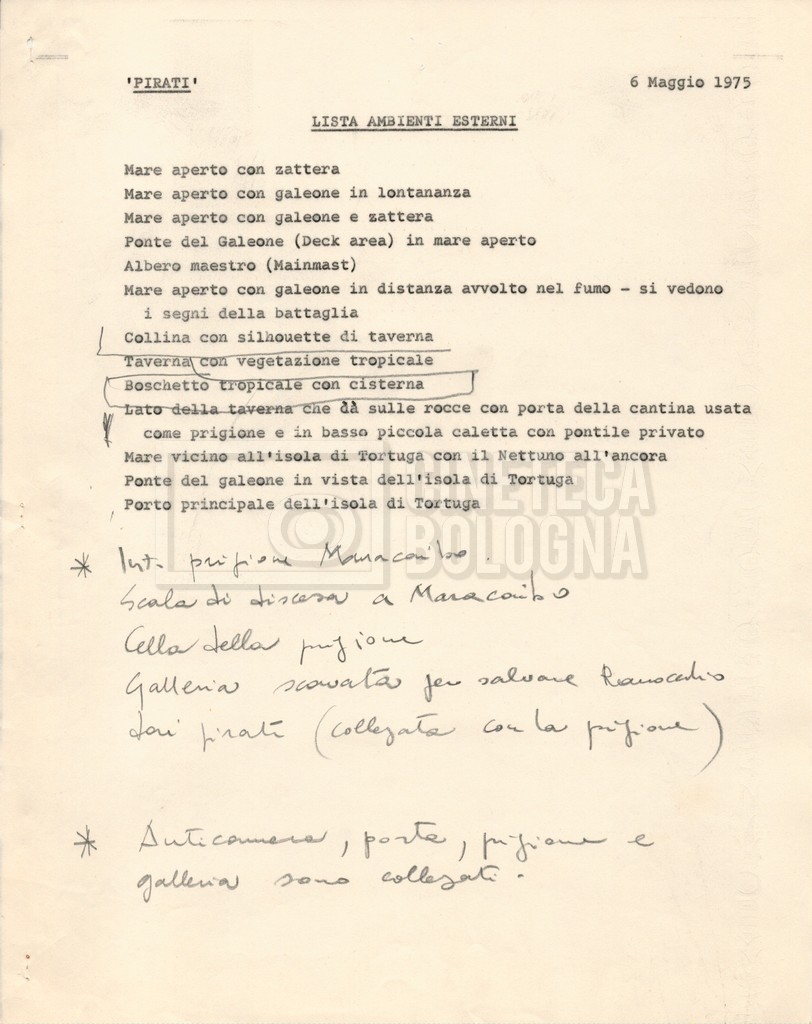 – Diverse liste di ambienti interni ed esterni, costumi, oggettistica, armi e dal cast, datt. e mss.;
