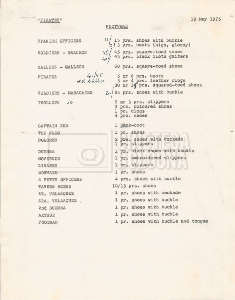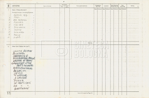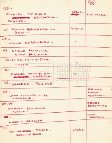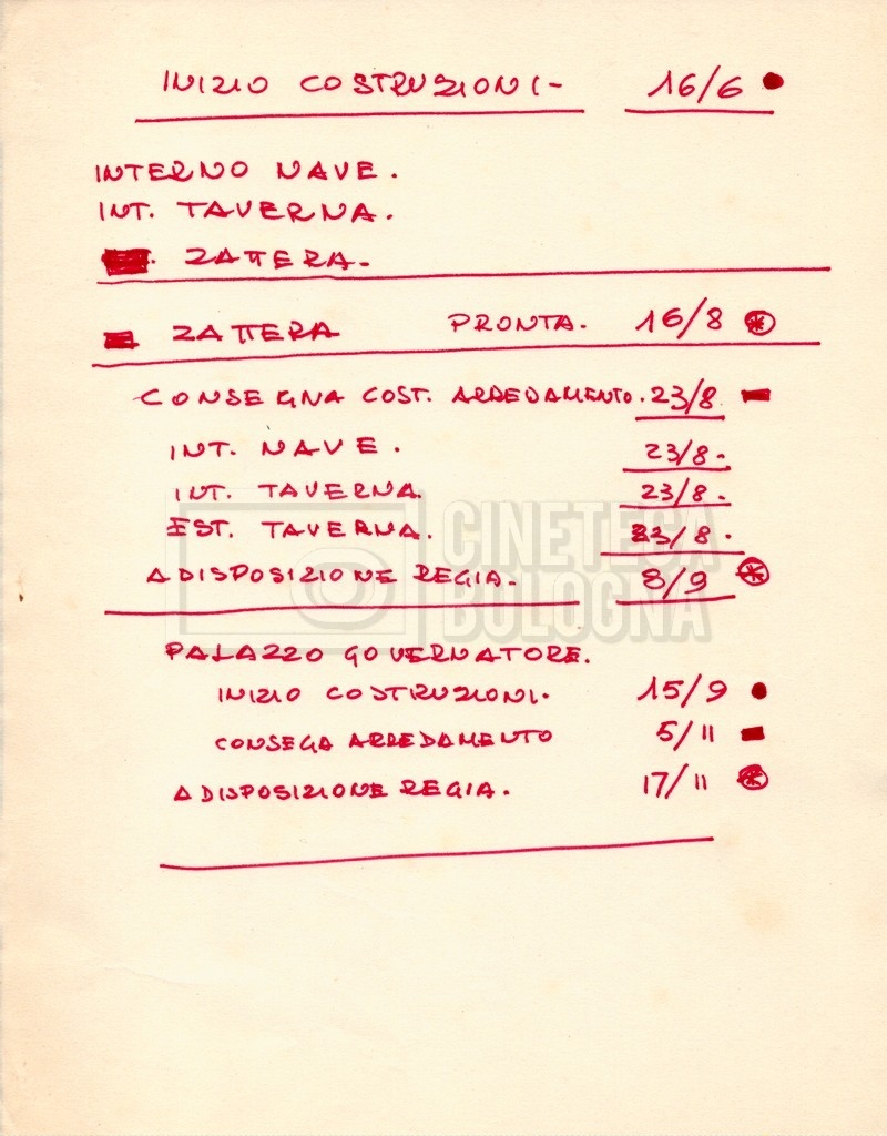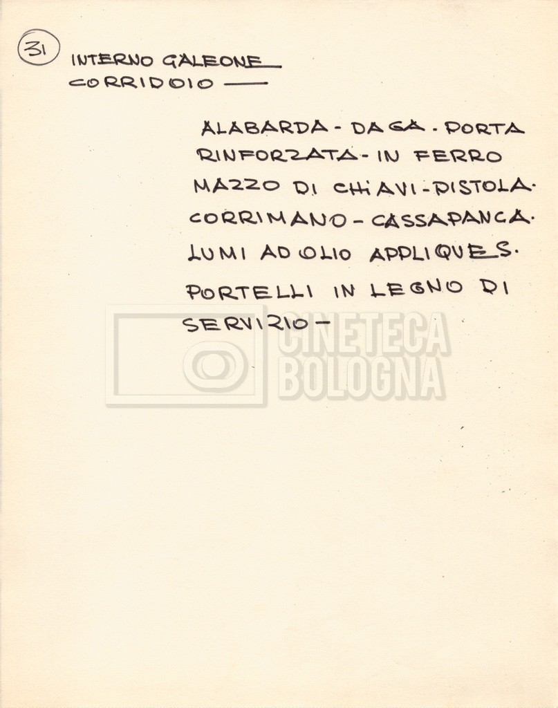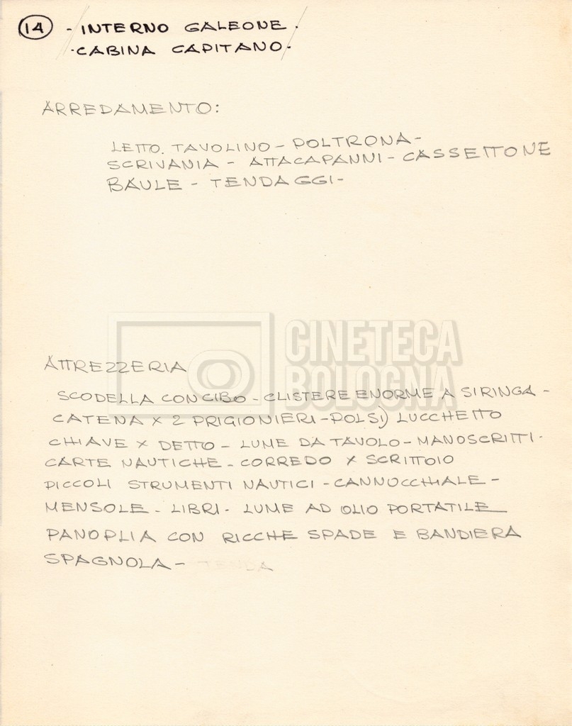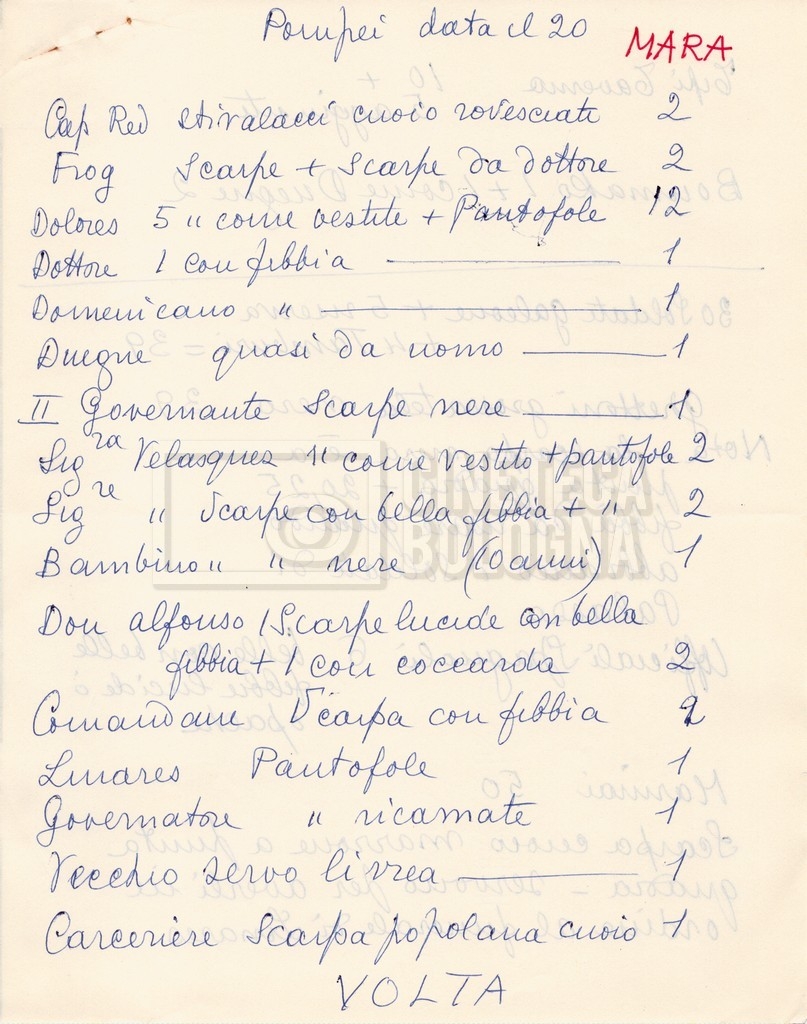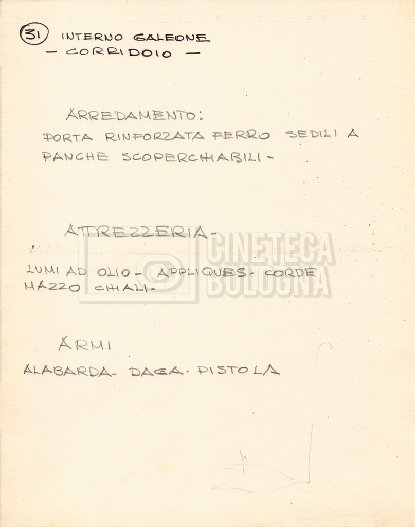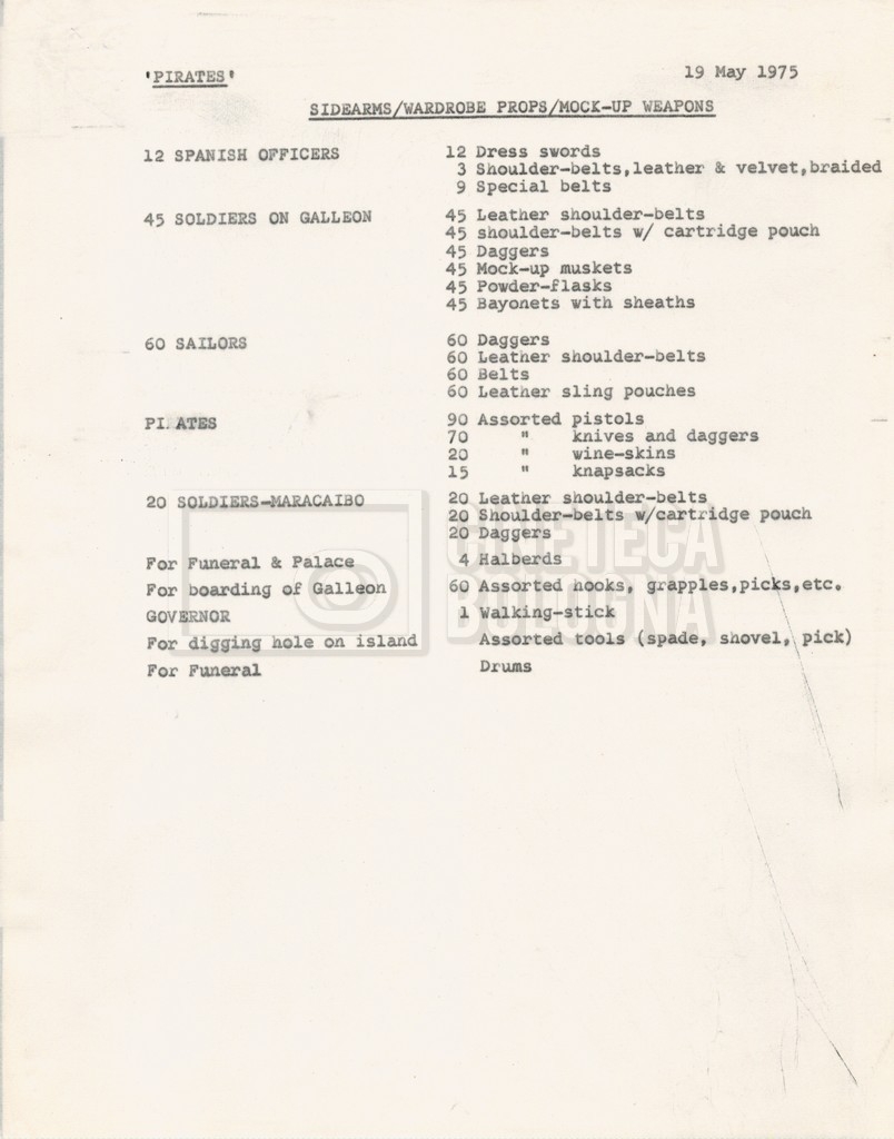 – Diverse liste di ambienti interni ed esterni, costumi, oggettistica, armi e dal cast, datt. e mss.;